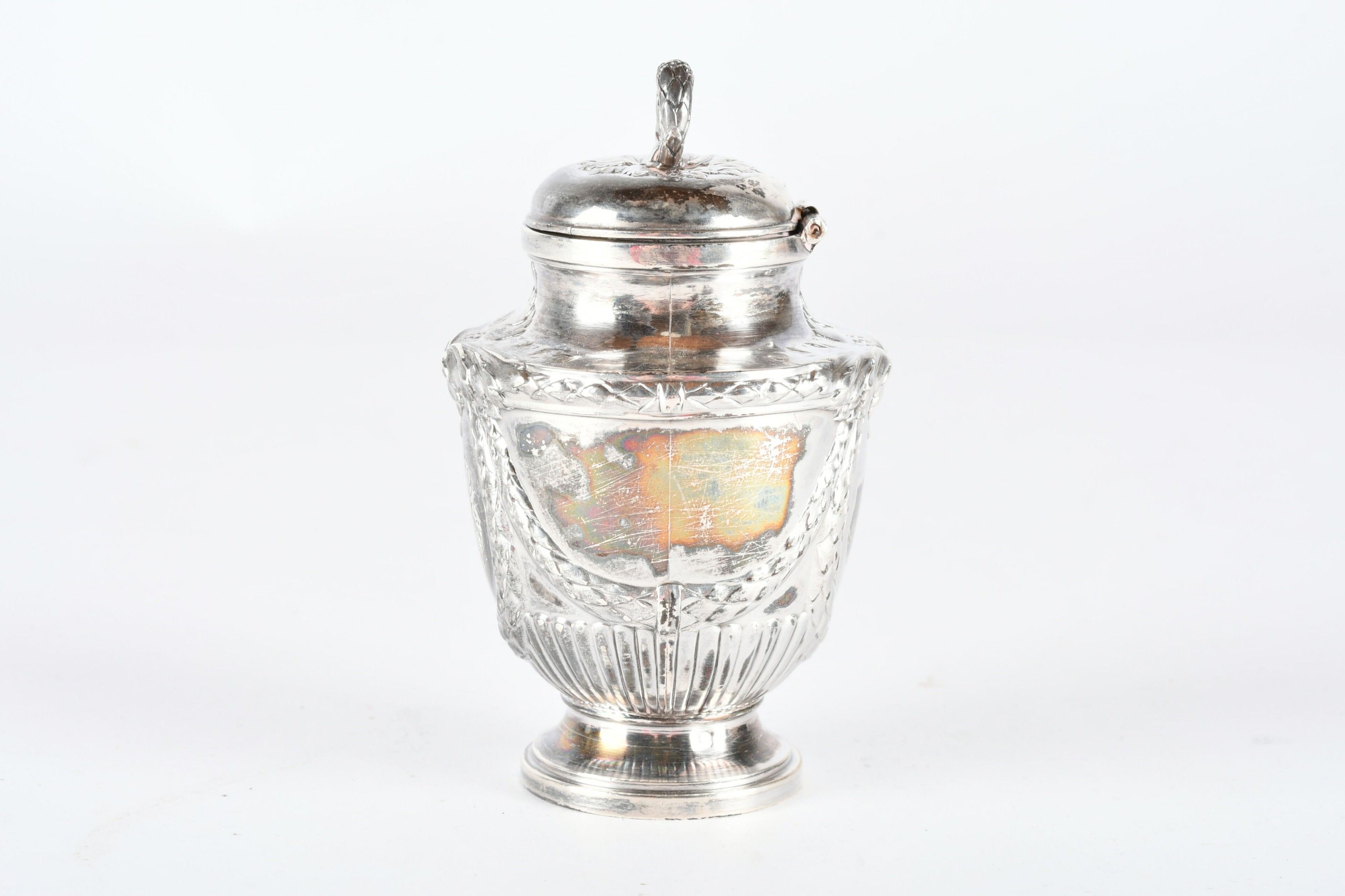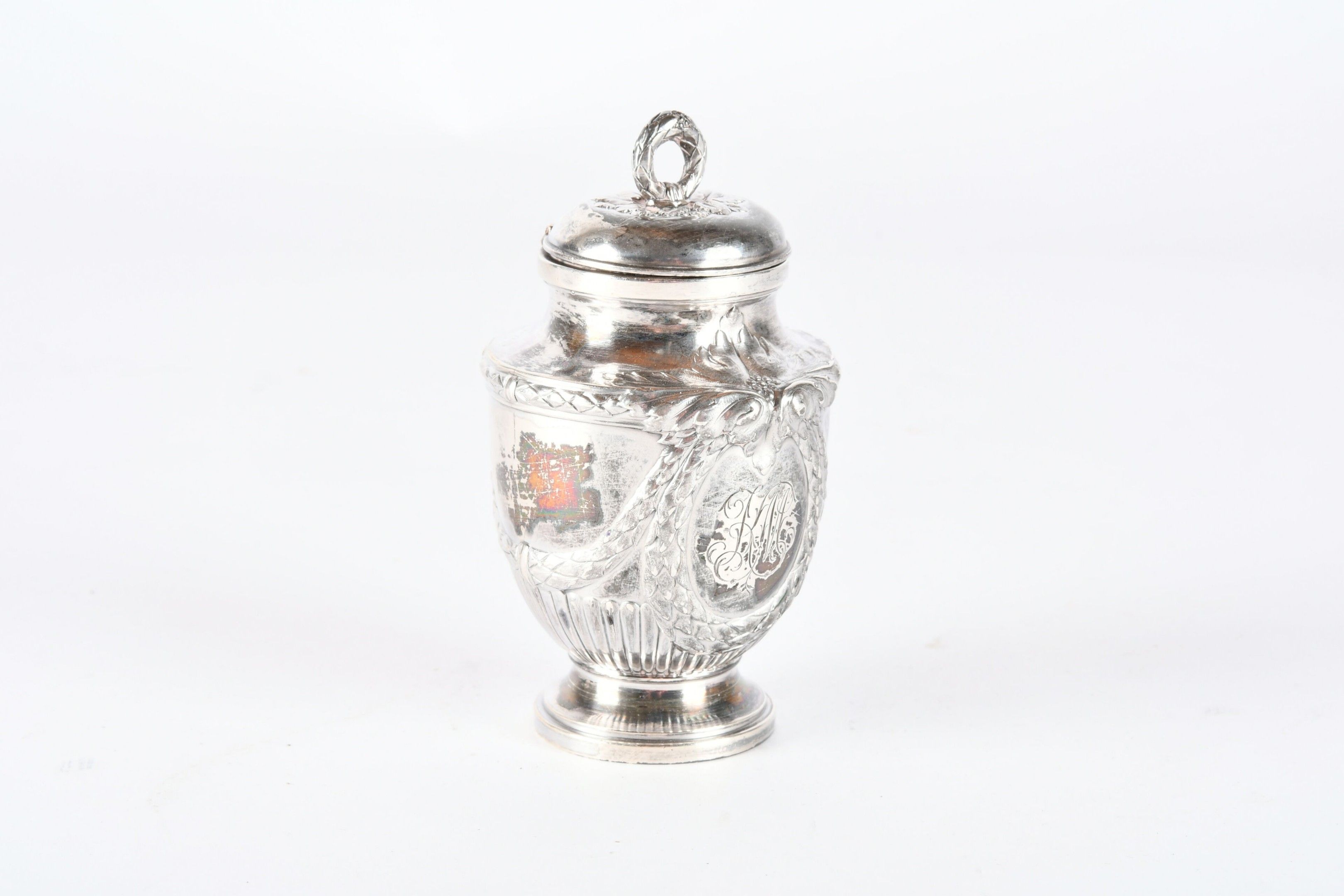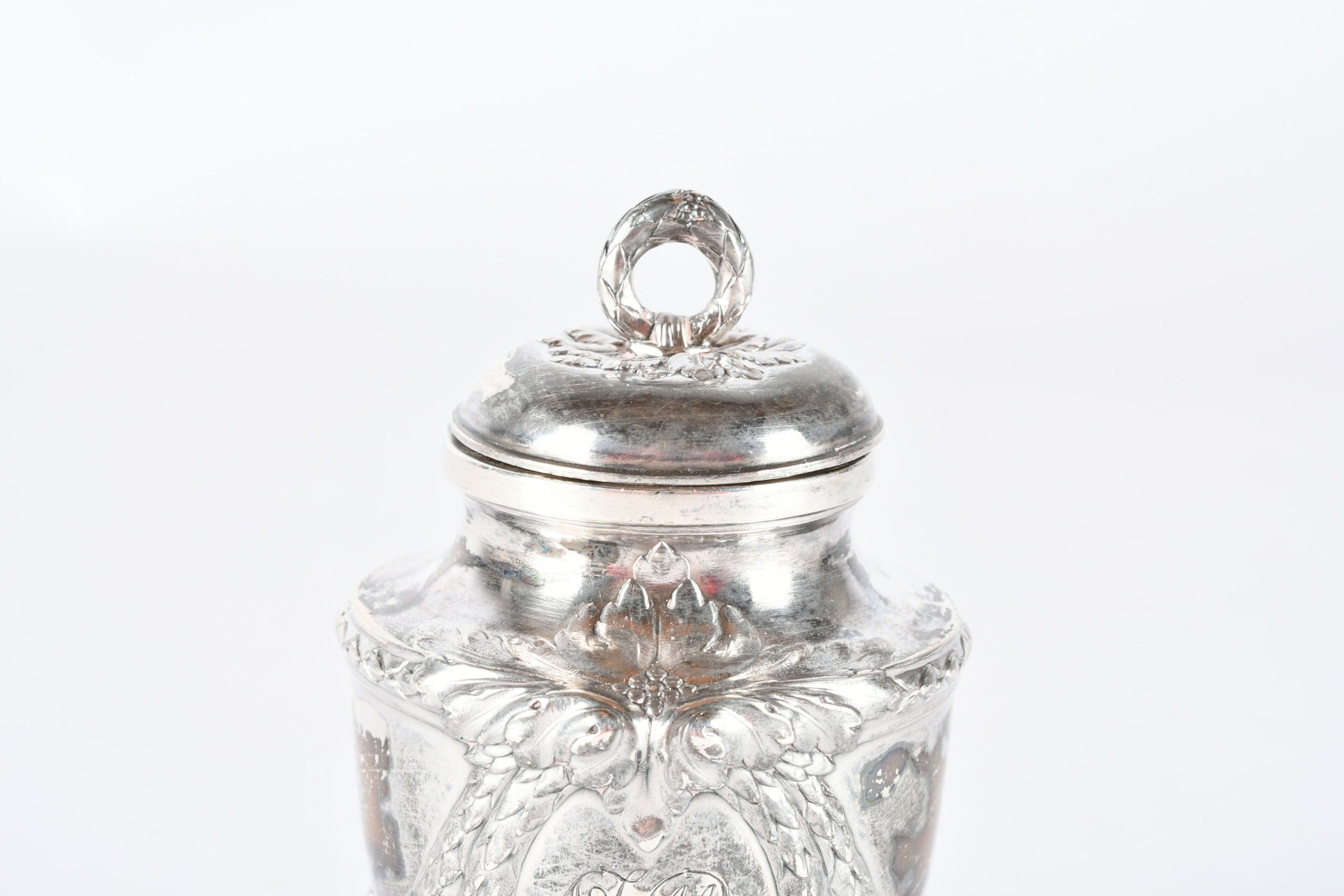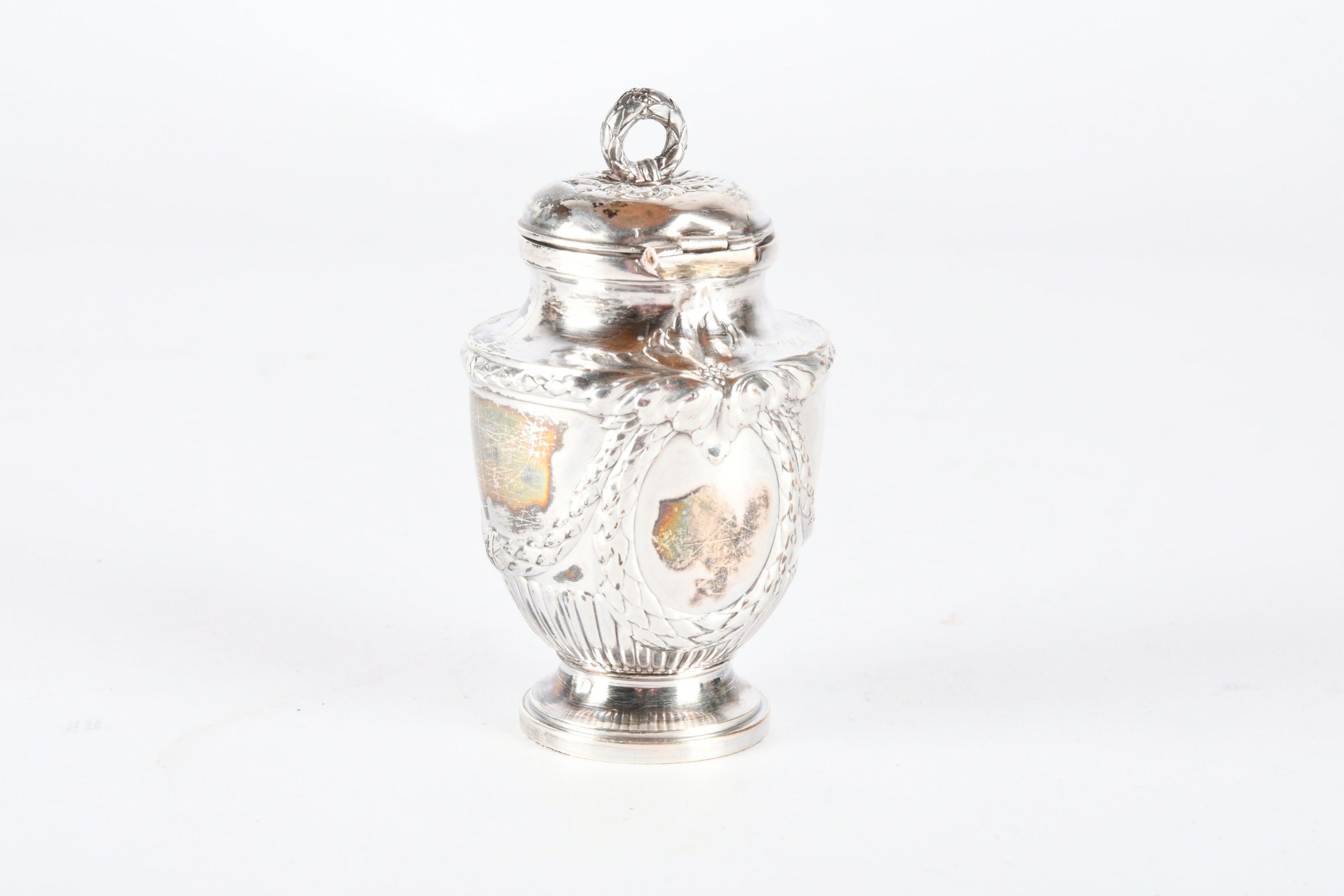 RISLER and CARRE Paris. Silver inkwell in the form of a covered urn, engraved with a monogram. Signed. H. 10 cm - Weight: 95 g. (Drilled for fixing on a stand)