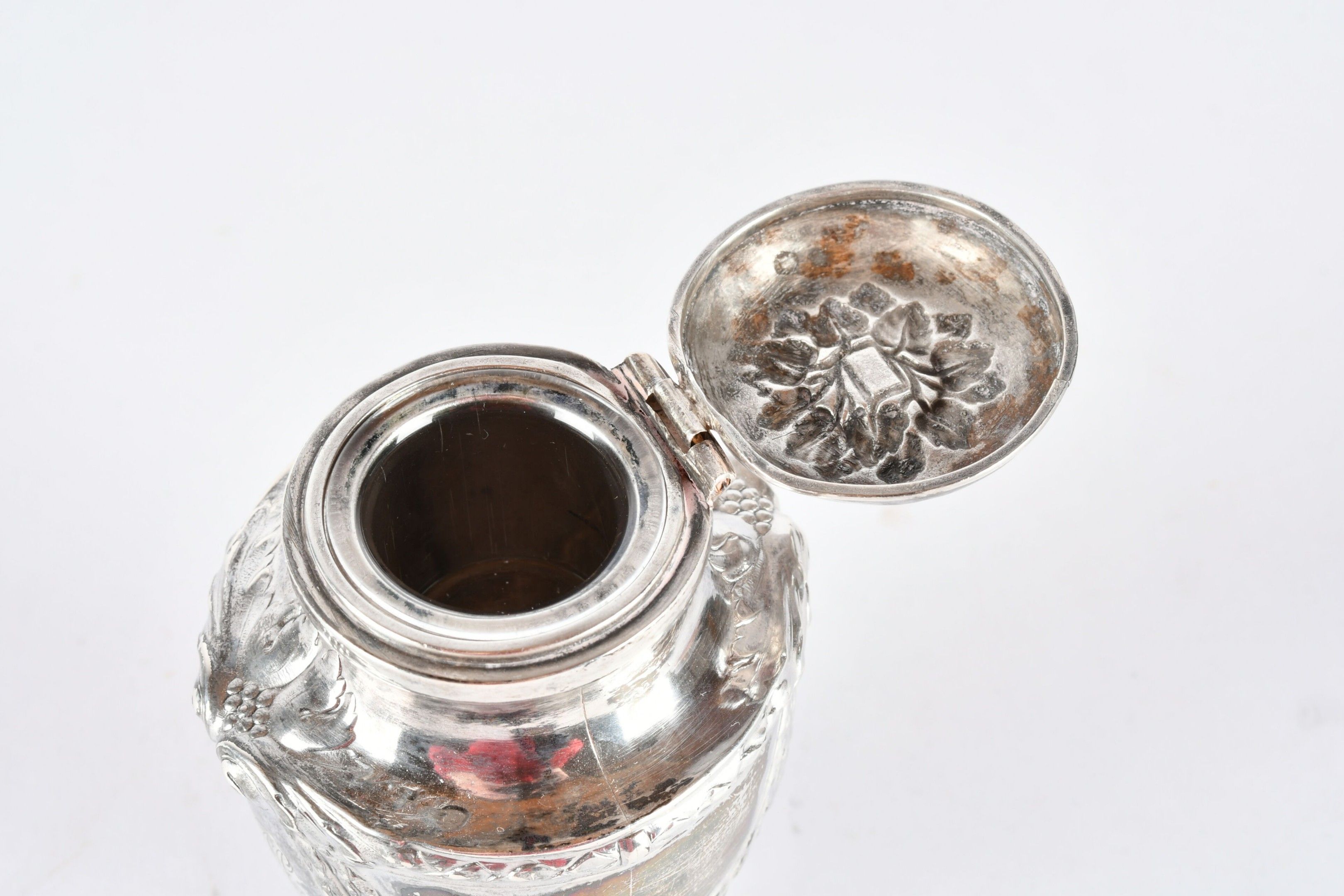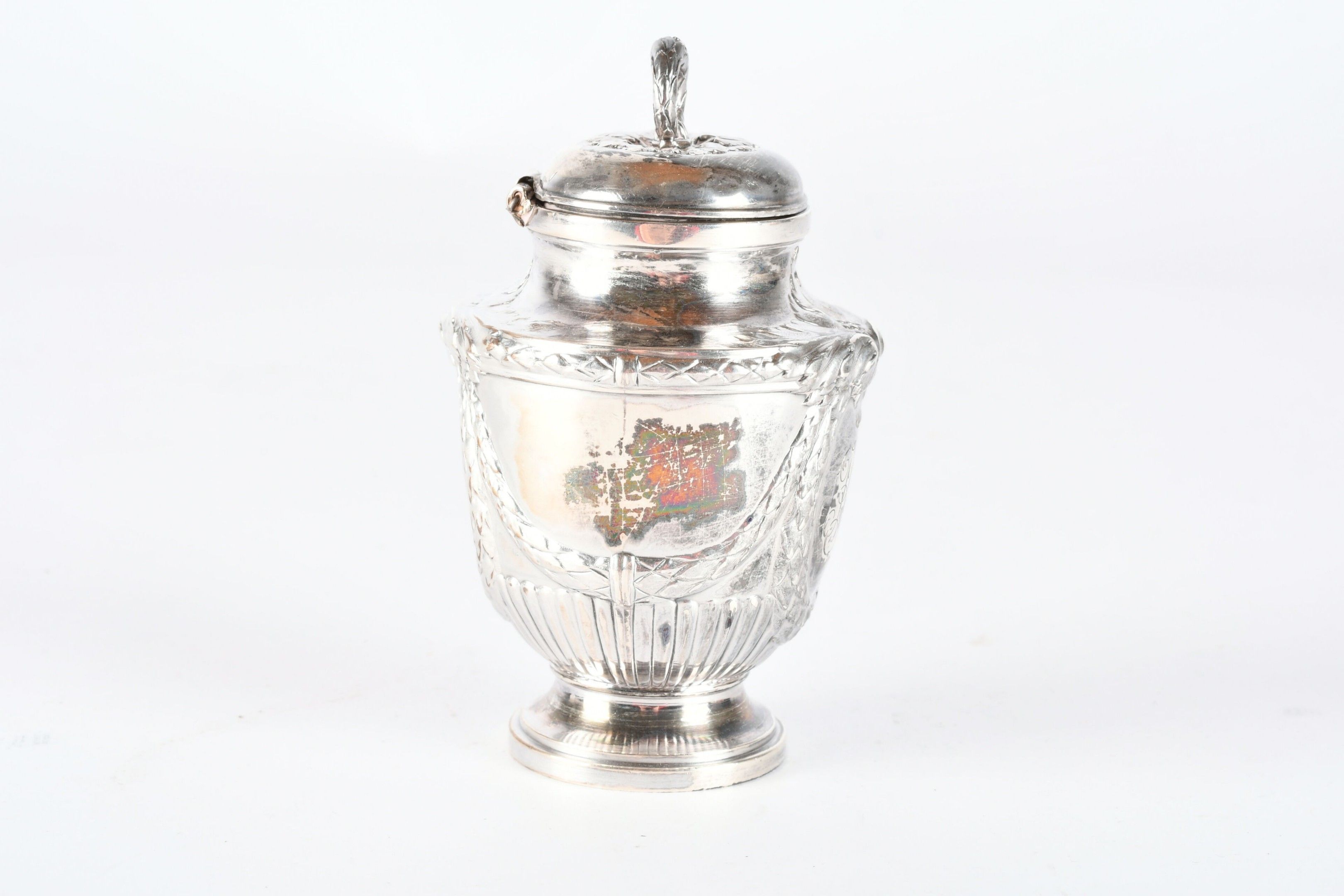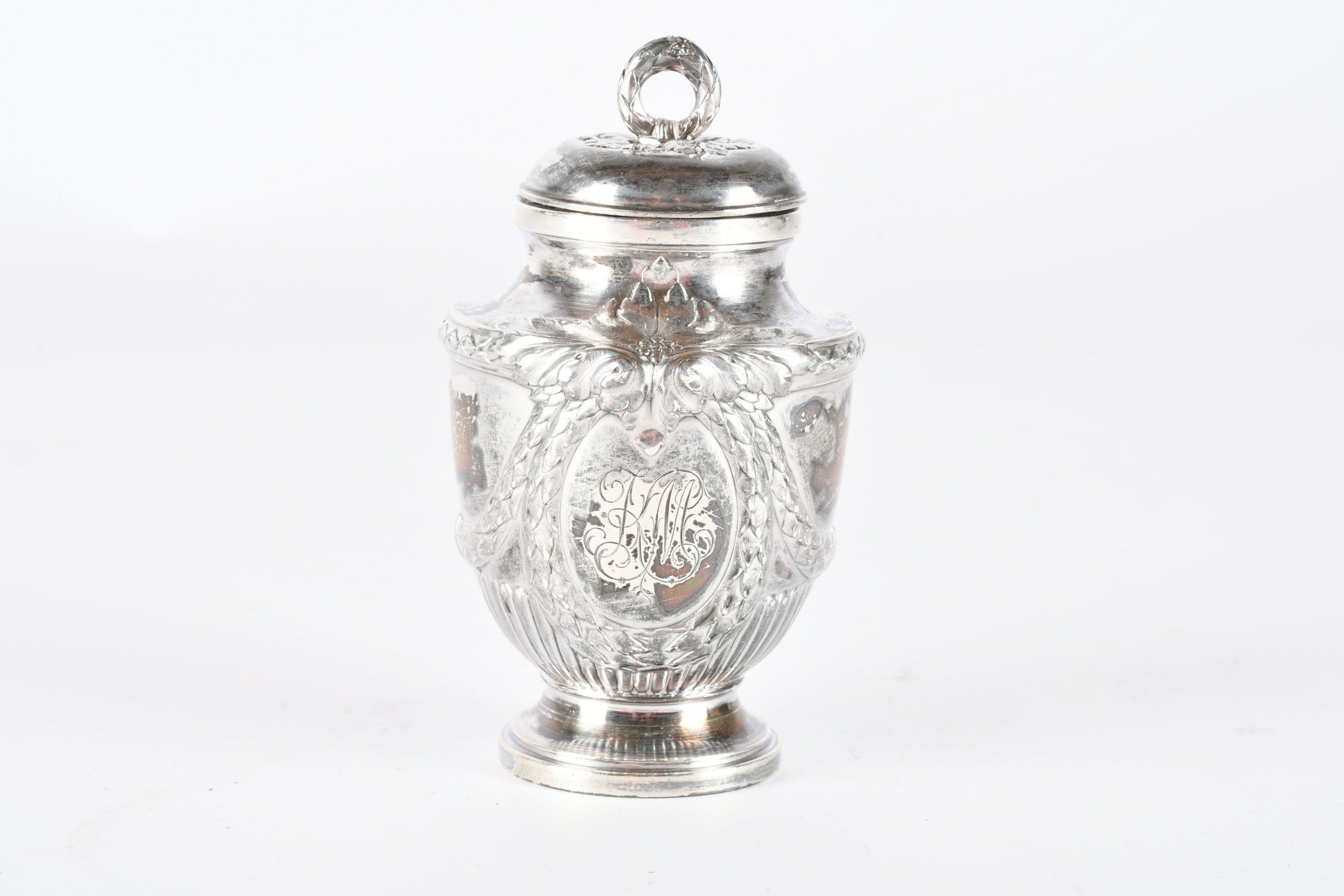 RISLER and CARRE Paris. Silver inkwell in the form of a covered urn, engraved with a monogram. Signed. H. 10 cm - Weight: 95 g. (Drilled for fixing on a stand)