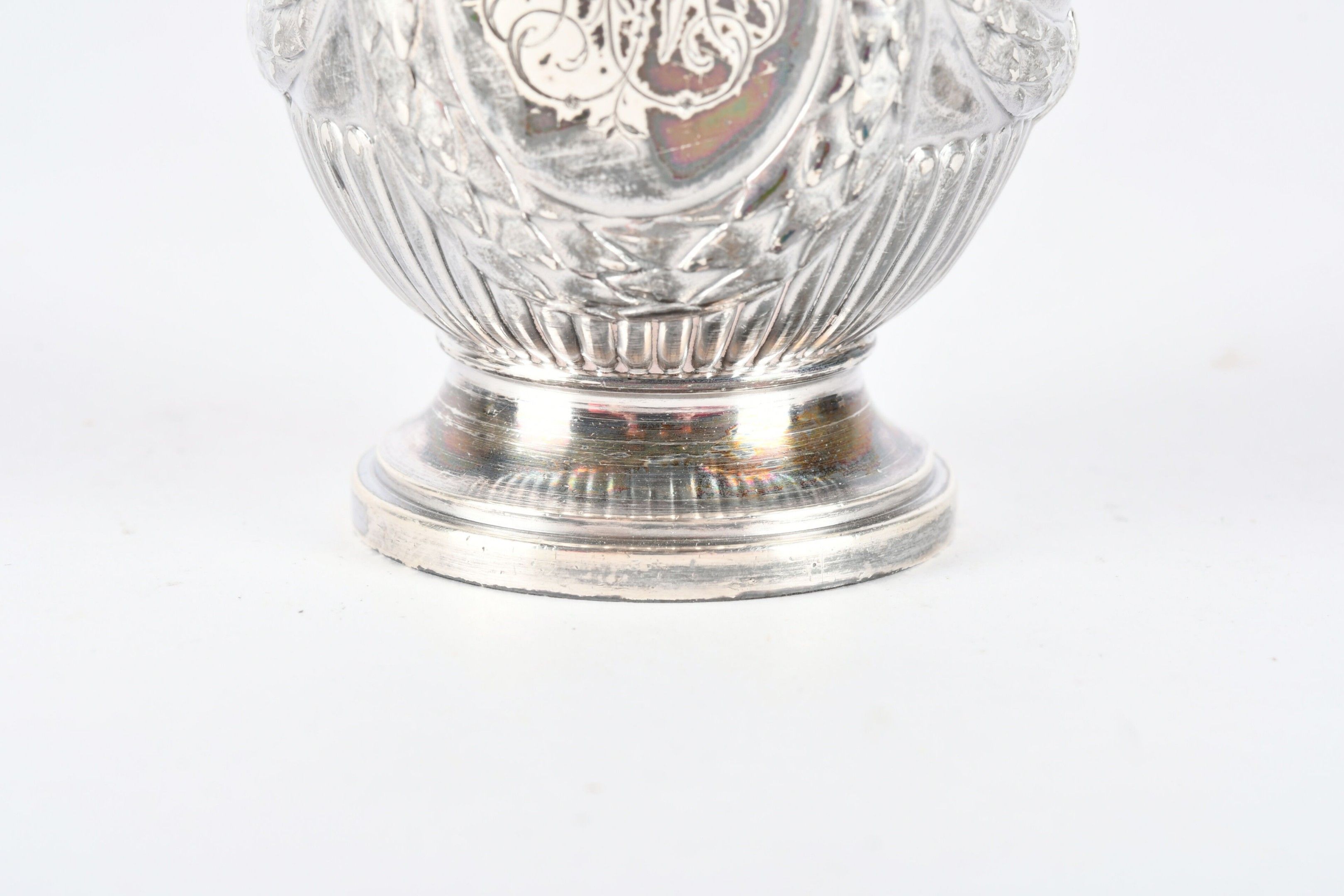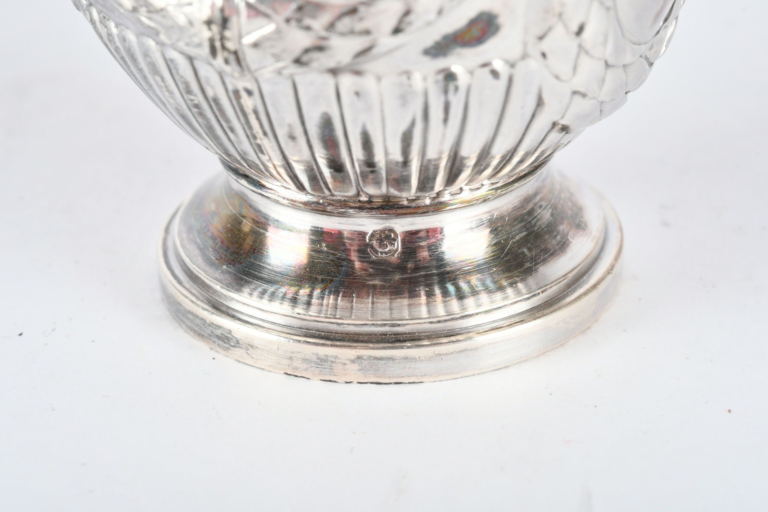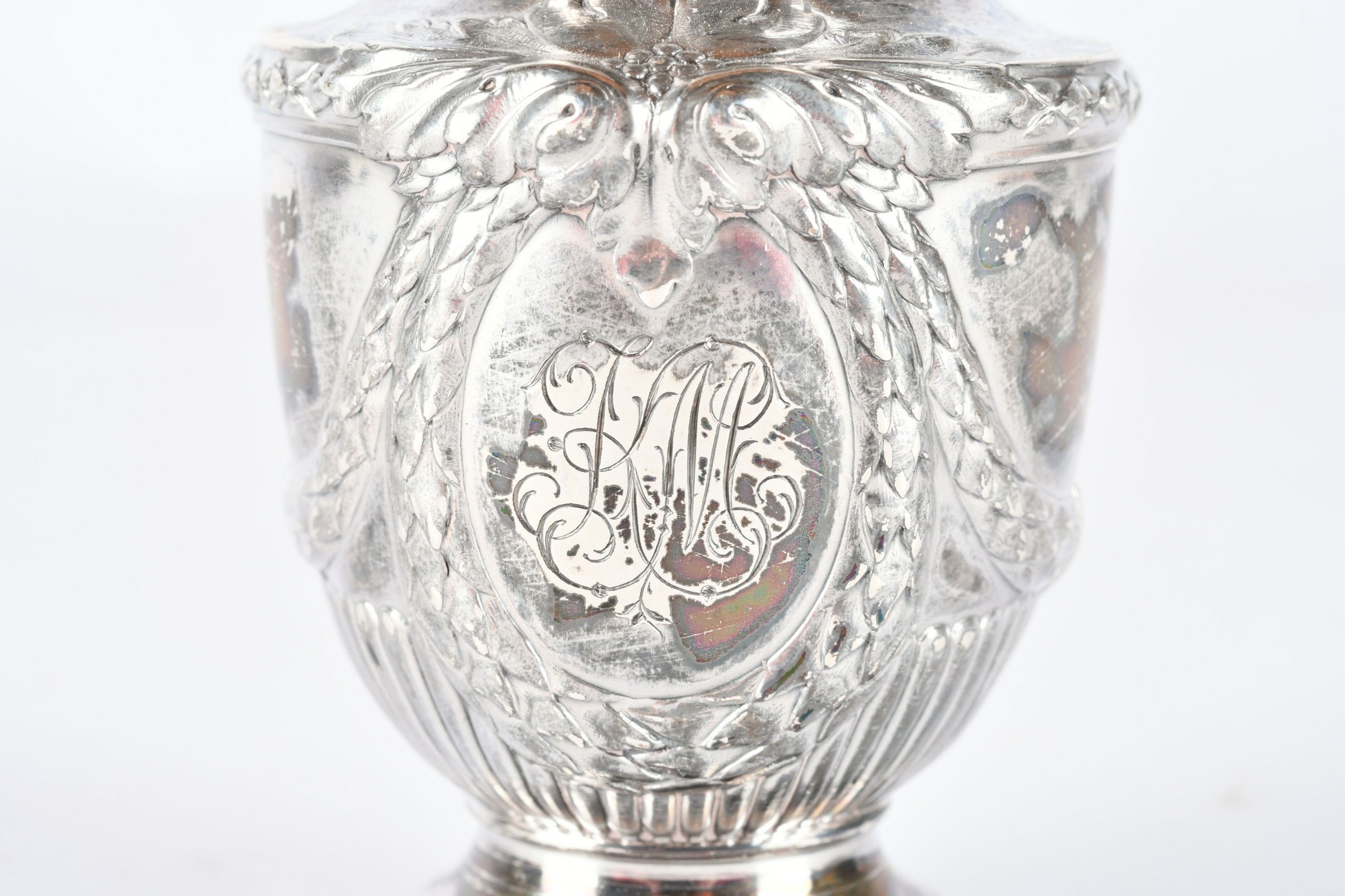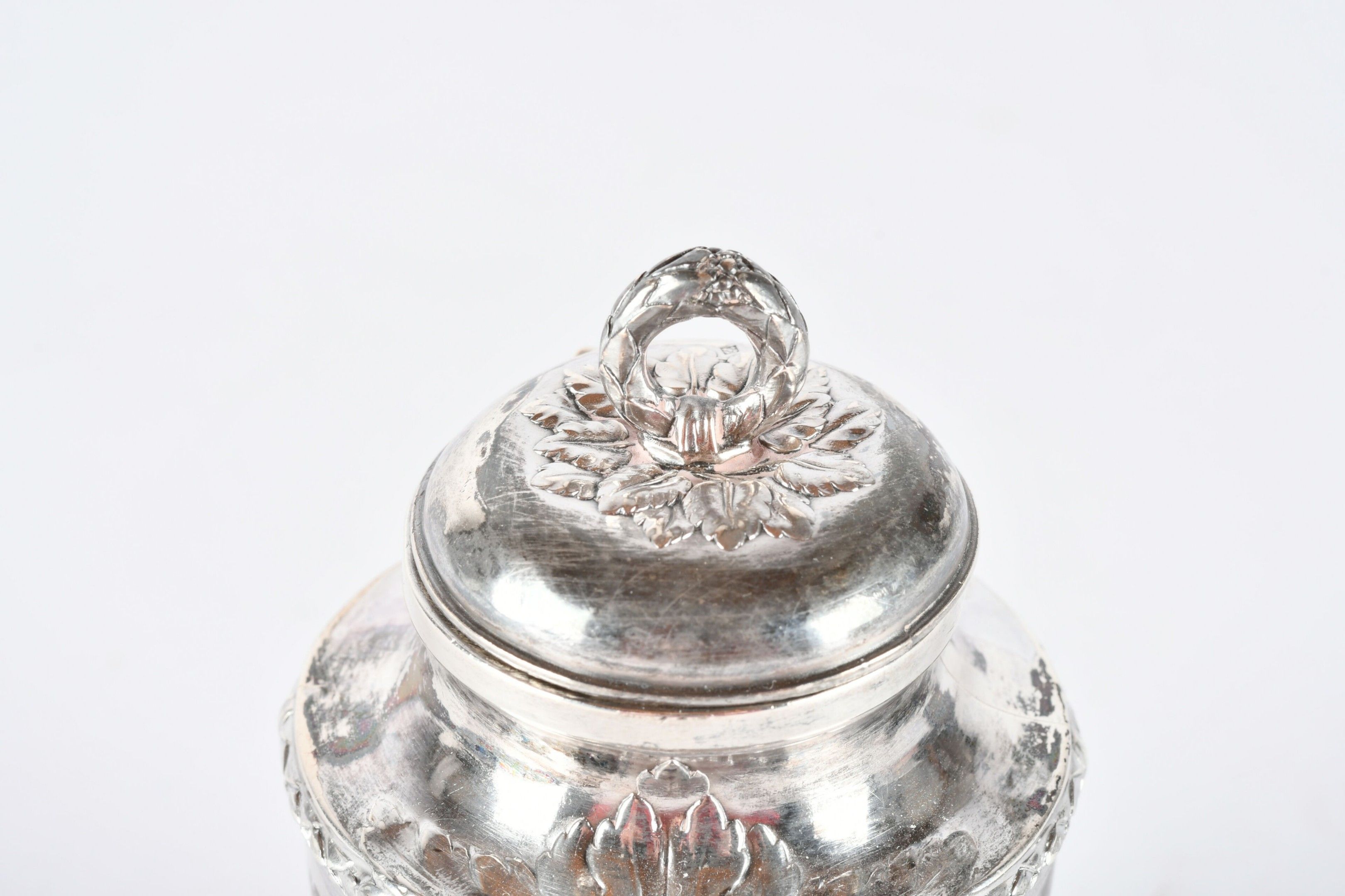 RISLER and CARRE Paris. Silver inkwell in the form of a covered urn, engraved with a monogram. Signed. H. 10 cm - Weight: 95 g. (Drilled for fixing on a stand)