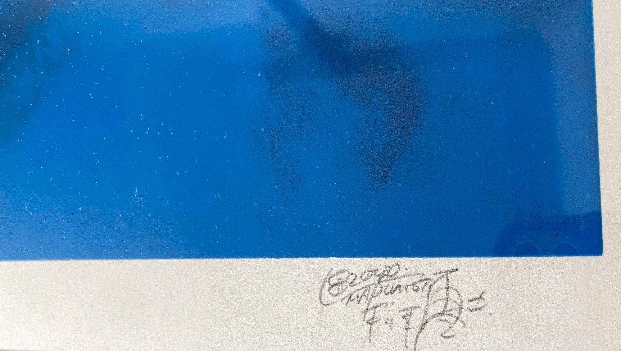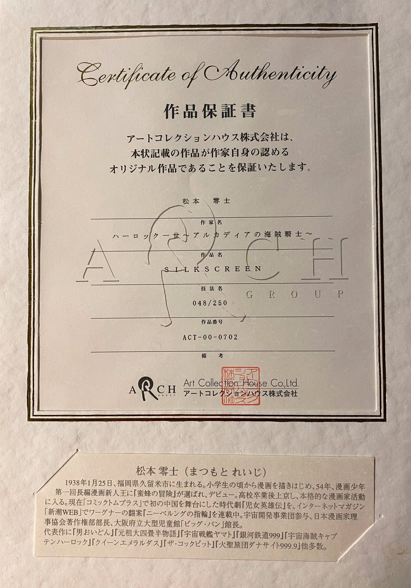 Magnificent and rare large-format silkscreen print depicting the famous space pirate in medieval "Knight of Arcadia" armour, a rare representation of Albator before his scar. This superb fine art print features the handwritten signature of the late Master Matsumoto. A rare collector's item in France. Supplied in a certified deluxe frame and its original cardboard box. Numbered 48/250. Delivered with certificate.