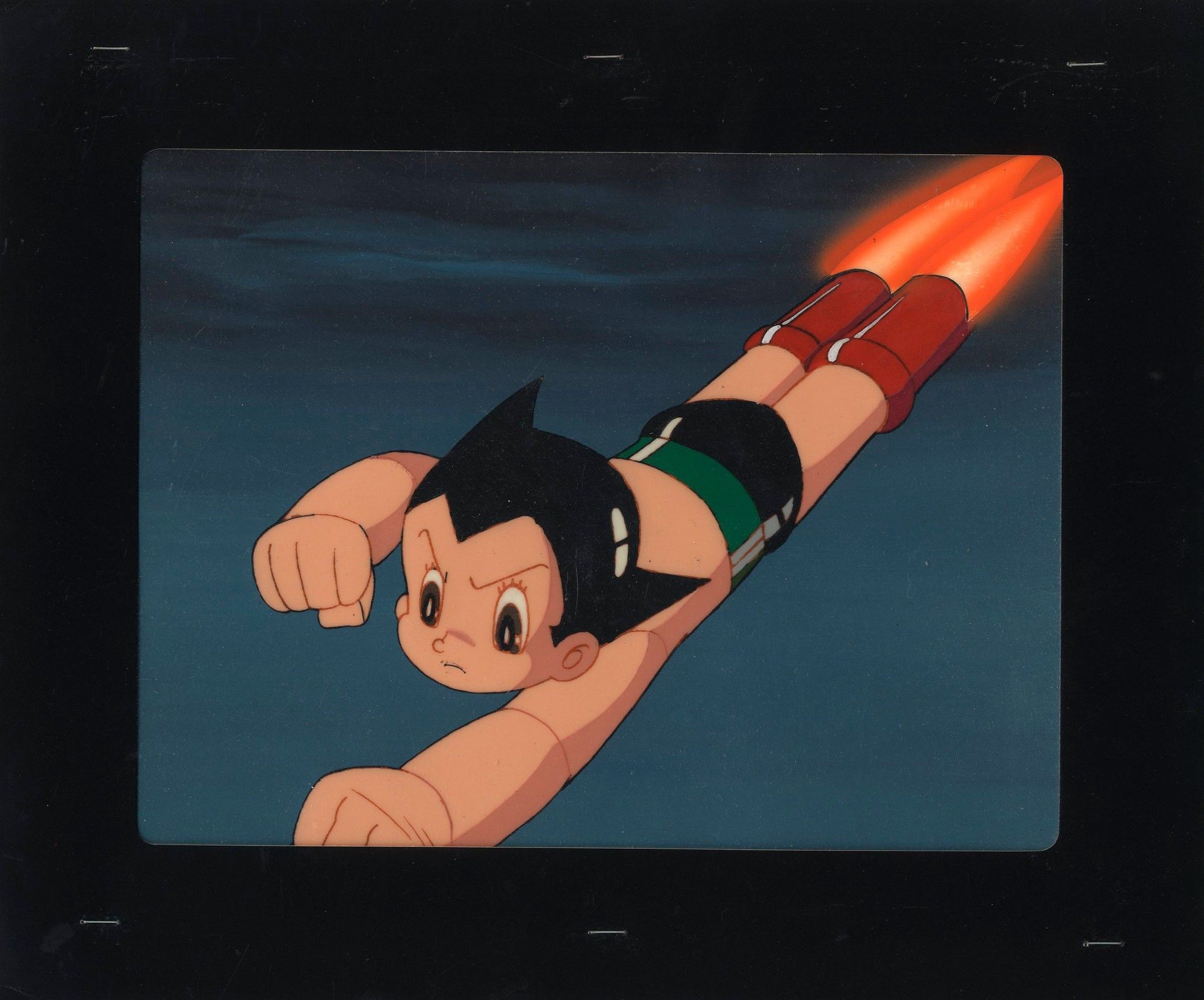Very beautiful and rare original double-layered cellulo in ink and gouache over an original gouache design depicting Astro in full flight. An iconic image of this emblematic figure of Japanese culture. The set is stapled in a passe-partout. From the second TV adaptation produced by Tezuka Procutions in 1980-1981.