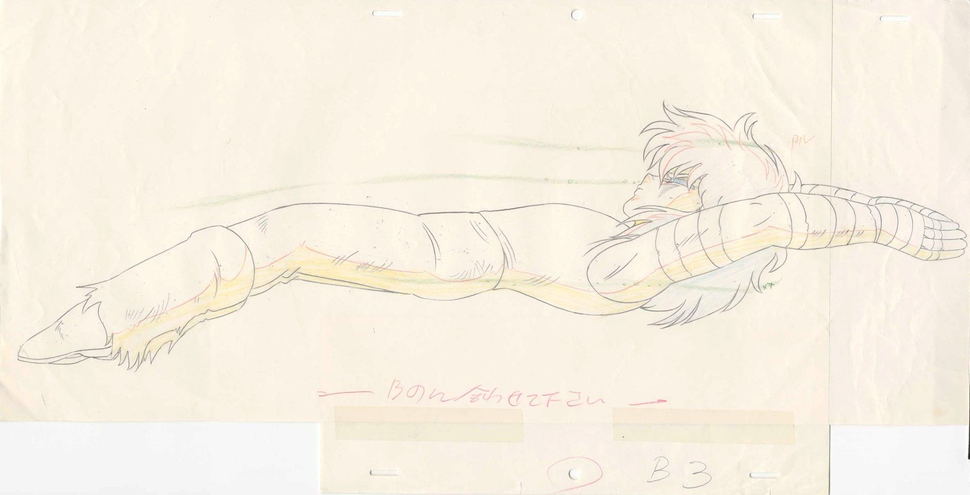 Magnificent and very rare original panoramic cellulo in ink and gouache on original gouache background accompanied by its original dôga in graphite and coloured pencils depicting the young Hyôga during a difficult swimming training under the ice. Taken from episode 108 "Isaak the Traitor" produced by Toei animation in 1986-1989.