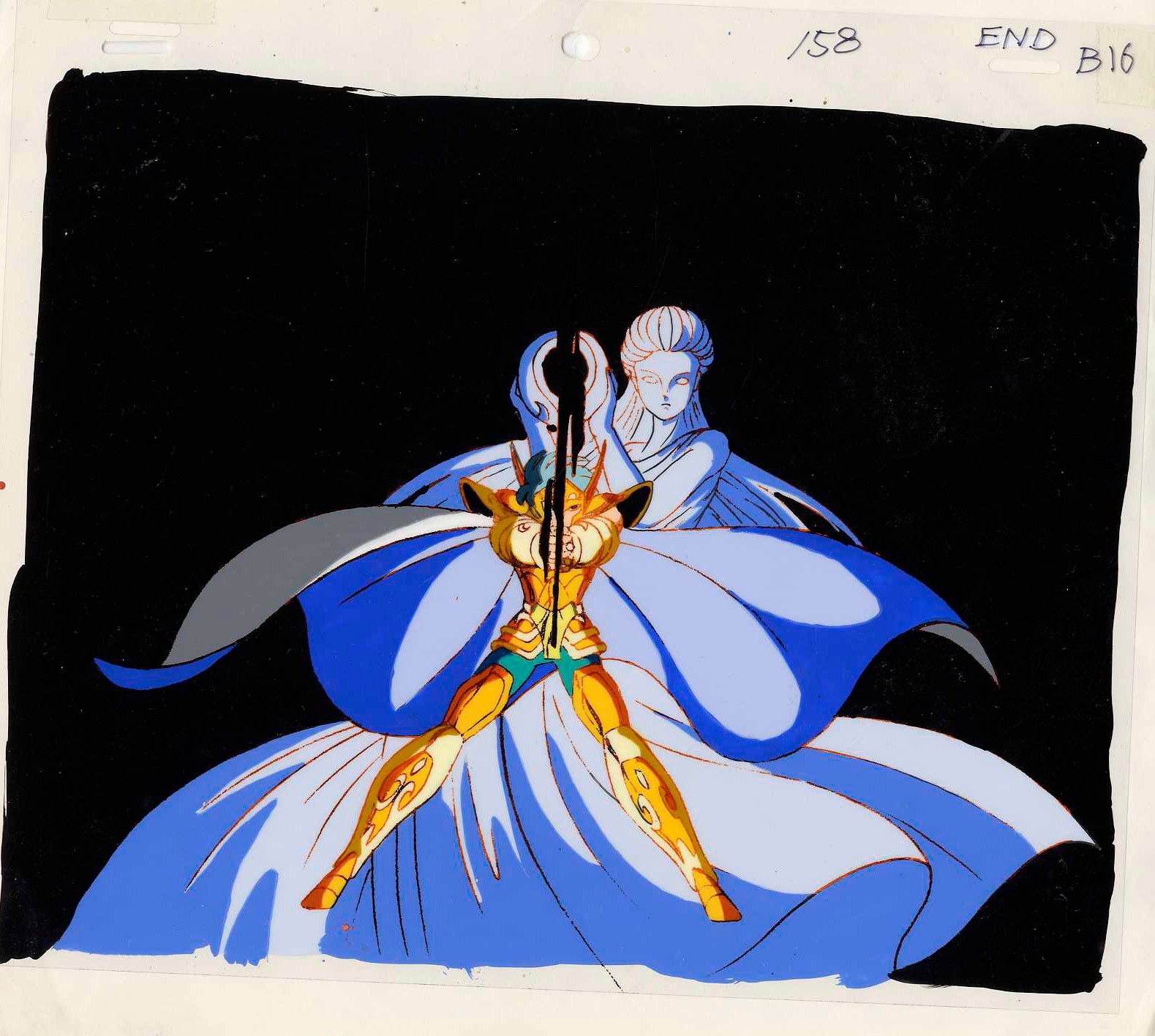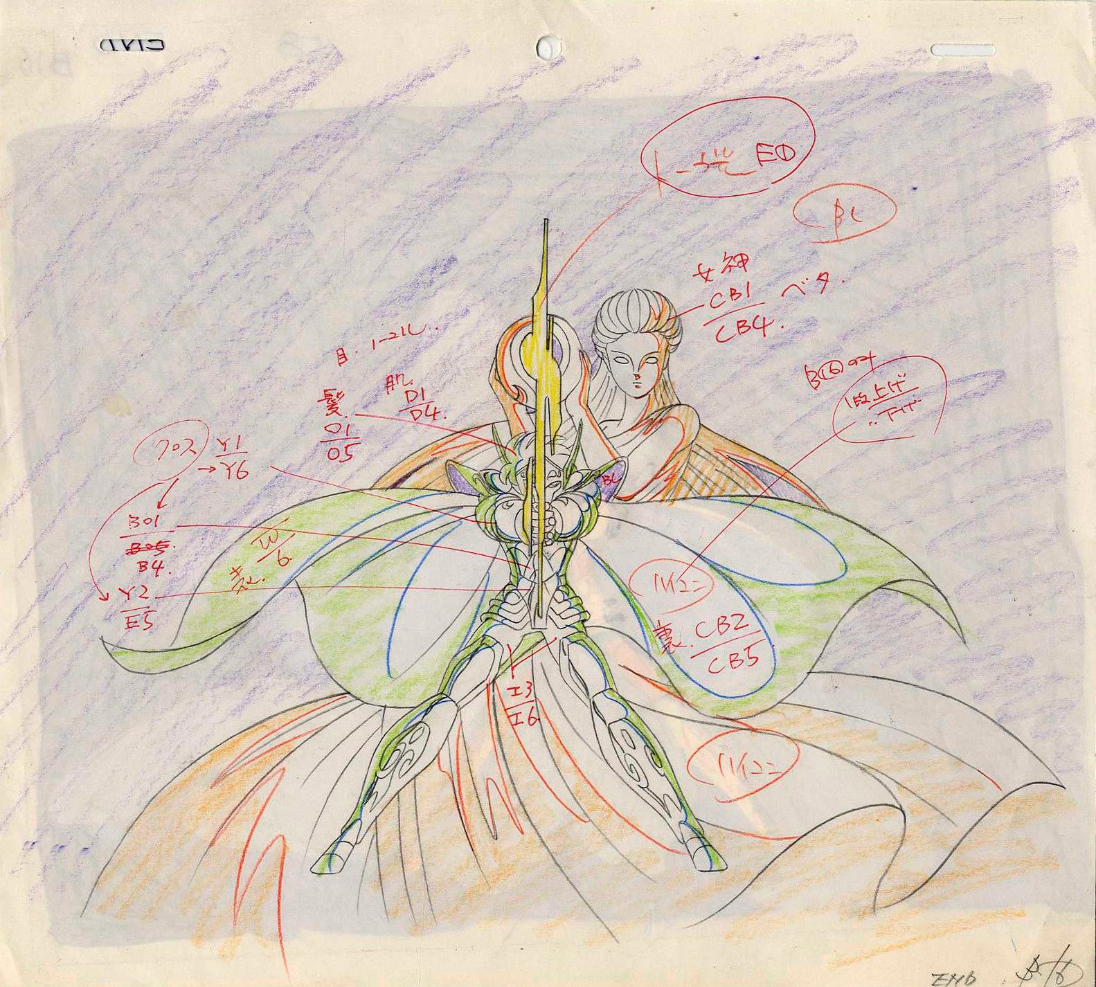 Superb and extremely rare original full-frame ink and gouache cellulo stuck to the back of its original graphite and coloured pencil dôga with coloured annotations depicting the Golden Knight's iconic attack, which will be immortalised in numerous derivative products. Produced by Toei Animation in 1986-1989.
