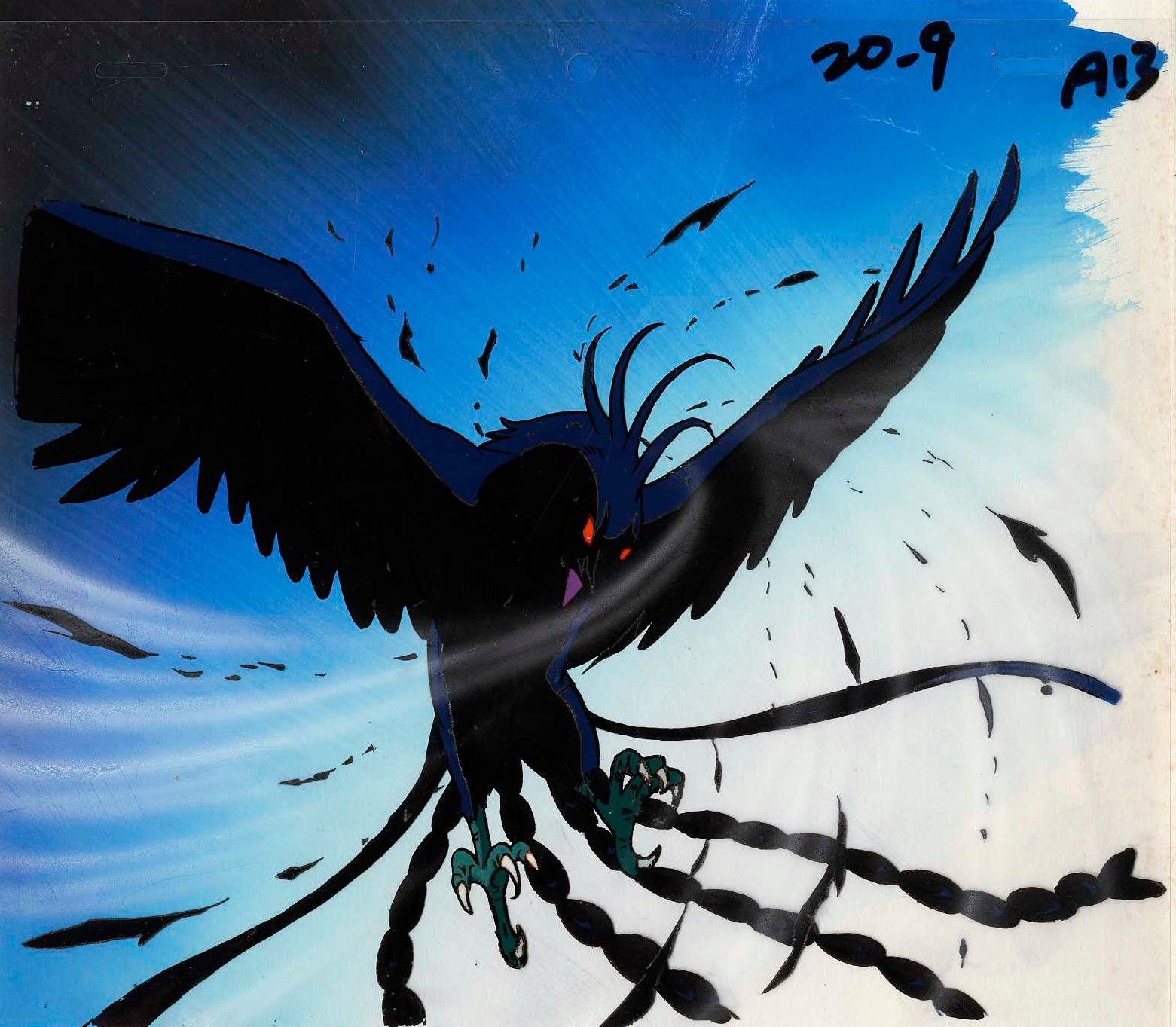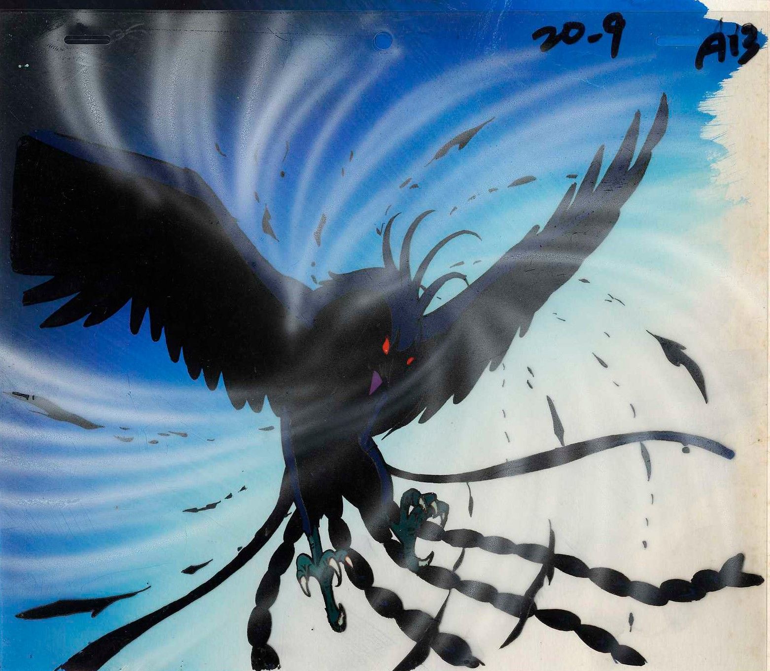 Magnificent and extremely rare original double-layered cellulo (one airbrushed) in ink and gouache on an original gouache set depicting the Black Phoenix in all its splendour. Produced by Toei Animation in 1986-1989.