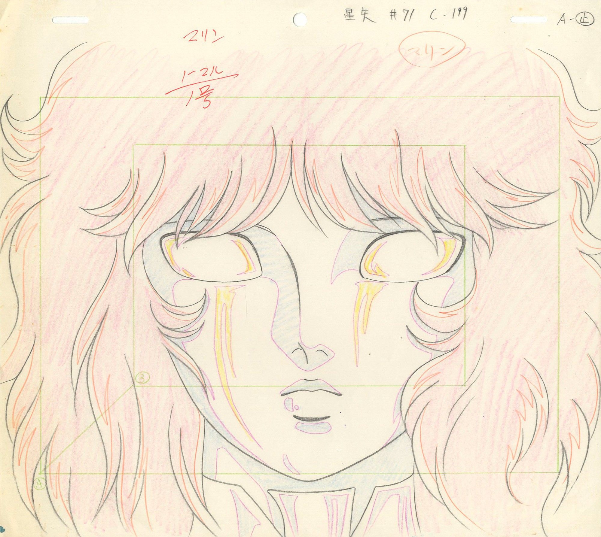 Magnificent original graphite and coloured pencil dôga with reference frames depicting the enigmatic Silver Knightess. From episode 71 "The Sceptre of Victory" produced by Toei Animation in 1986-1989.