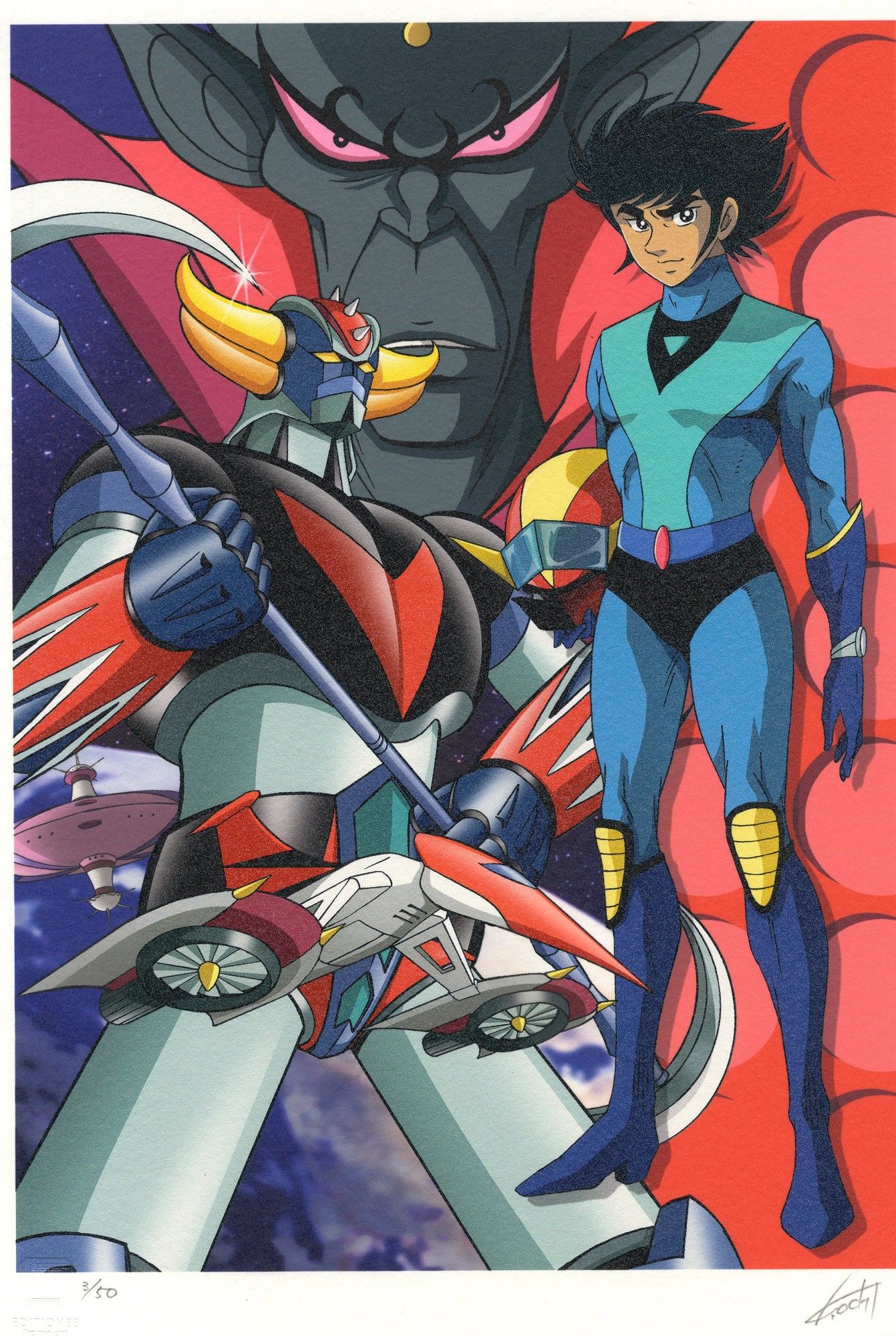 Magnificent art print on high-quality paper (bamboo-based washi paper) giving a textured effect on the surface. Illustration by the talented animator and contemporary mangaka of Go Nagai's works, the gifted Kazuhiro Ochi. Signed and limited to 50 copies. N°3/50. Out of print and much sought-after.