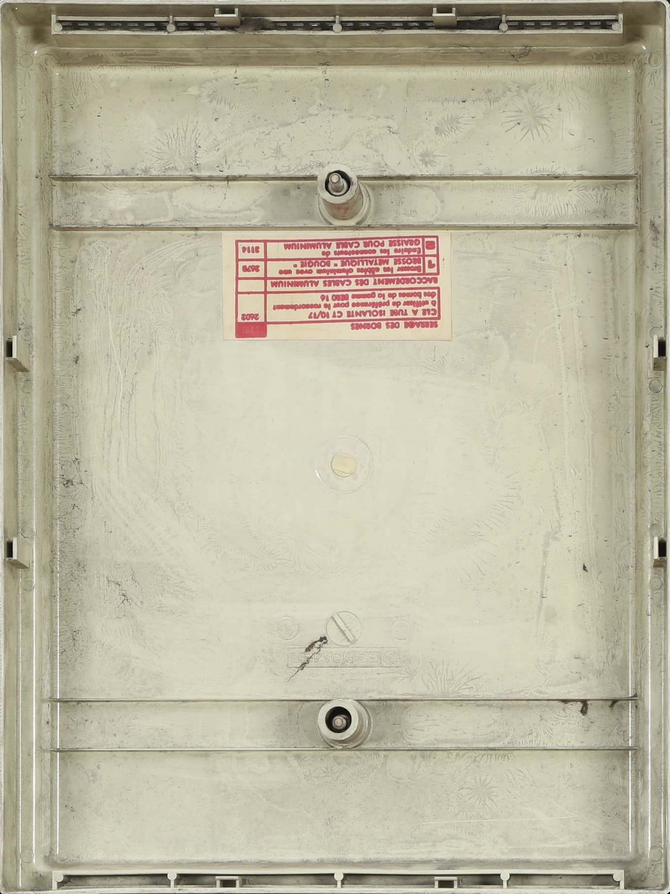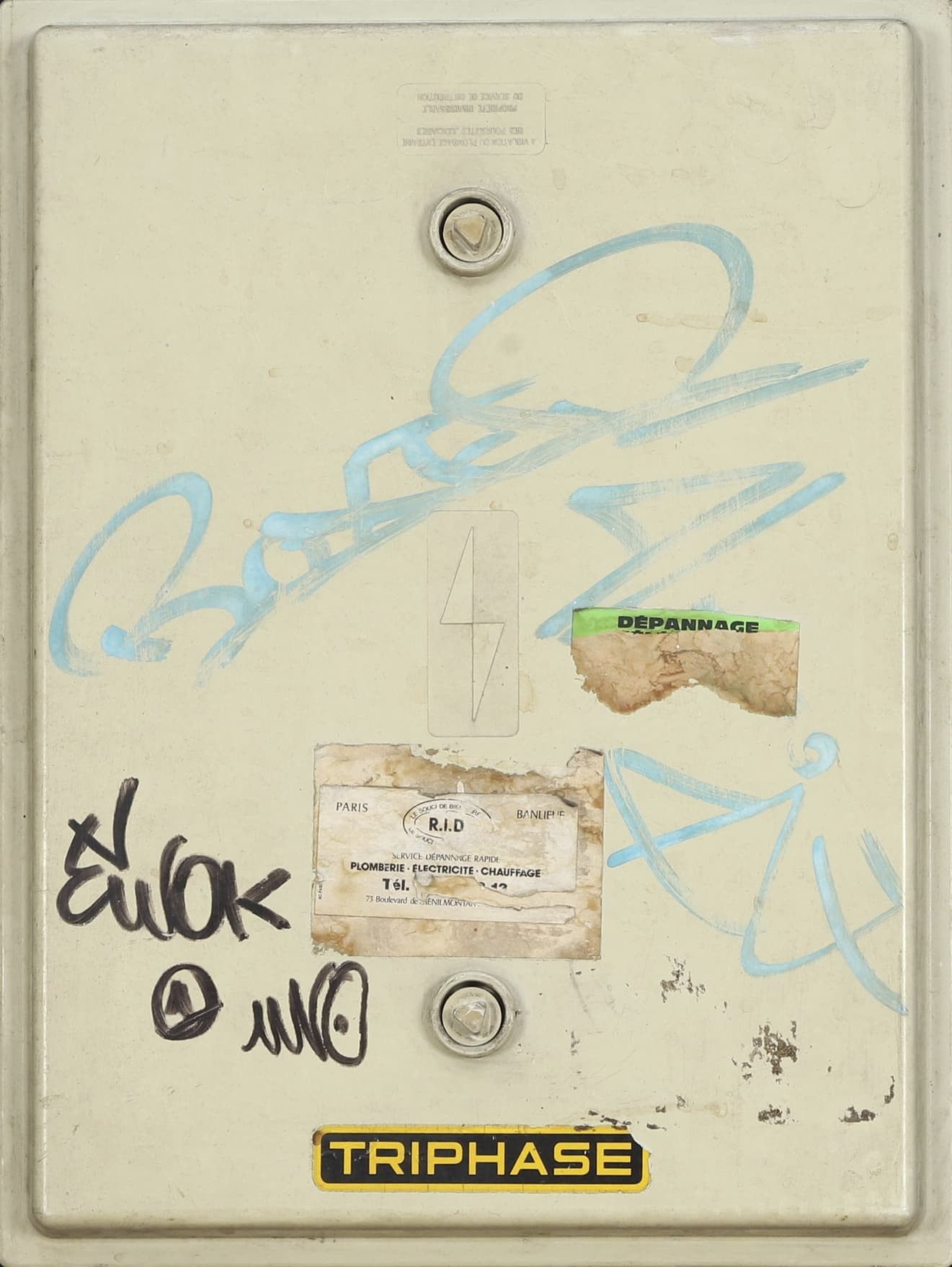 Boxer (19??-1994) "Triphasé" circa 1988 Felt pen on three-phase electricity meter cover 40 x 30 cm Boxer is a true legend of Parisian graffiti, and evidence of his art is now extremely rare!