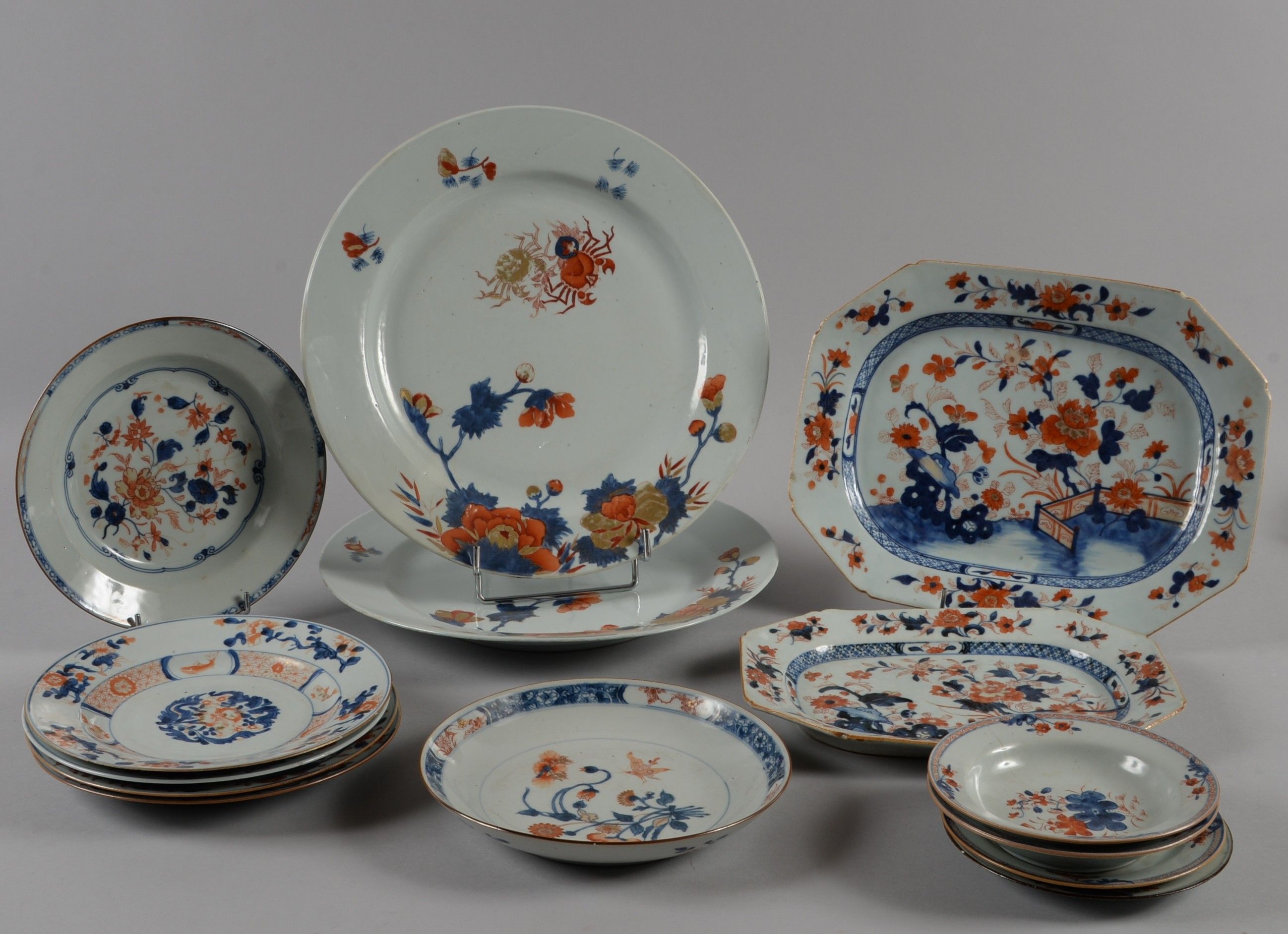 Set comprising two rectangular dishes, two circular dishes, four plates, one soup plate, two small soup plates and two small plates, with Imari decoration.