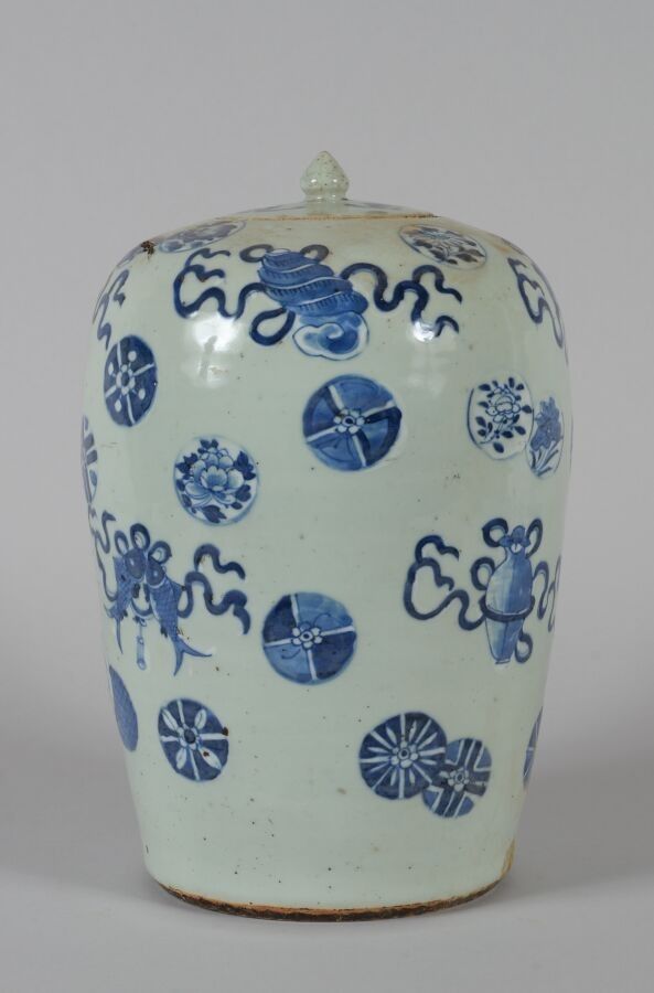 Celadon porcelain ginger pot decorated with white and blue symbols, the lid decorated with three bats.