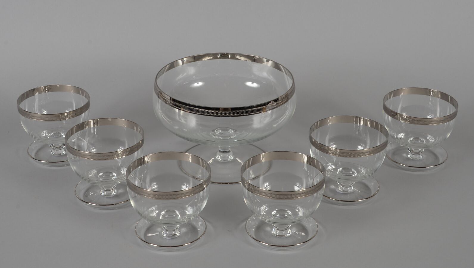 Colourless crystal and silver-plated metal fruit salad set, comprising six bowls and a bowl.