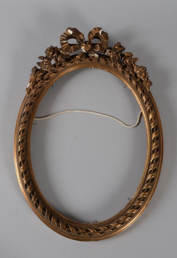 Oval wood and stucco gilded view frame decorated with a laurel torus, knotted pediment and flowers.