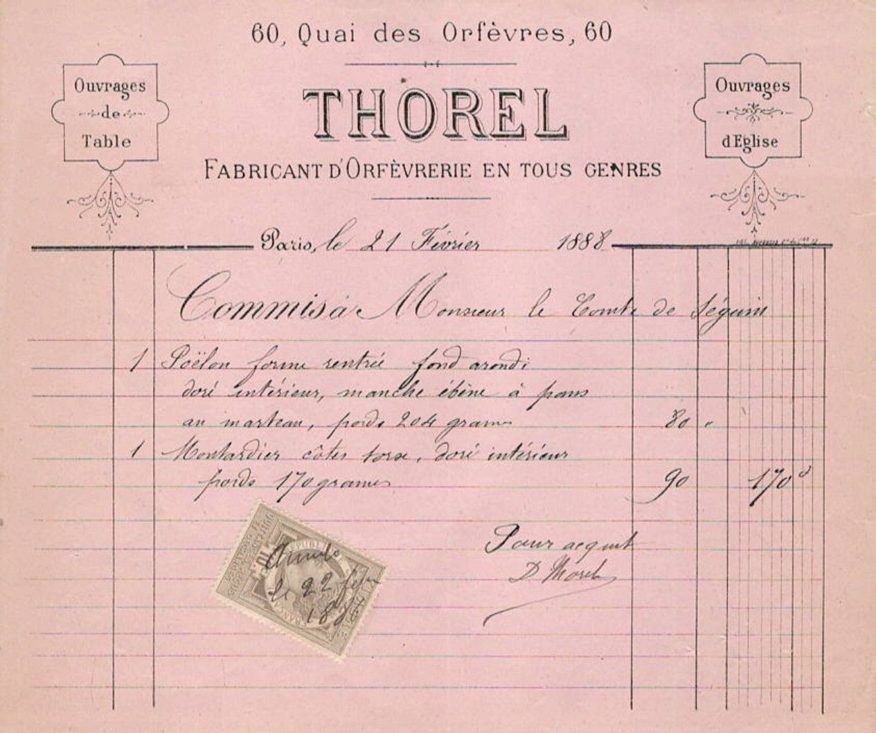 Attached is an invoice from Thorel, dated 21 February 1888, whose description seems to correspond with a similar weight.