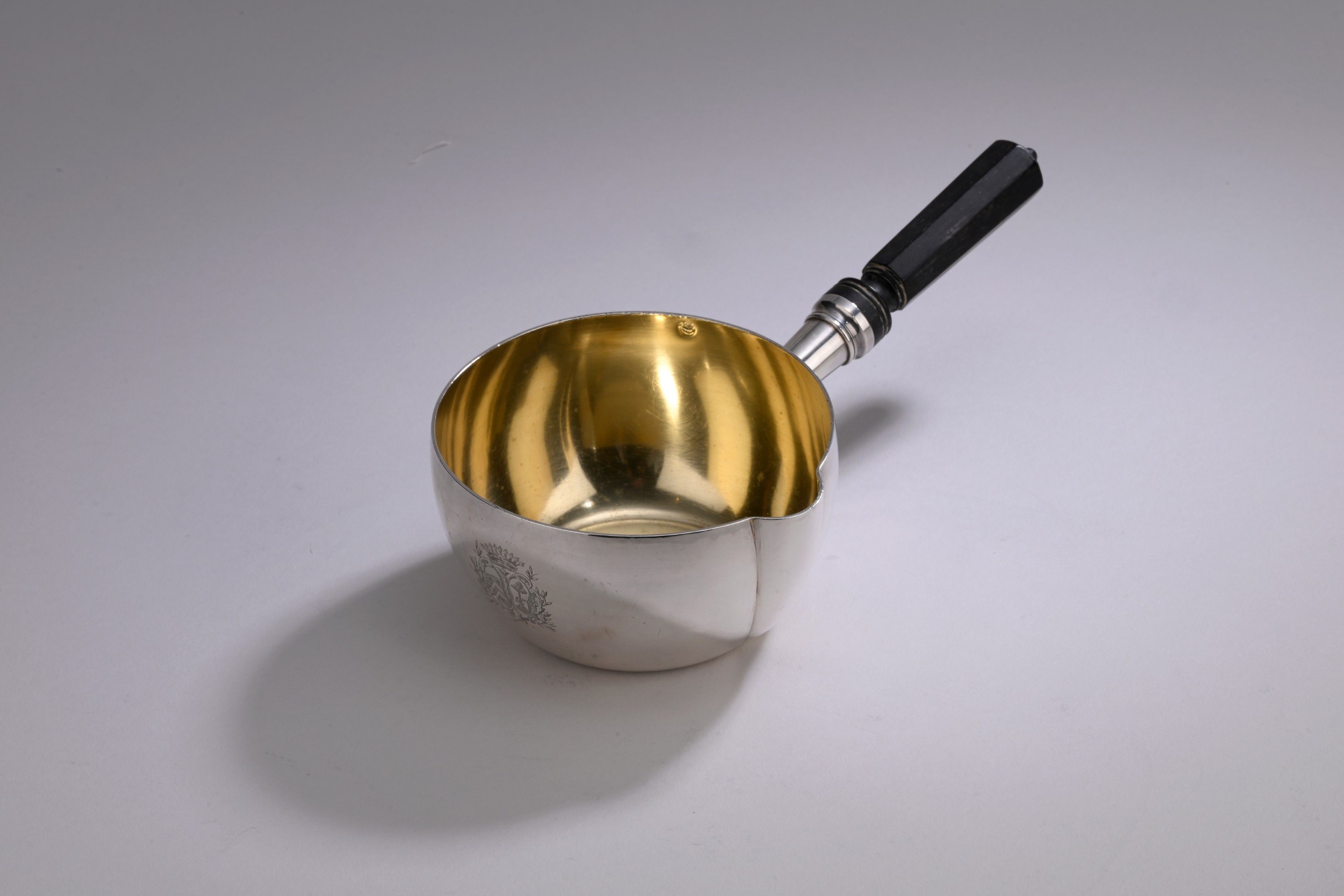 A 950‰ first-rate silver casserole, round in shape, the body plain, the spout taken on form. Fitted with a black wooden handle with sides. The interior gilded. Engraved with the Séguin and Brémontier arms surmounted by a count's crown.