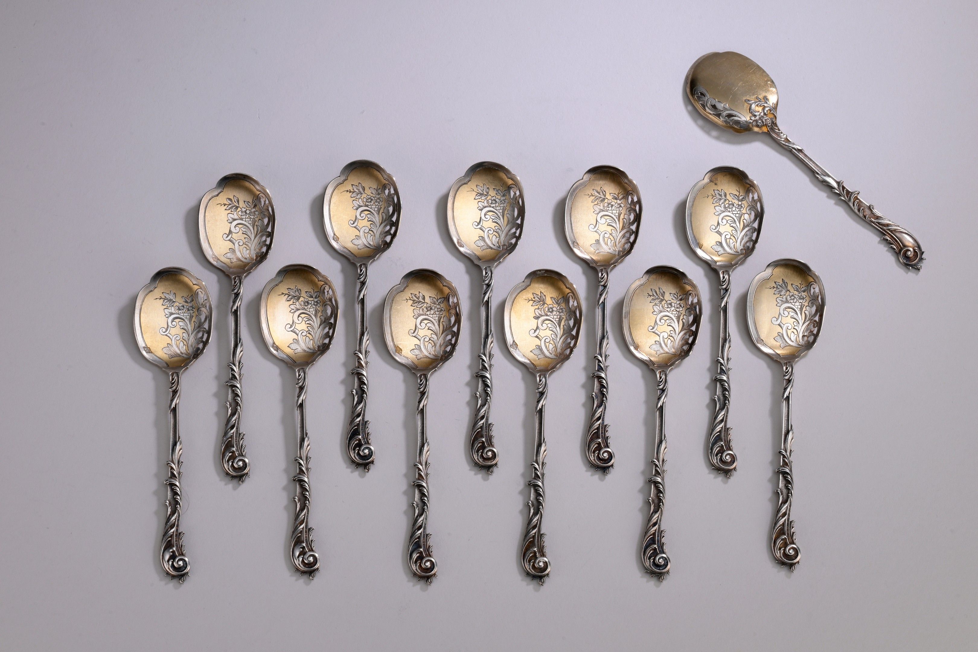 Twelve silver 1st title 950‰, and vermeil ice scoops, openwork and chased with rocaille decoration.