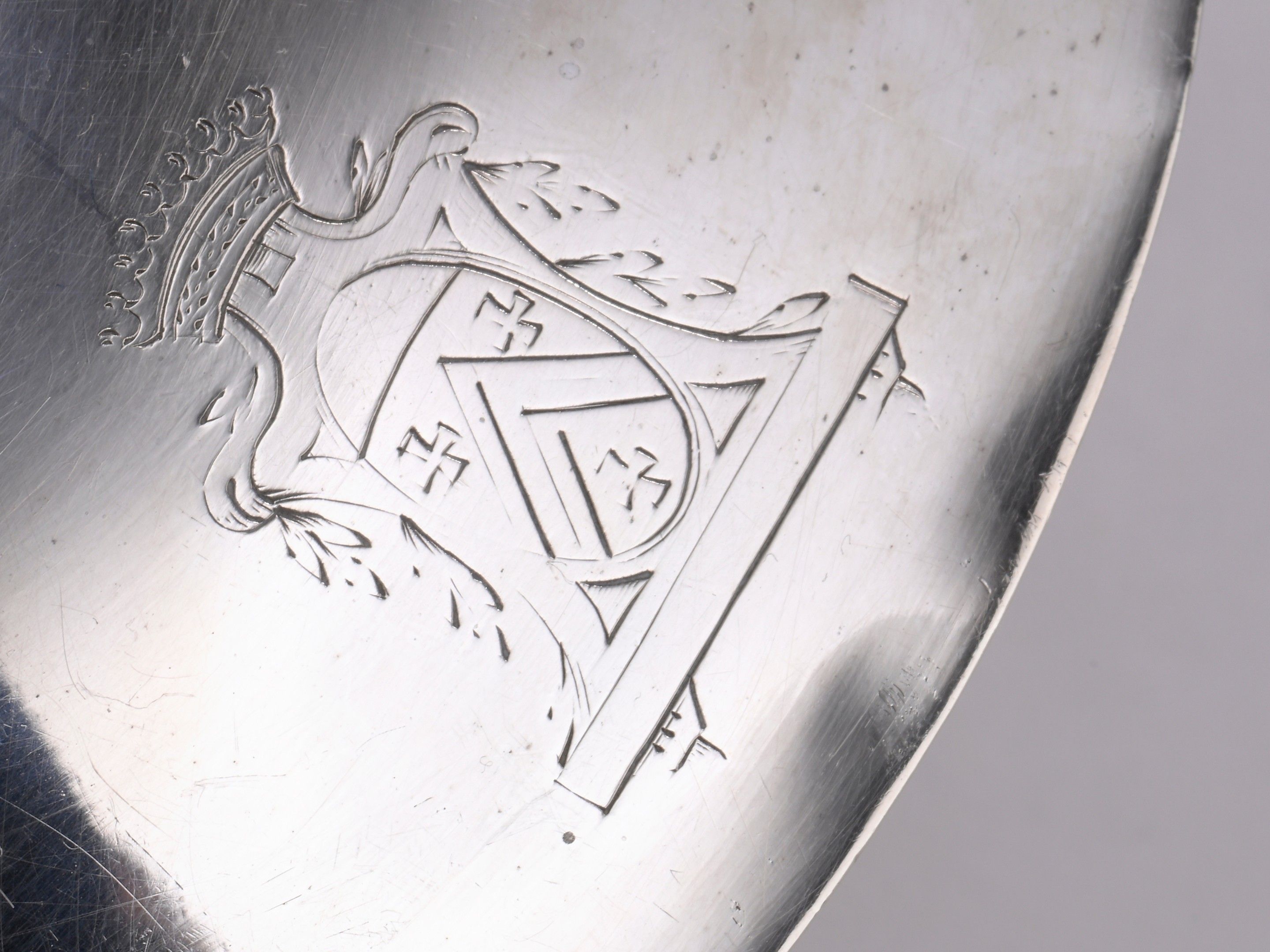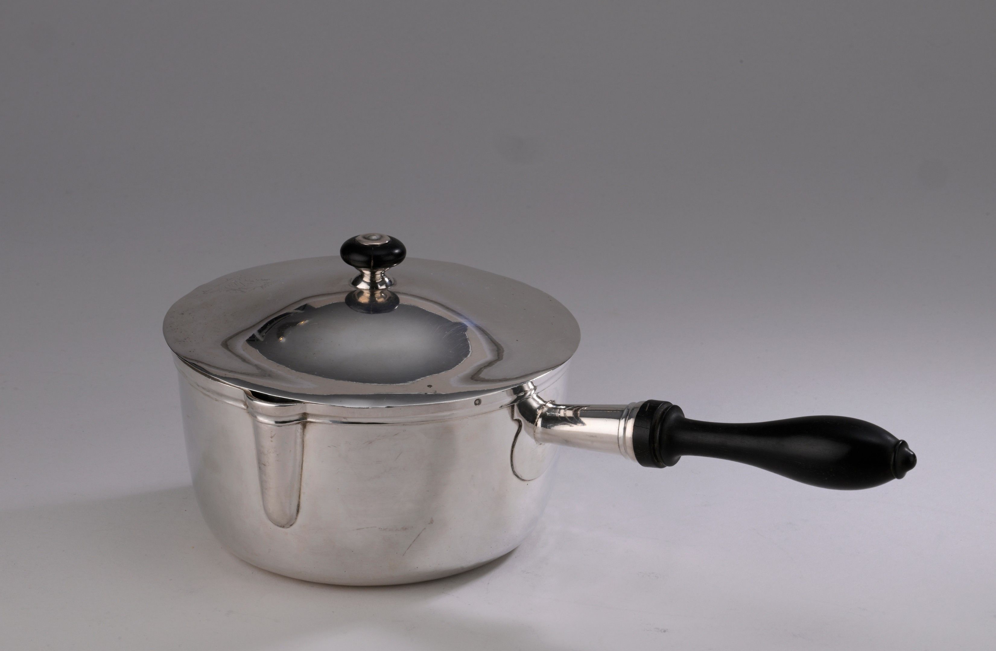 A 950‰ first-rate silver frying pan, round in shape, the body plain, fitted with a lid, the turned black wooden knob handle. Fitted with a black wooden side handle. Engraved on the body and lid with the Séguin coat of arms beneath a count's crown.