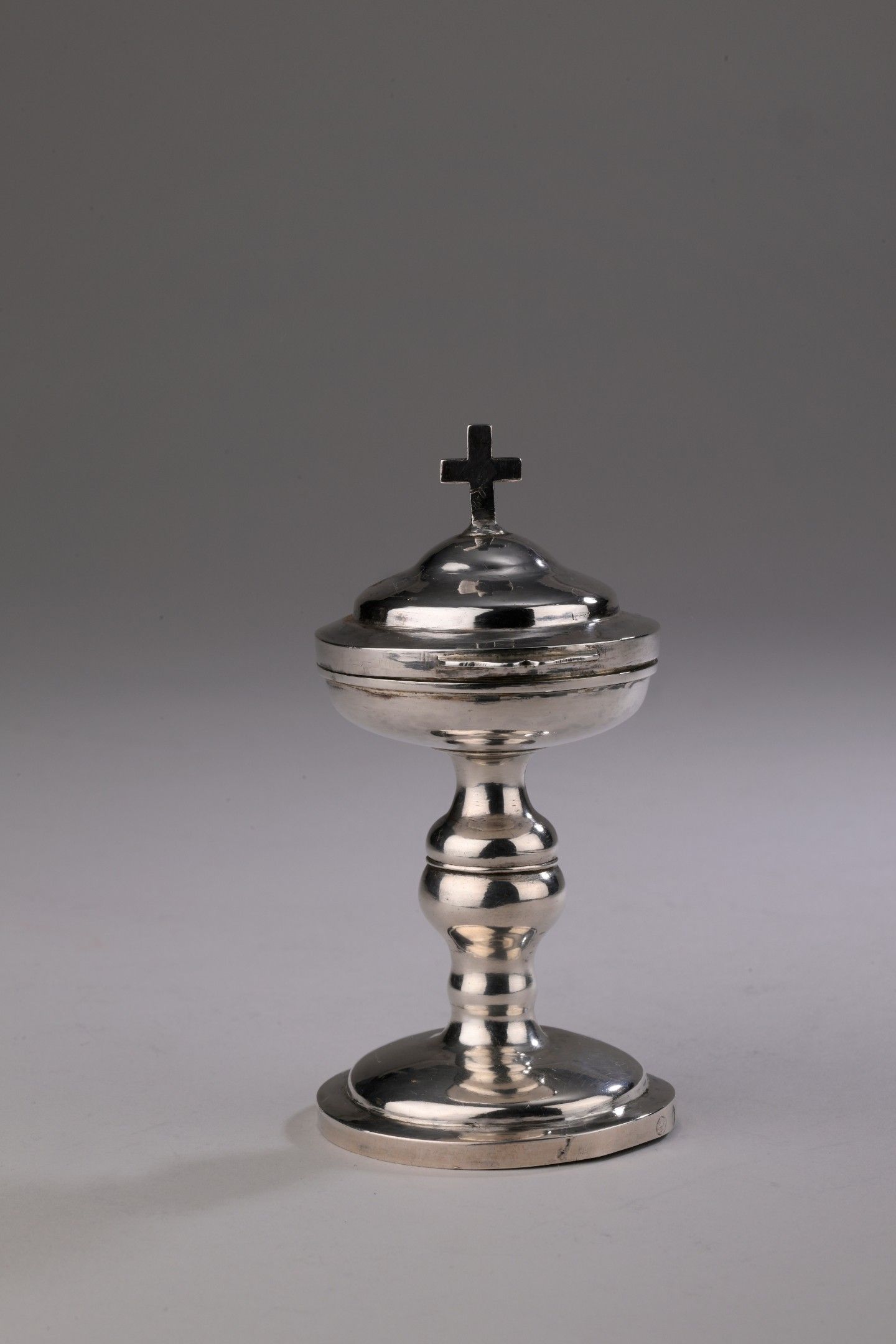 Ciborium-chrismatory in silver 1st title 950‰, plain. Fitted in the shaft with a receptacle for holy oils. The lid hinged and surmounted by a cross.