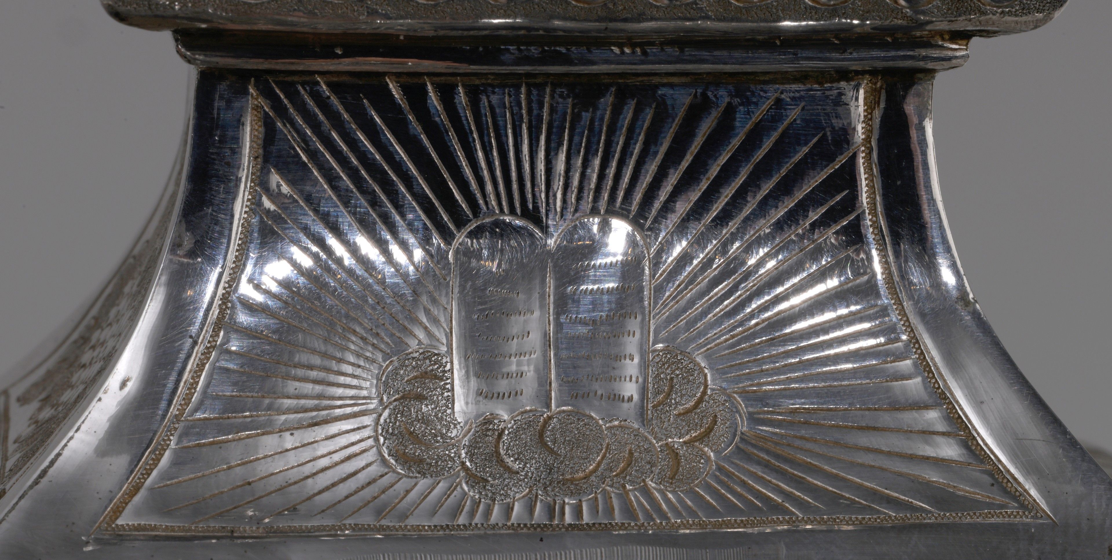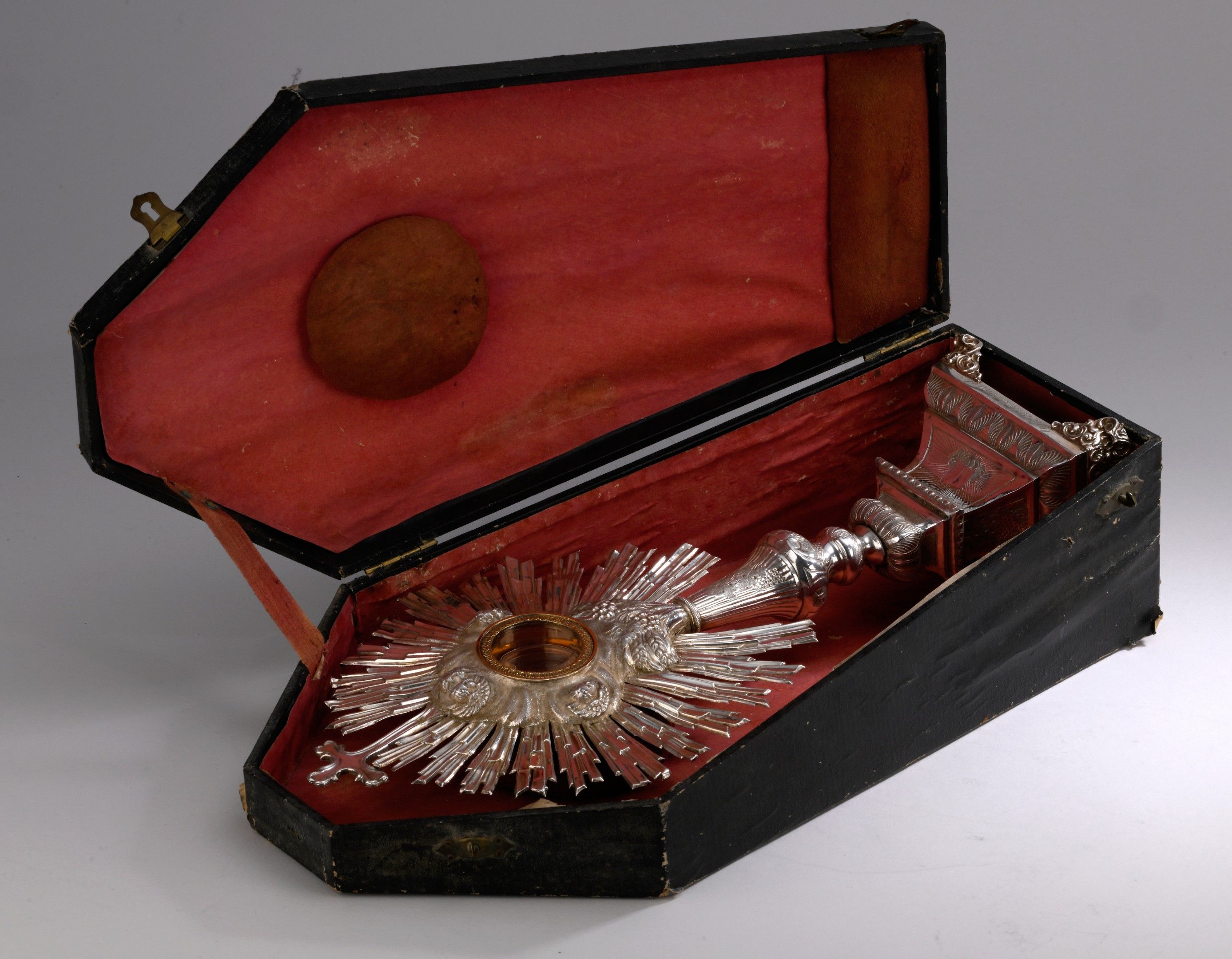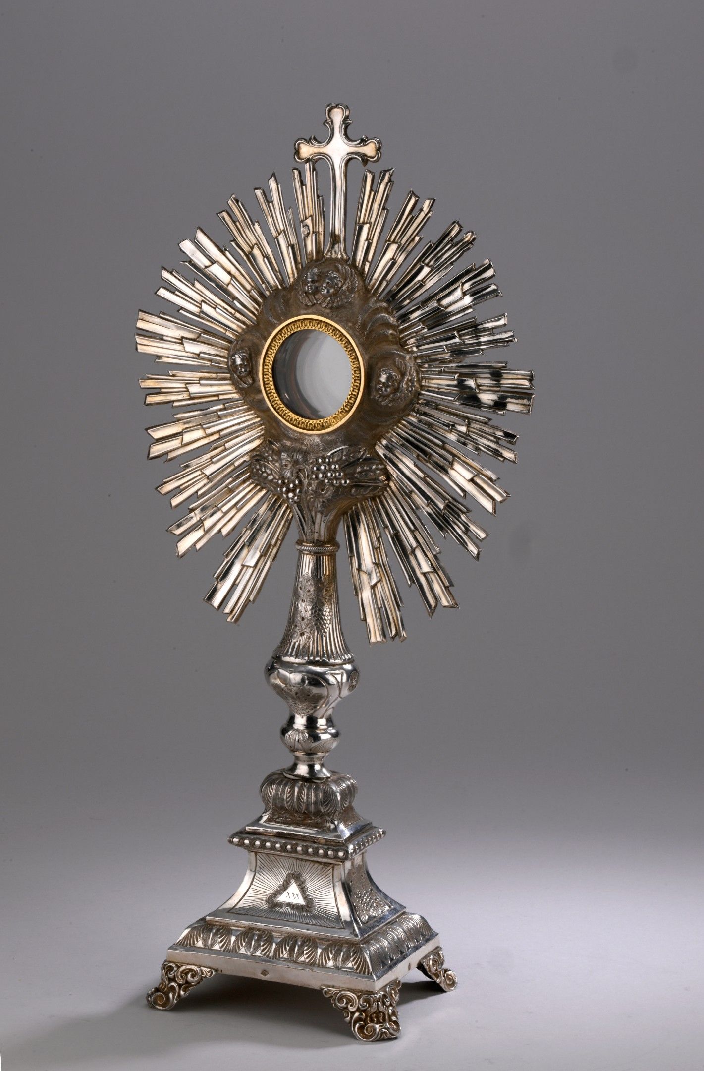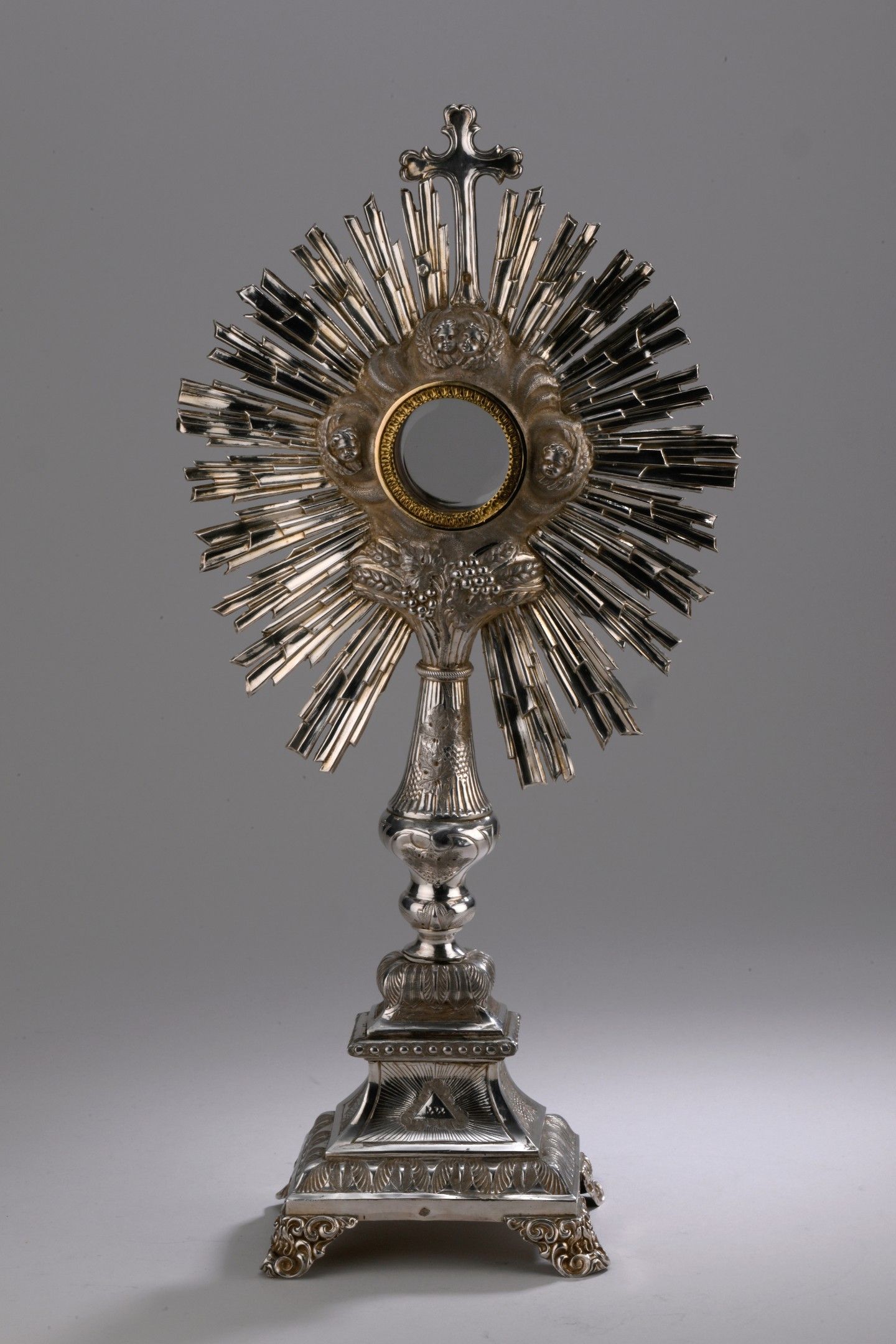 Monstrance in silver 1st title 950‰, standing on a rectangular base with four feet, chased with leaves, pampers, the tables of the law and a tetragrammaton. The baluster-shaped shaft, chased with ears of corn and vine shoots. In the centre is a gilded lunette with clouds and angel heads in a radiant design. The whole surmounted by a cross. Engraved on the foot Œuvre des tabernacles.