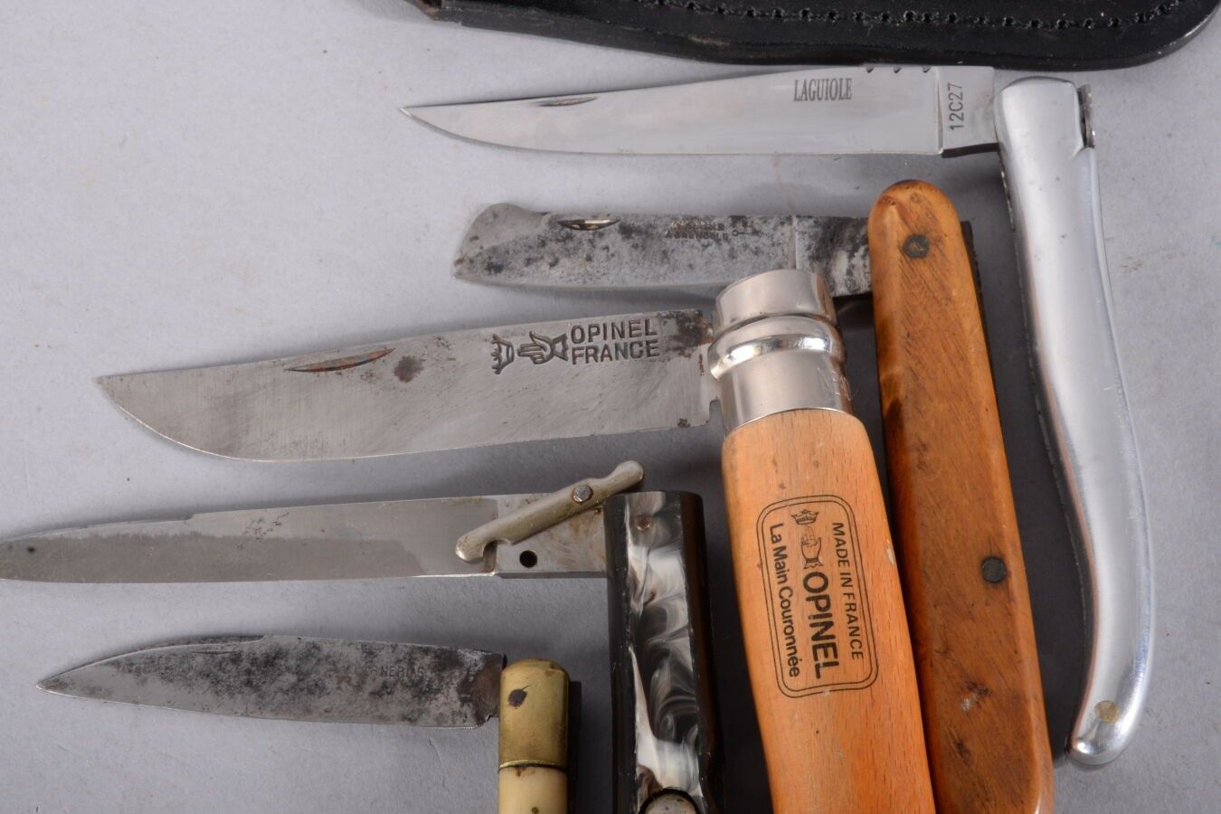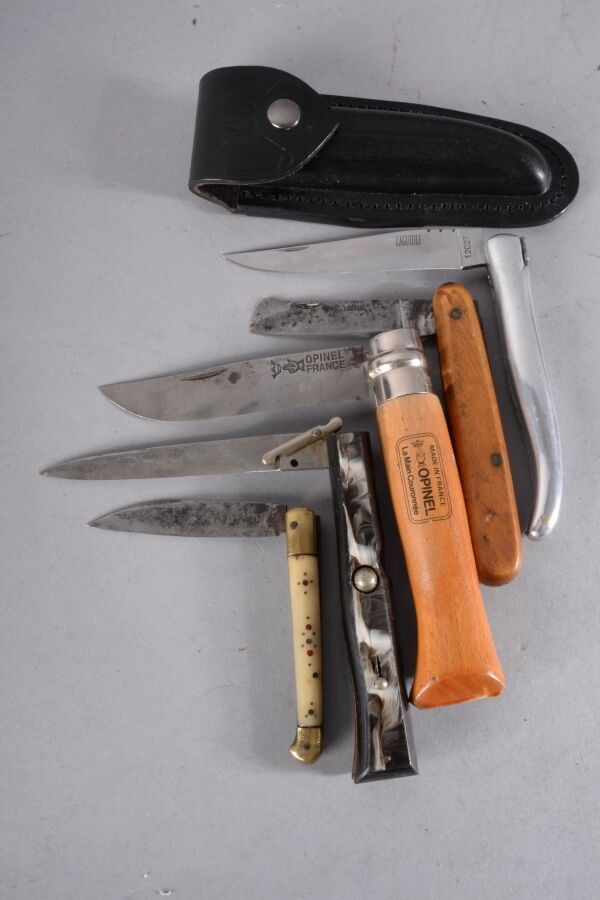 Set of 5 penknives including ANTOINE Grenoble, OPINEL, ,ARNIAS, LAGUIOLE in black leather sheath average length in open position: 16 cm