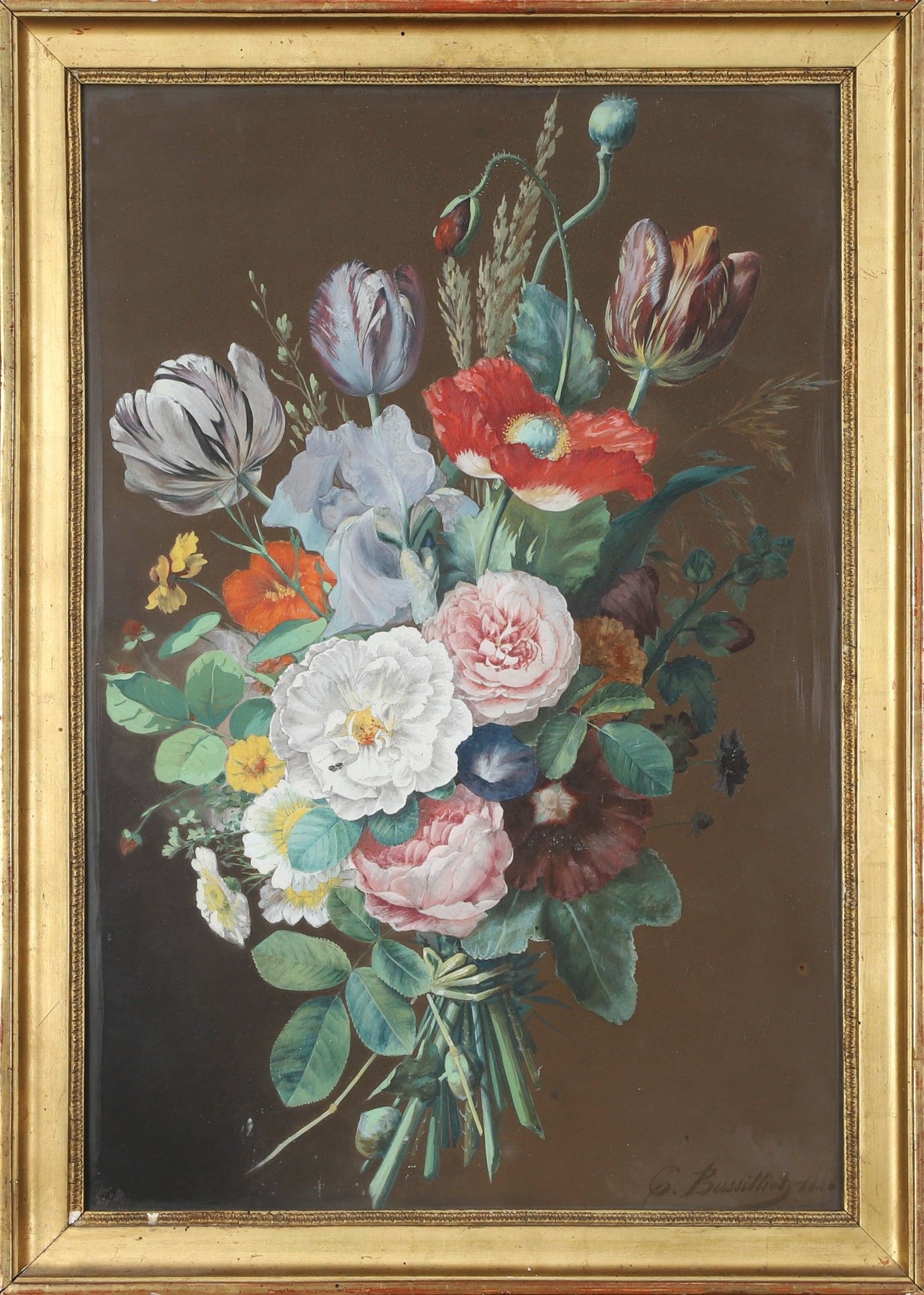 19th century school Still life with a bouquet of flowers 1846 Gouache on paper signed (G Bussilliet?) and dated lower right 56 x 38 cm Condition report: Framed, dimensions at sight
