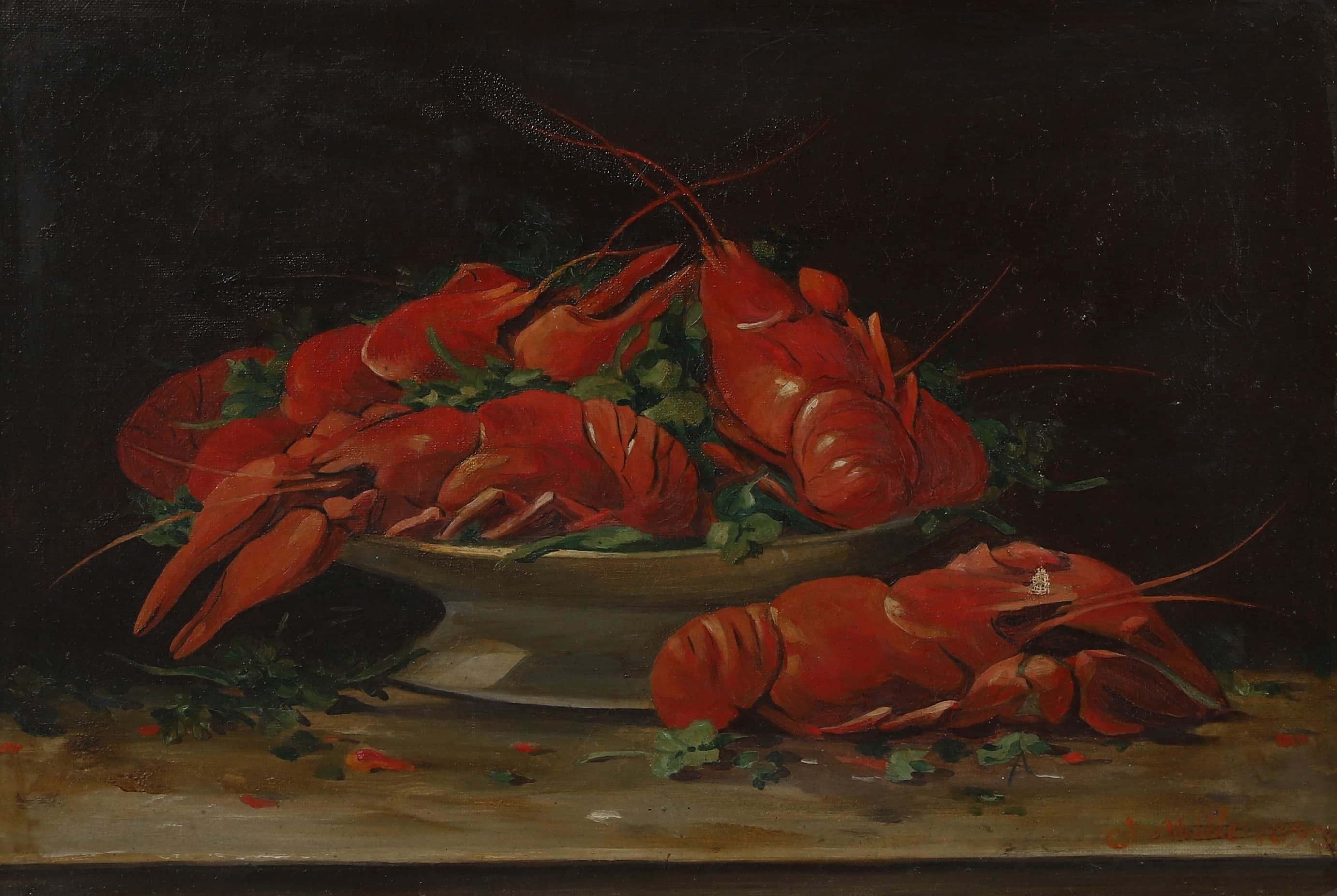 Yvonne Serruys née Mille (1873-1953) Nature morte aux écrevisses 1893 Oil on canvas signed and dated lower right 38 x 26 cm Condition report: Framed, a hole in the centre