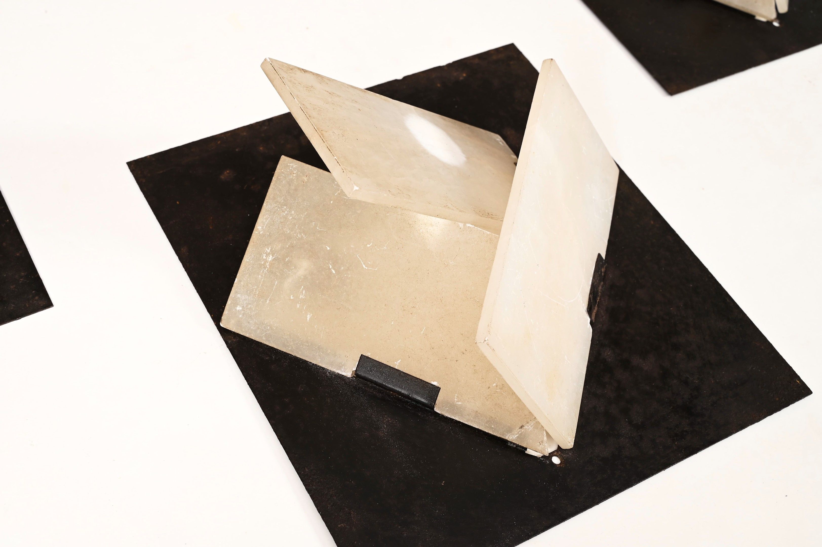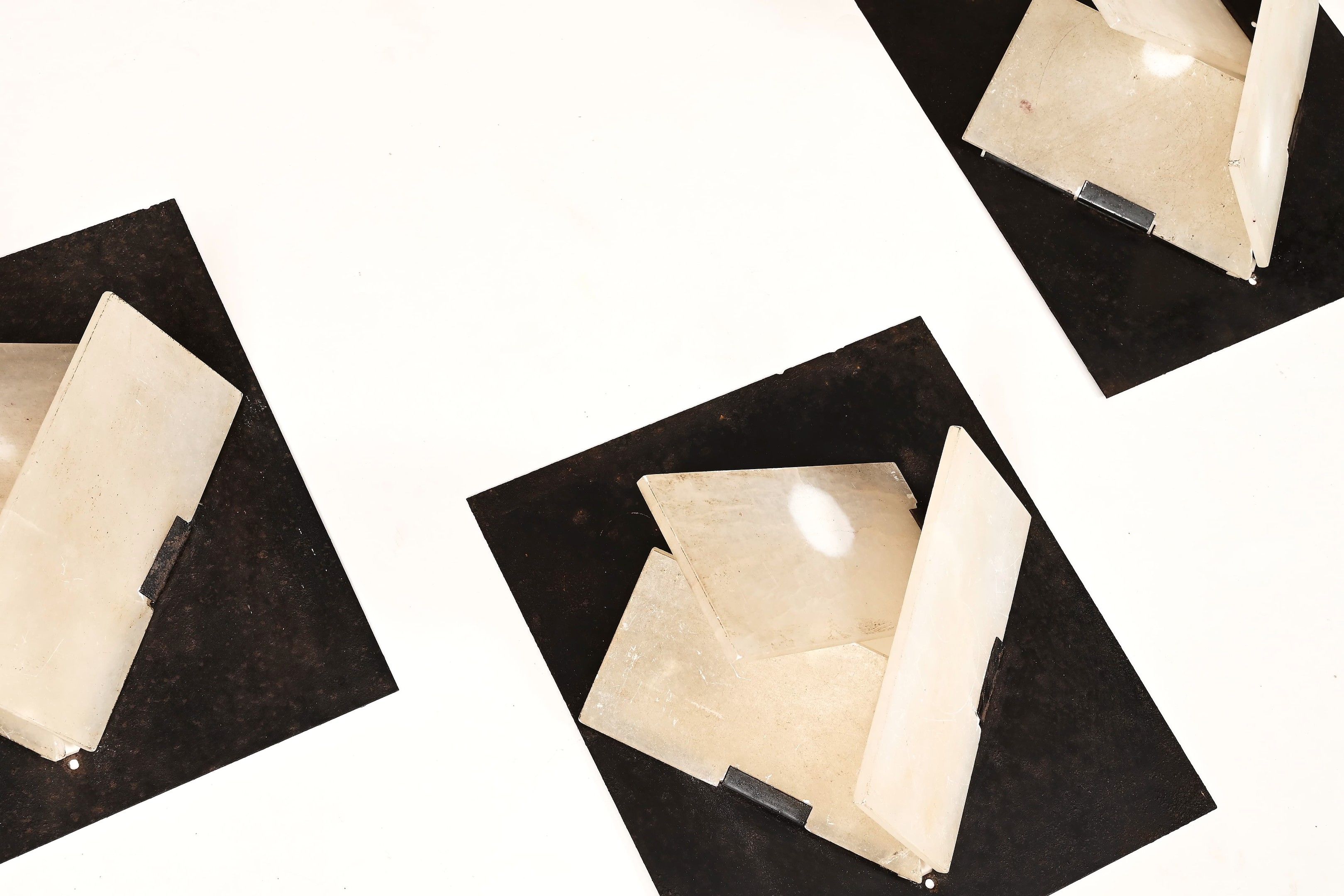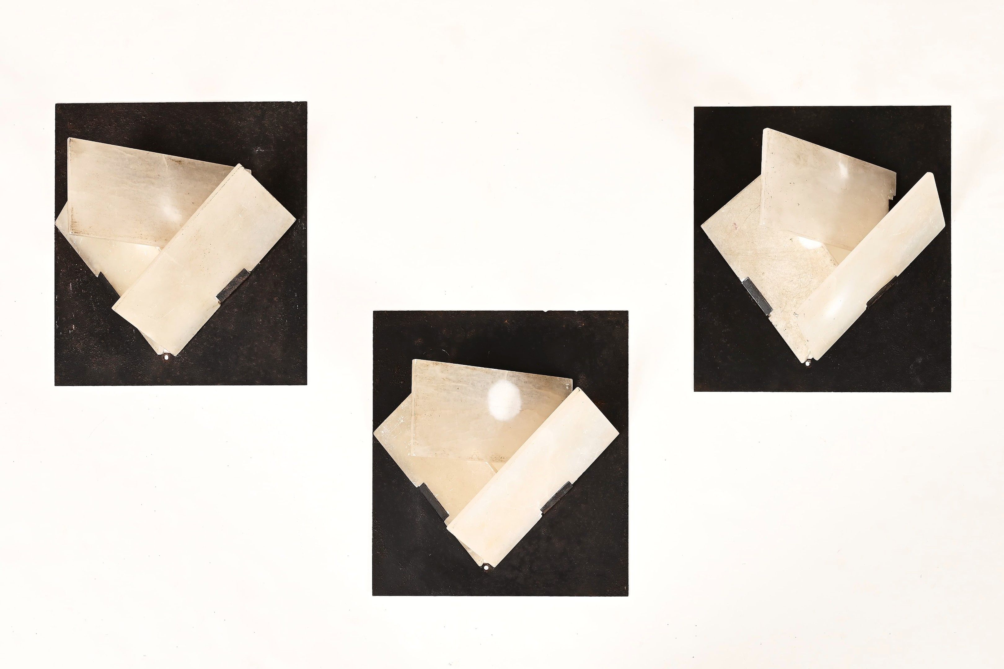 Pierre Chareau (1883-1950) Suite of 3 "Mouche" sconces LA415 circa 1927 Wall mounting plate in black patinated iron holding 3 alabaster leaves
