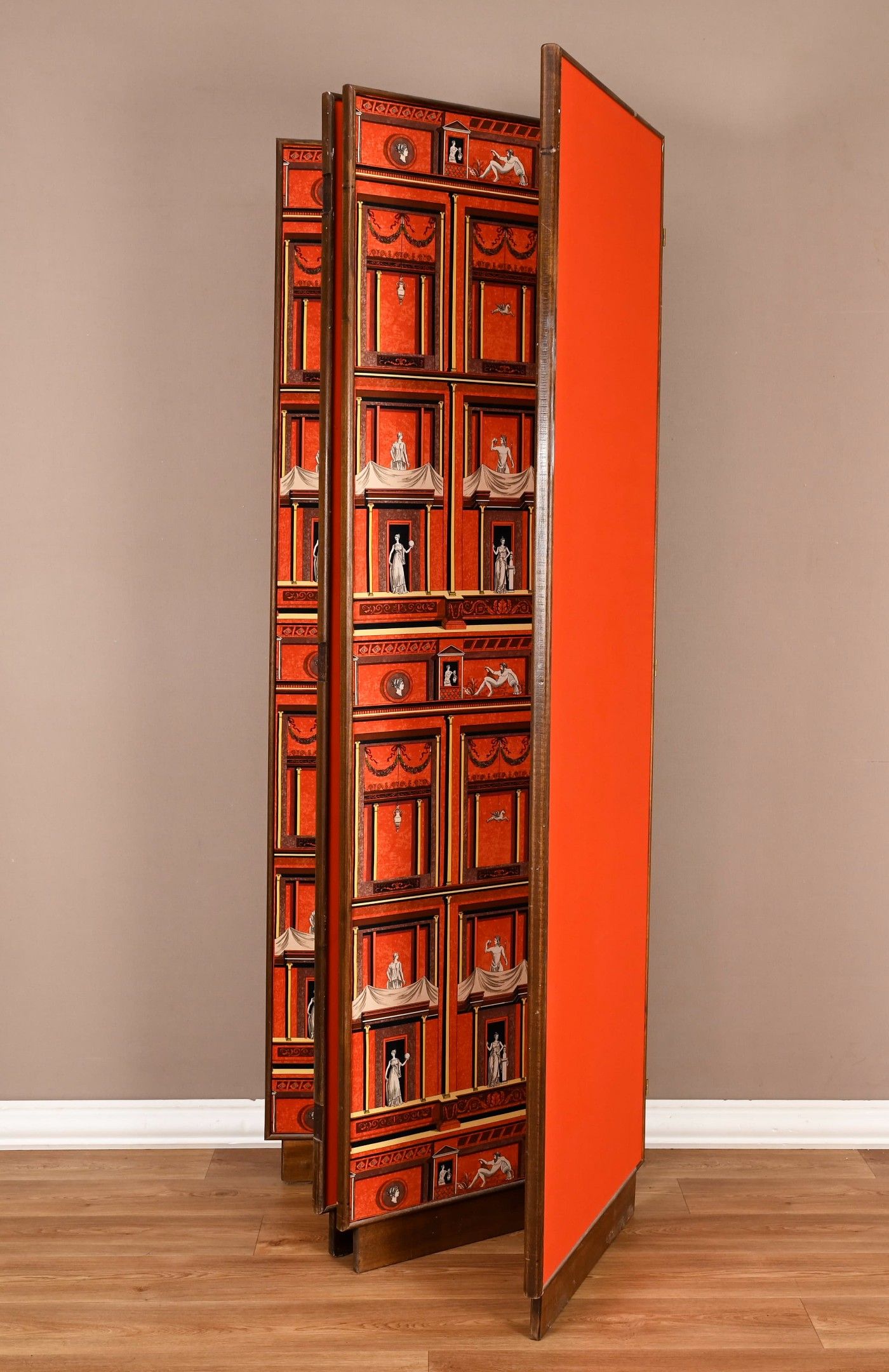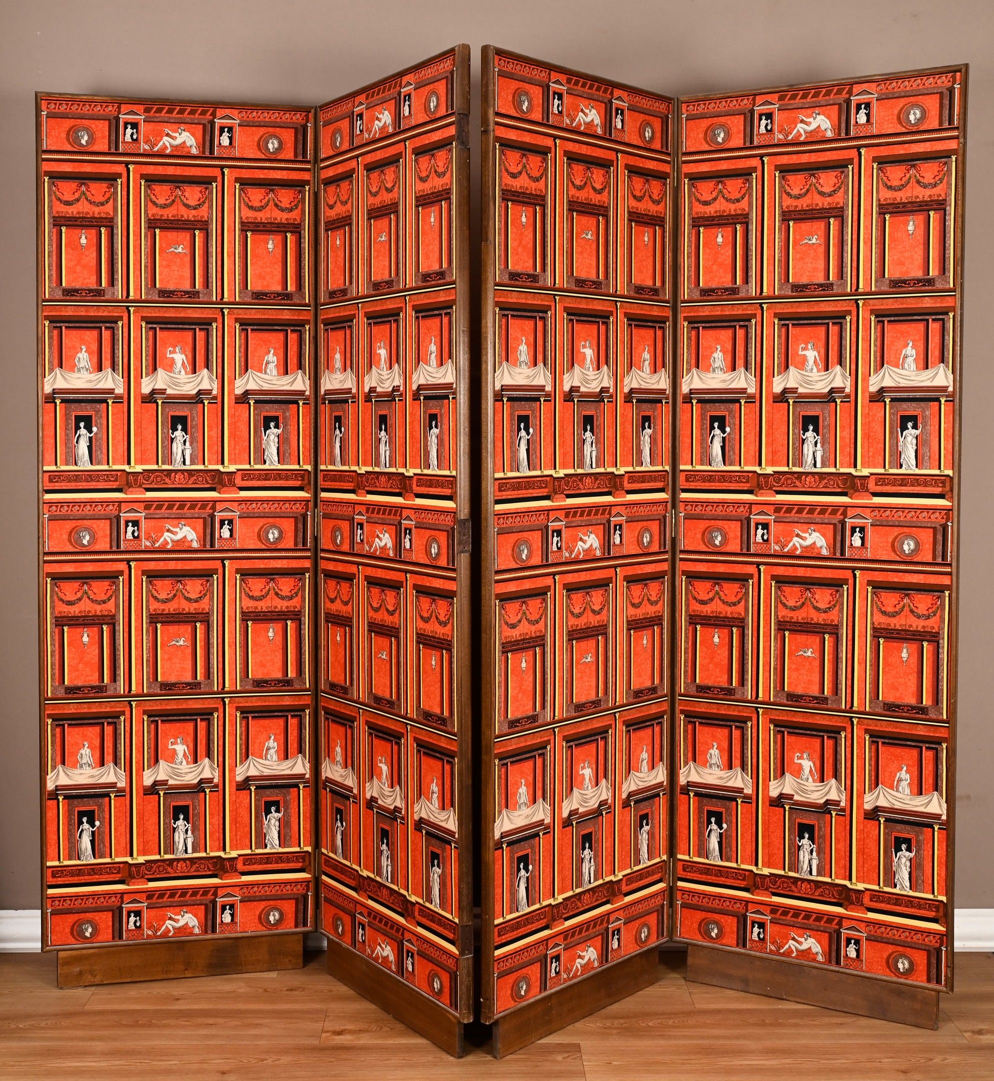 Piero Fornasetti (1913-1988) 2 Pompeian screens circa 1960 In wood and printed fabric, each with 2 leaves and brass hinges