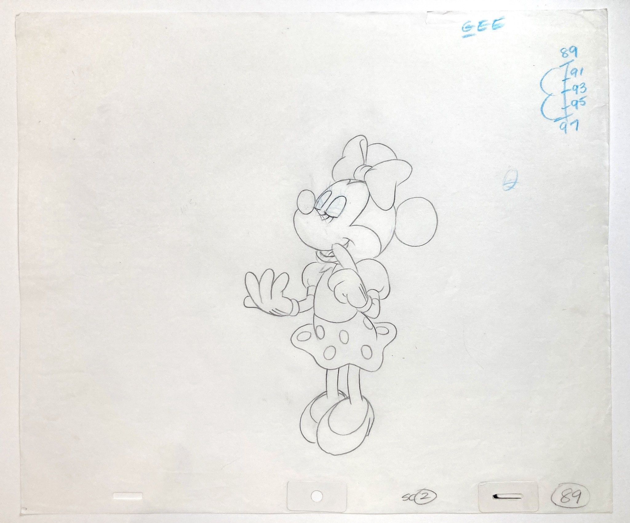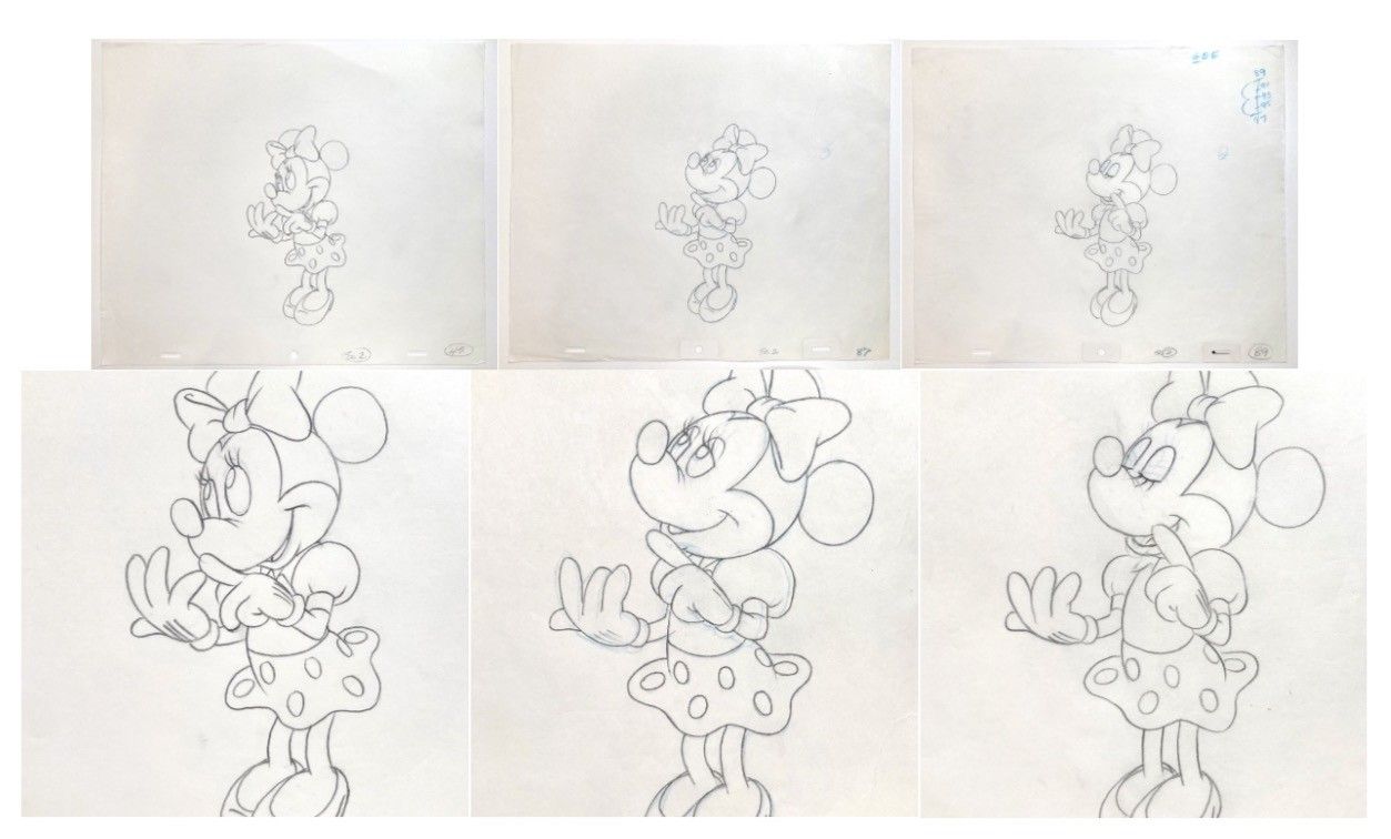 Set of three original animation drawings executed in coloured pencil and graphite, on animation paper