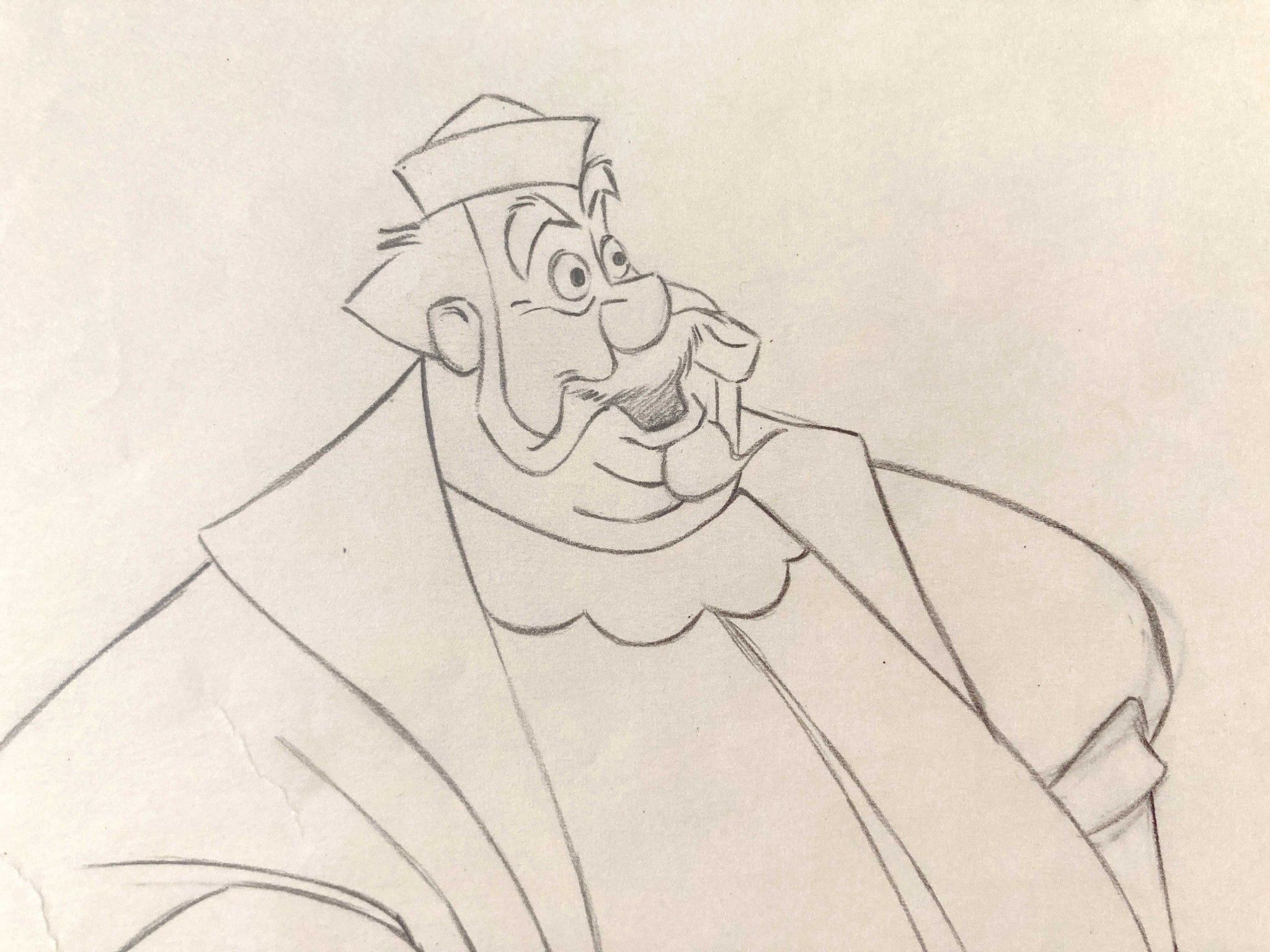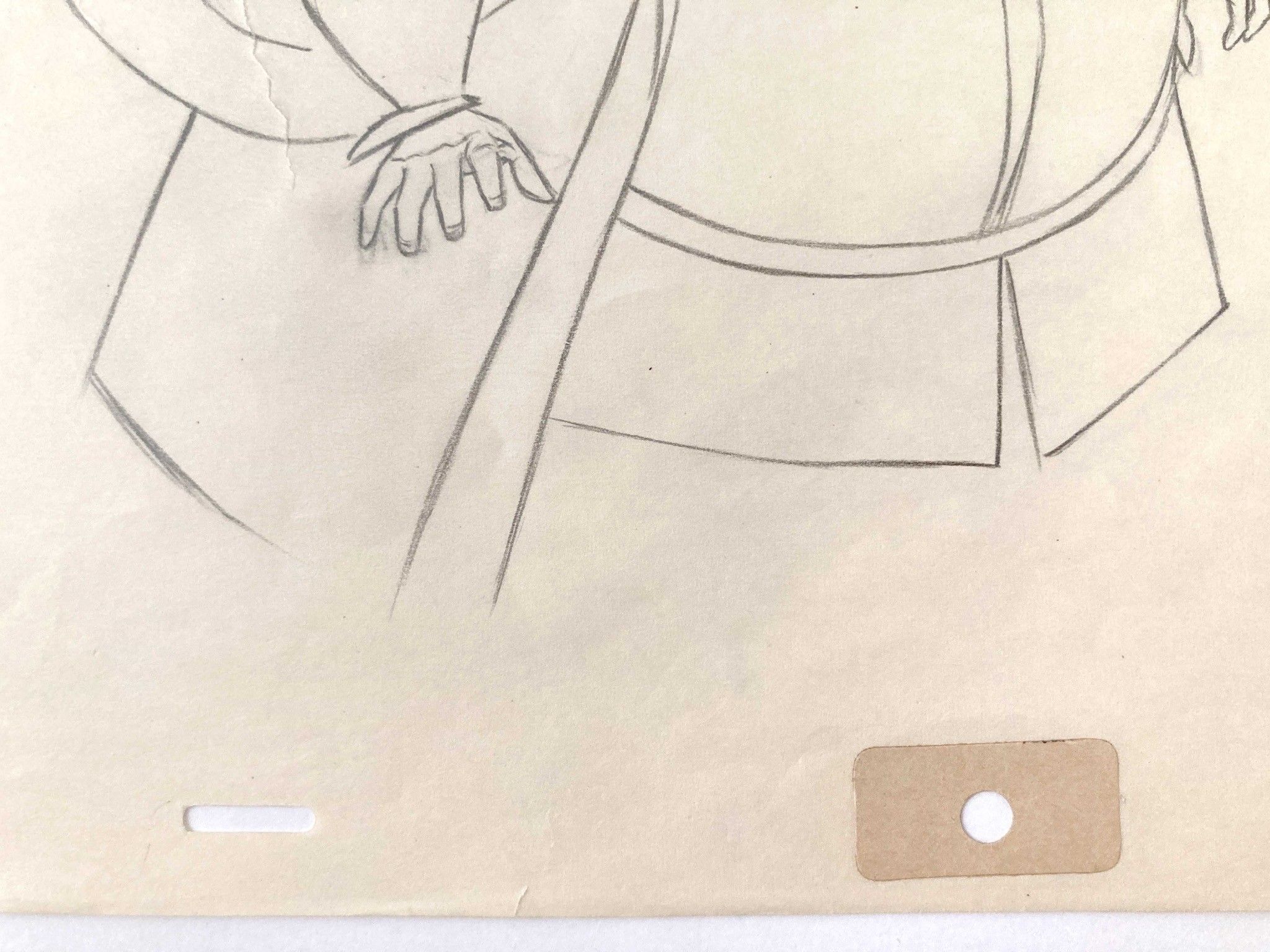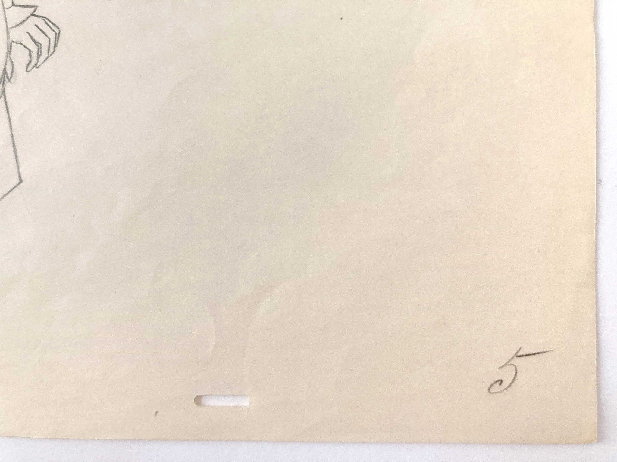 Expressive animated drawing in graphite pencil on three-hole punched production sheet.