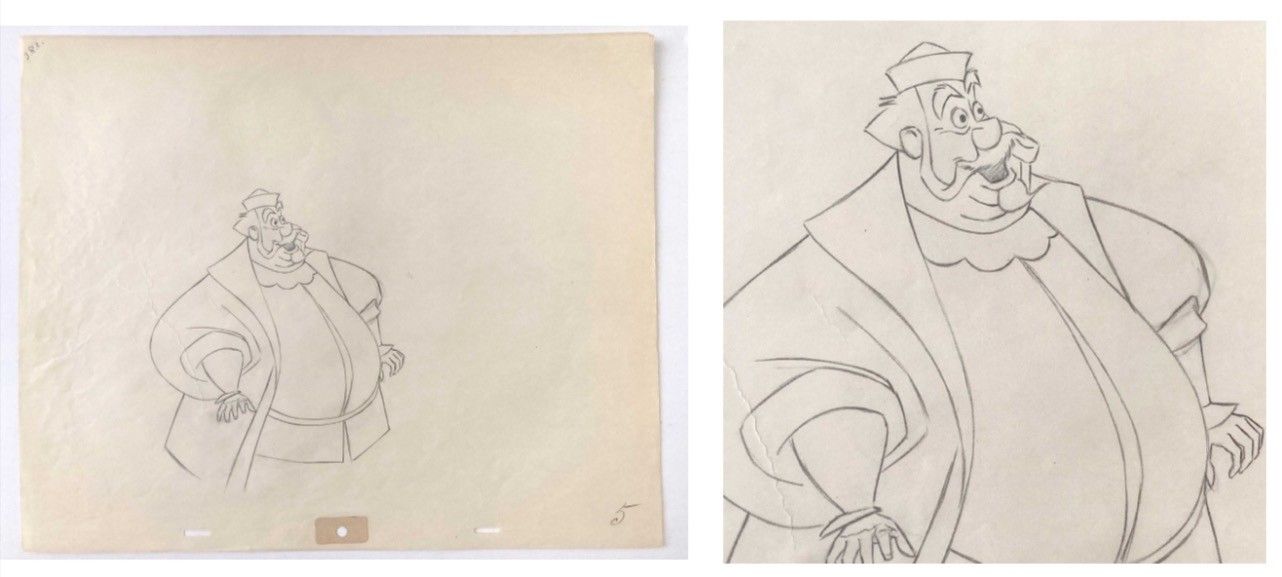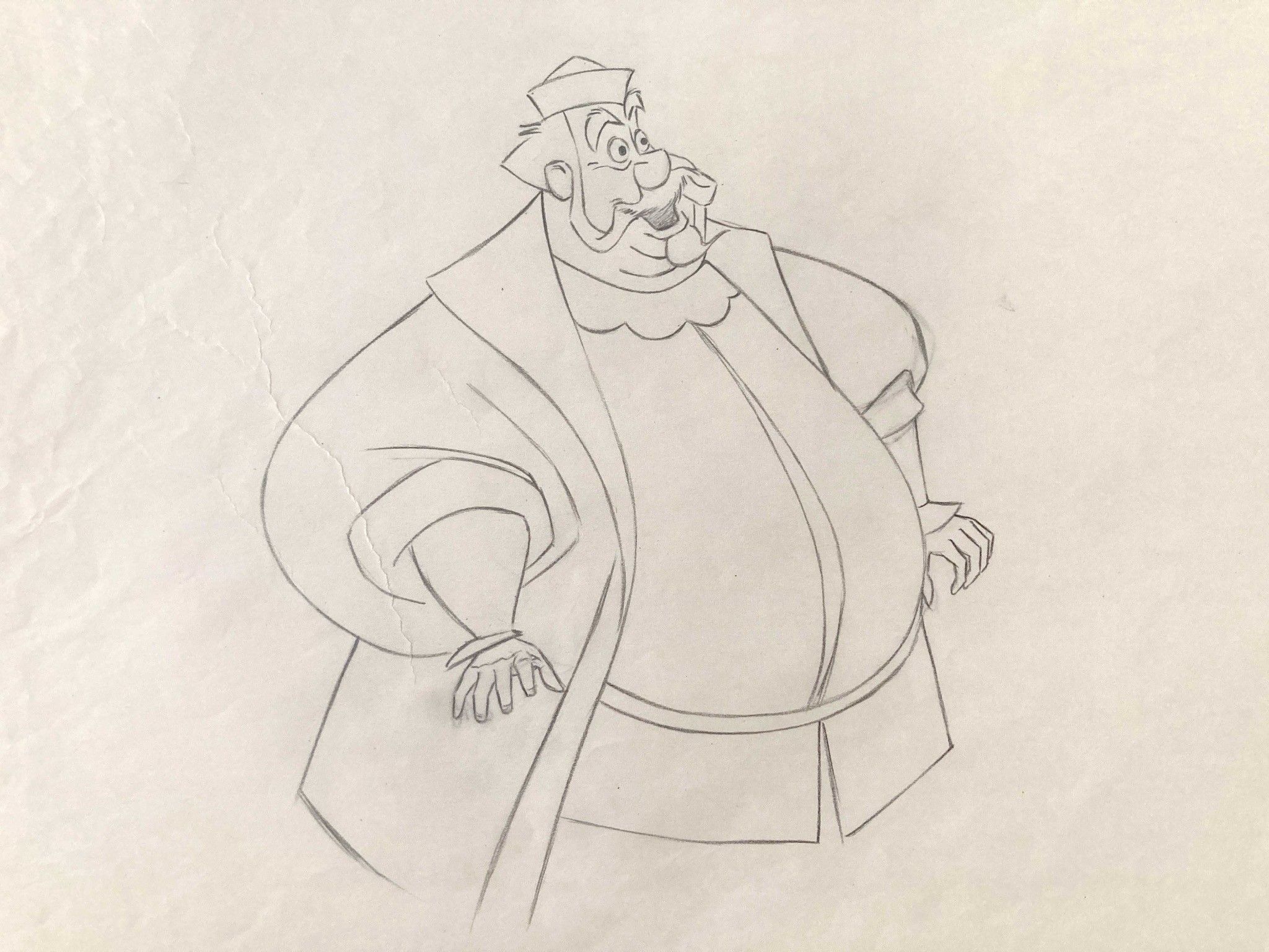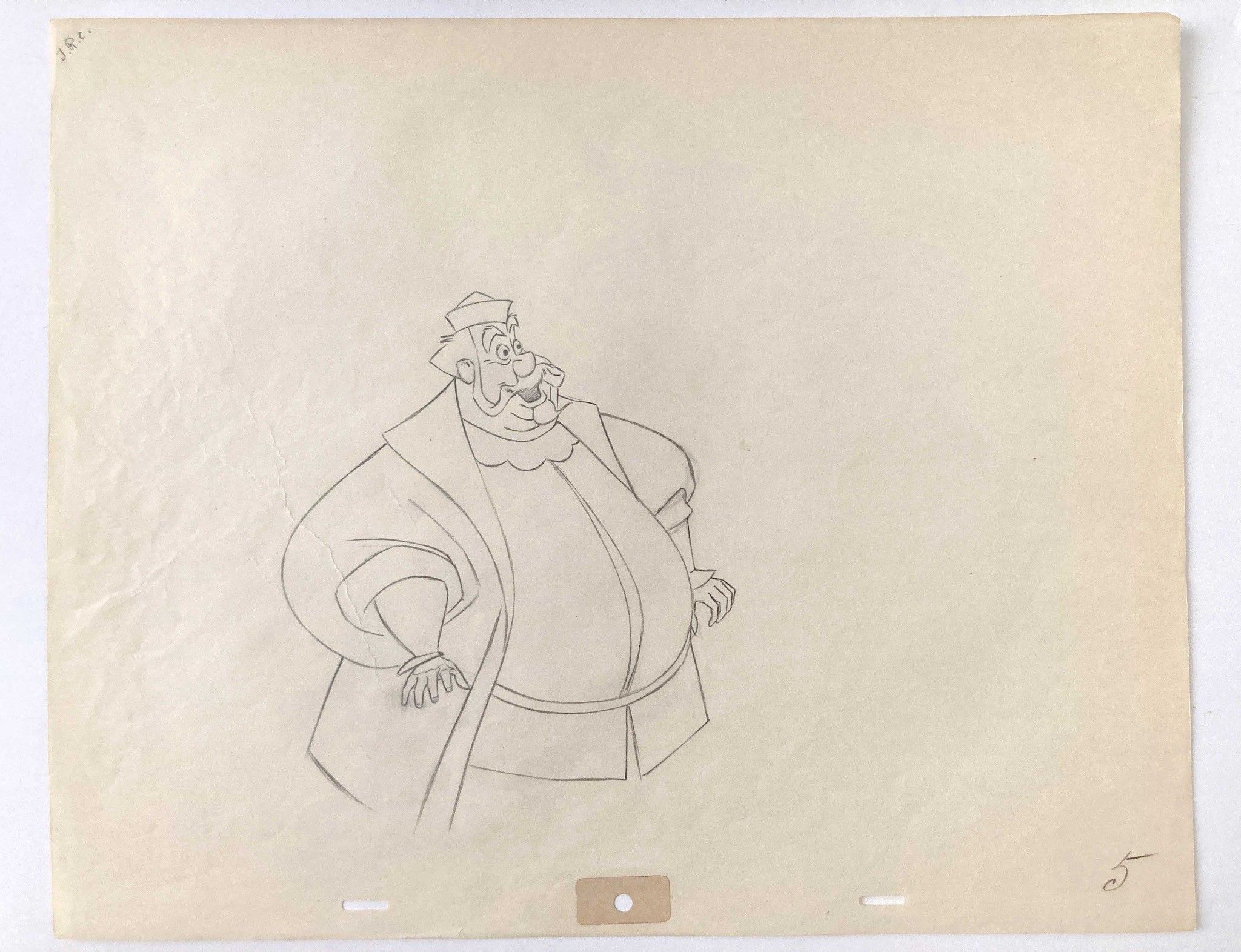 Expressive animated drawing in graphite pencil on three-hole punched production sheet.