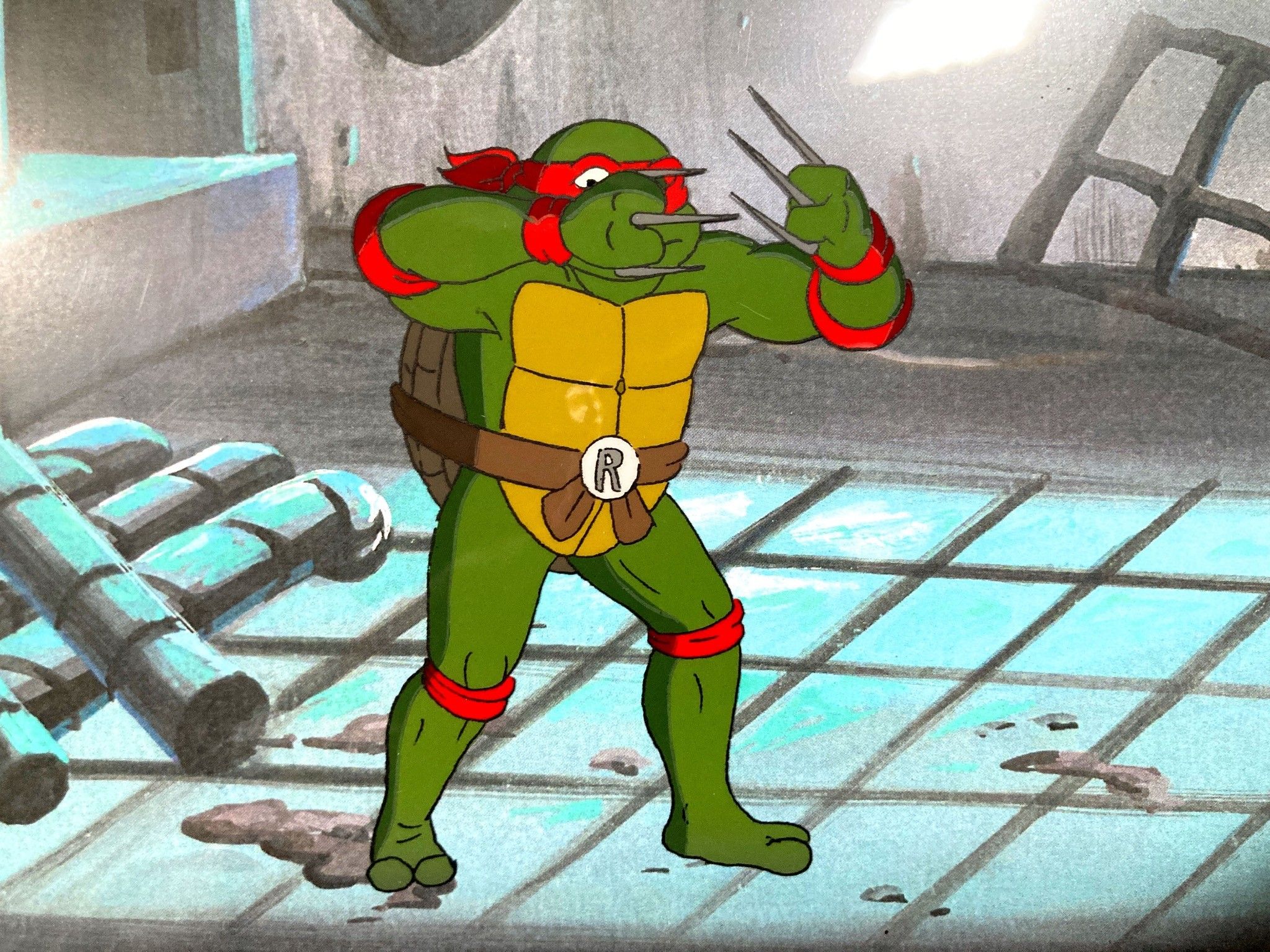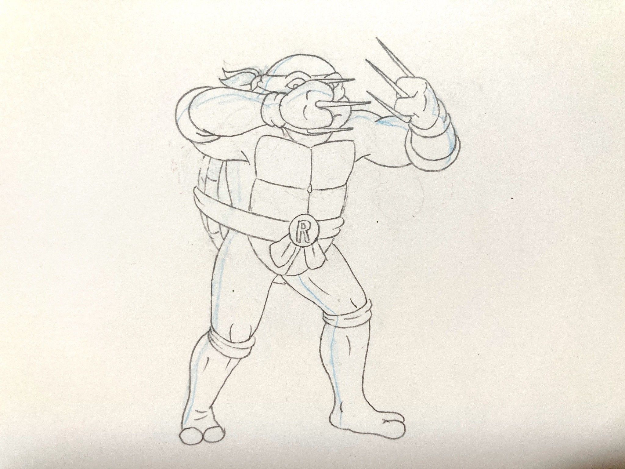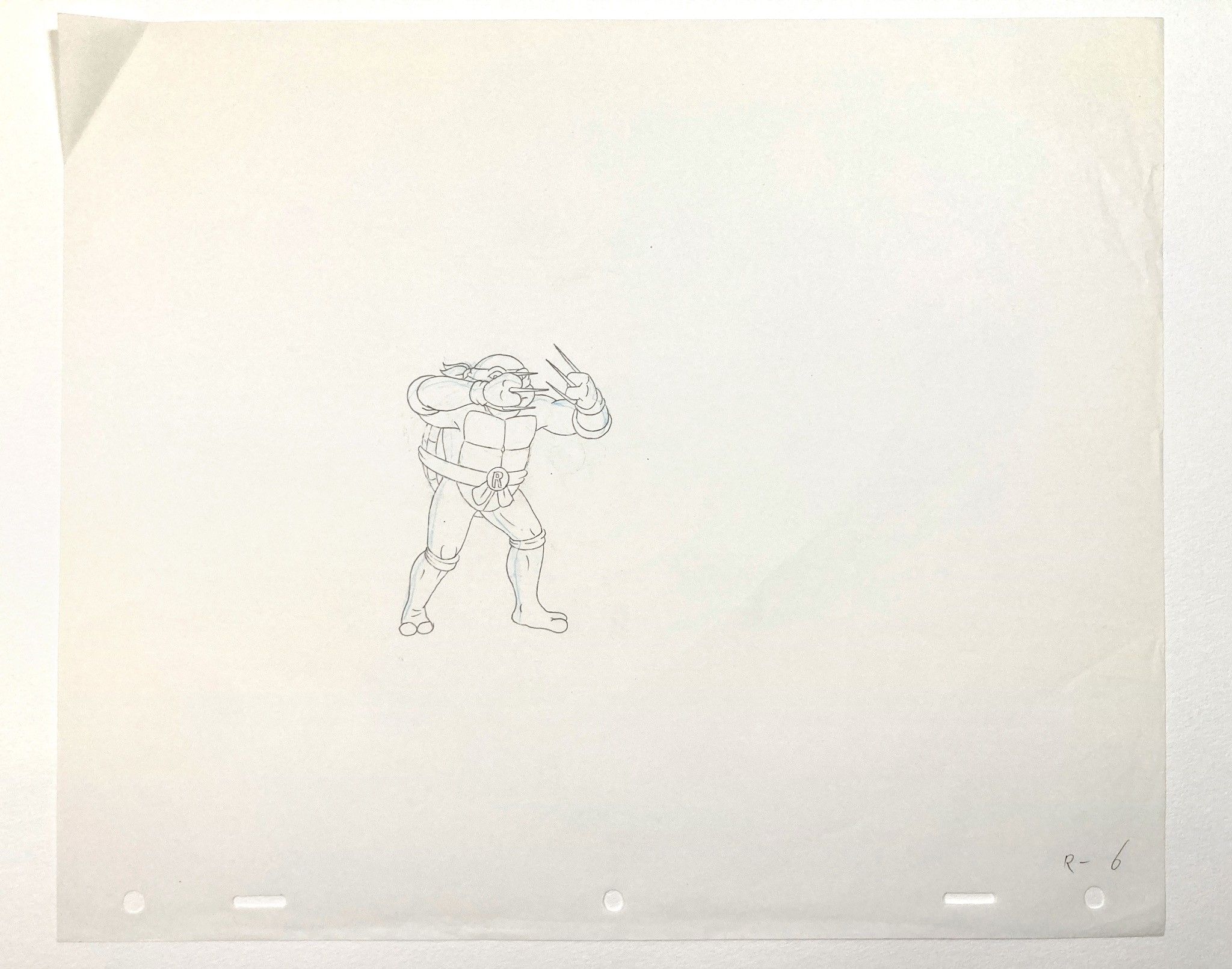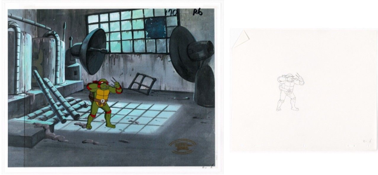 Original production celluloid in ink and gouache on a printed background, accompanied by an original animation drawing in graphite pencil and blue crayon.