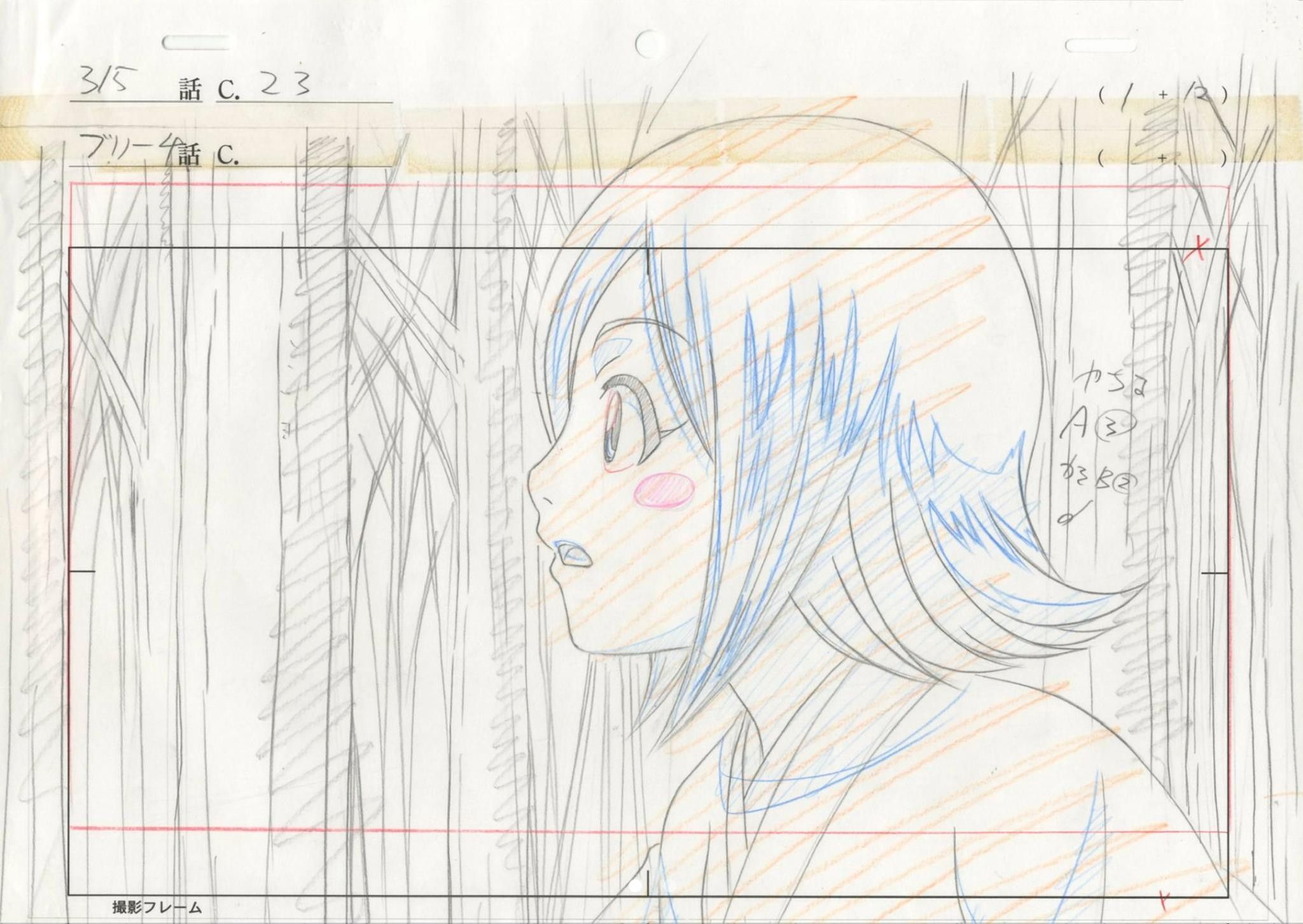 Original layout in graphite and coloured pencils accompanied by its original genga in graphite and coloured pencils