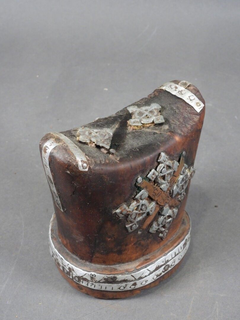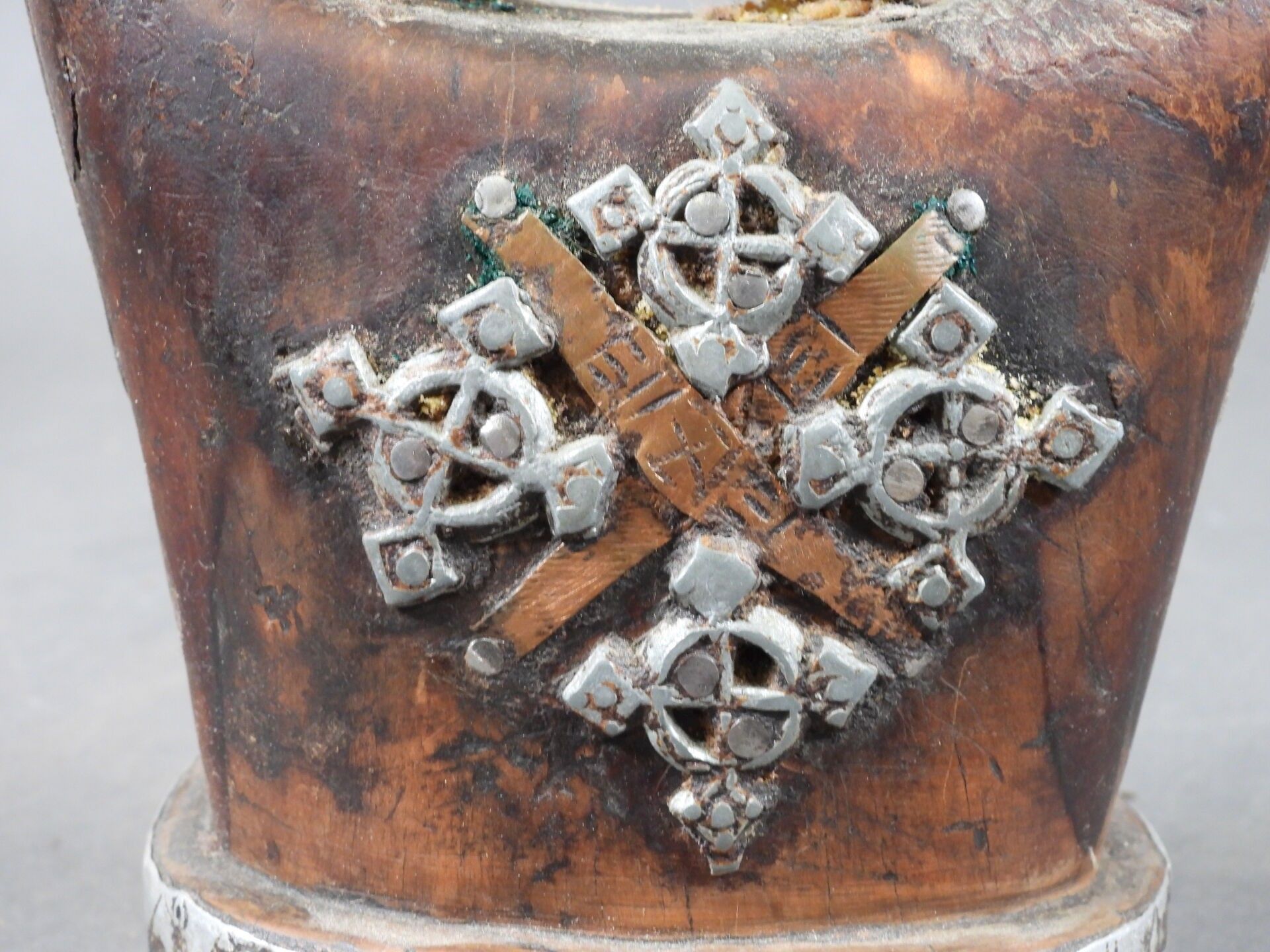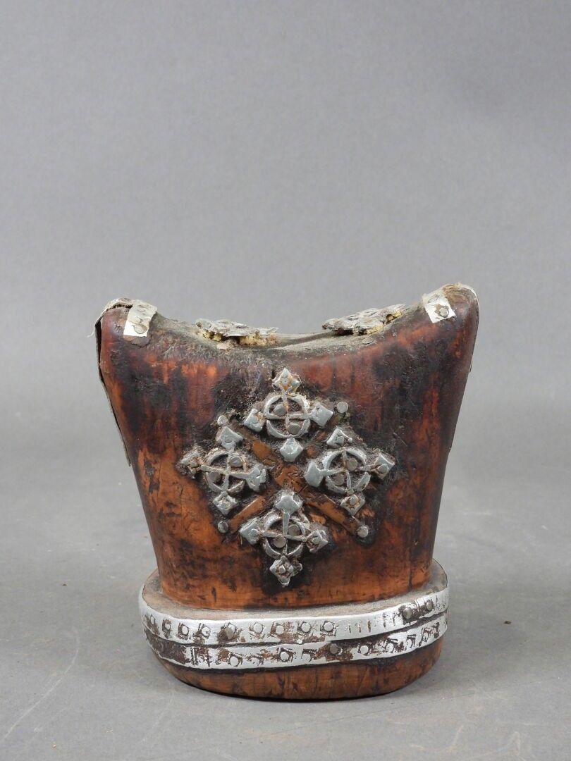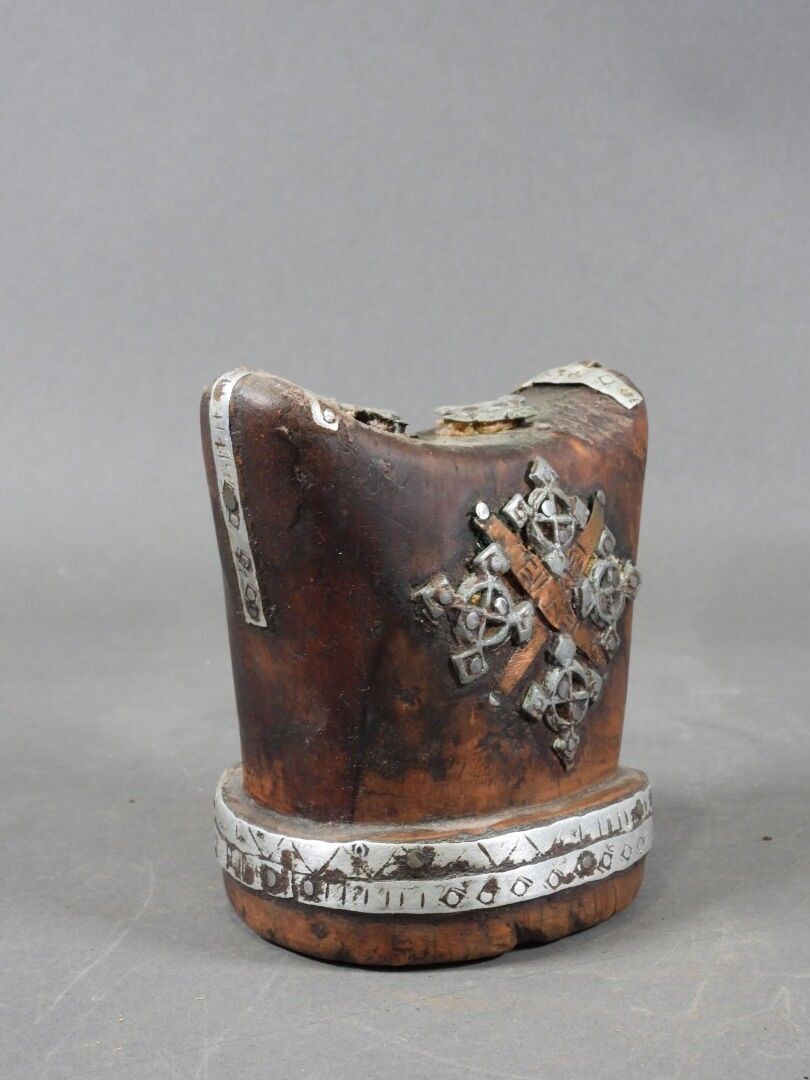 Hardwood, patina of use, richly decorated with inlays of metallic elements.