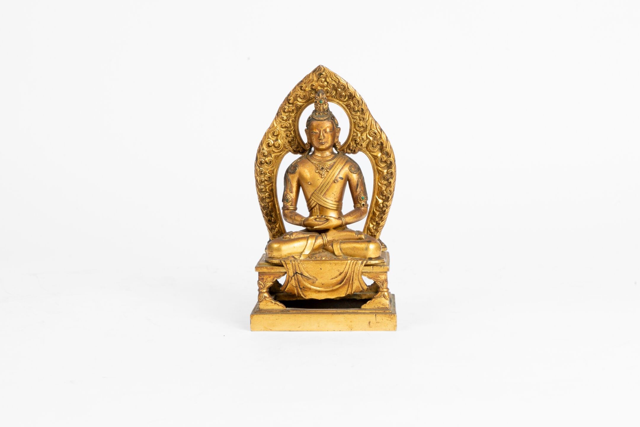 Gilded bronze statuette representing the boddhisatva avalokiteshvara seated in meditation, his face with half-closed eyes expressing serenity is surmounted by a diadem surrounding his hair braided in a chignon. The base features a double vajra. He is seated on a quadrangular base surrounded by a mandorla finely carved with stylised clouds and flames.