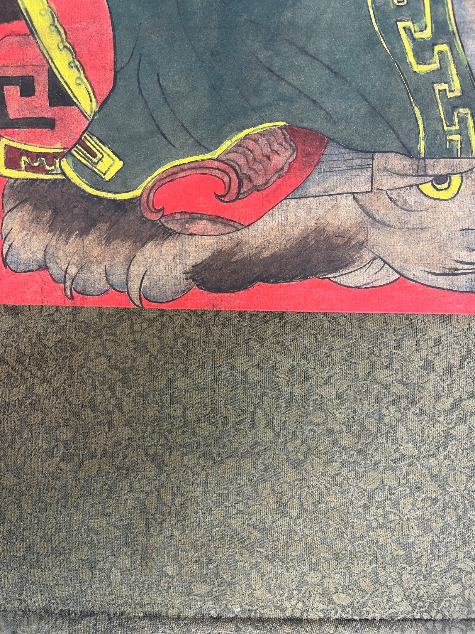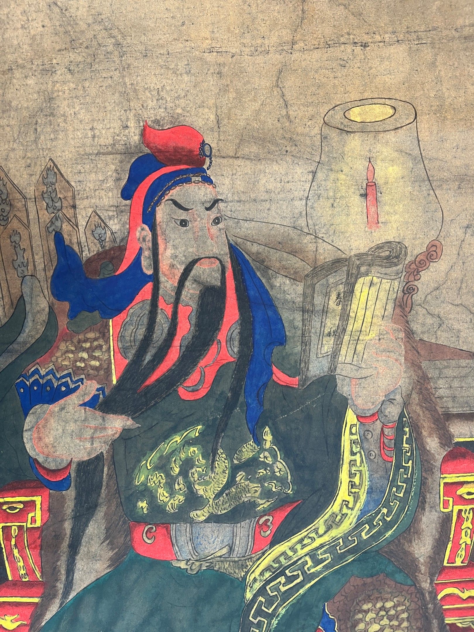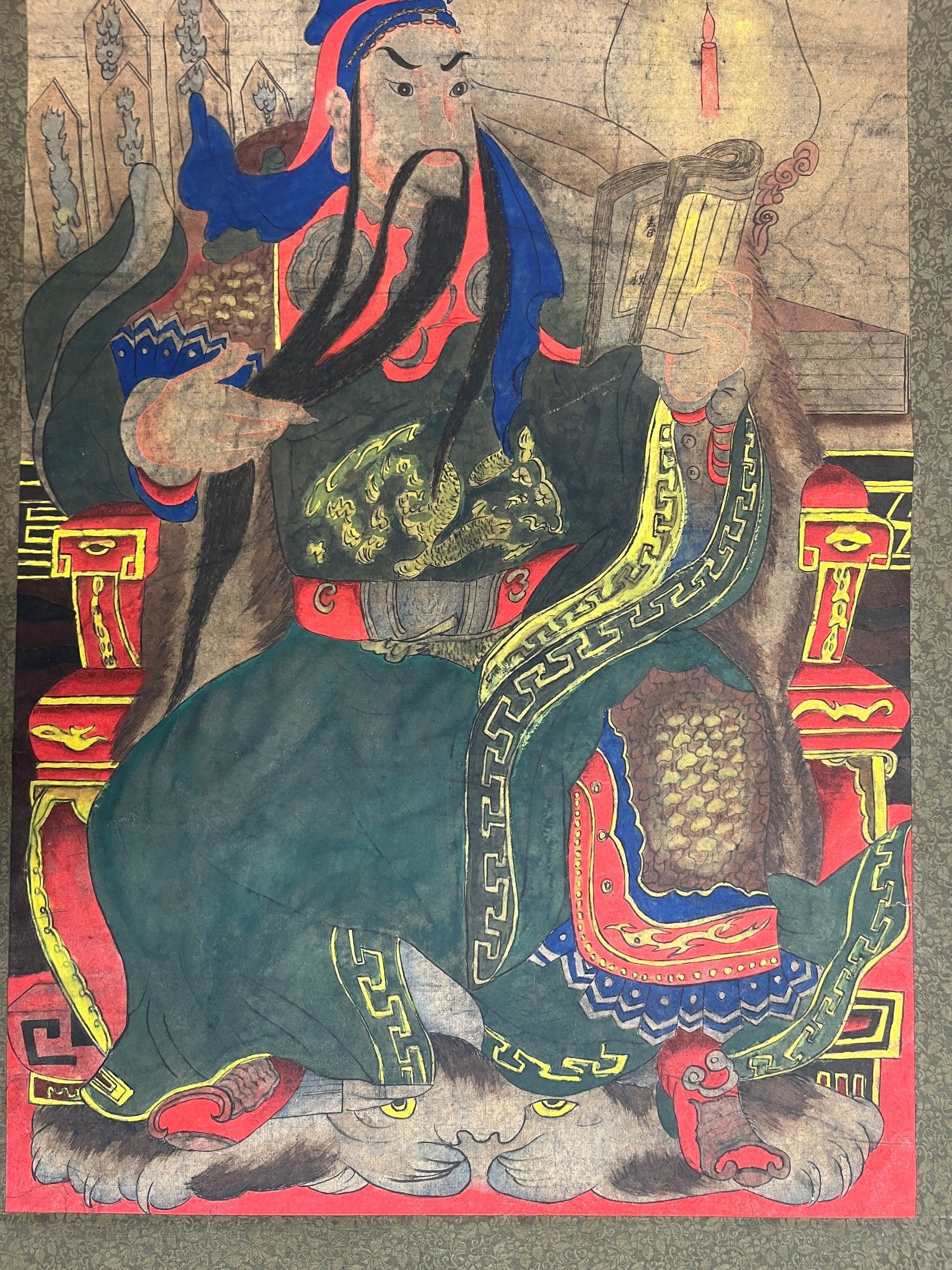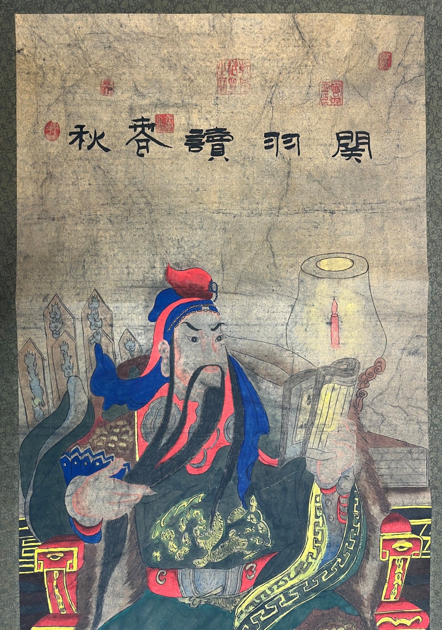 Reunion of three paintings on silk or paper mounted on a scroll depicting the Chinese General Guan YU from the end of the Han dynasty and the beginning of the Three Kingdoms period reading the annals of the times and autumn attributed to Confucius, court scene and tiger.