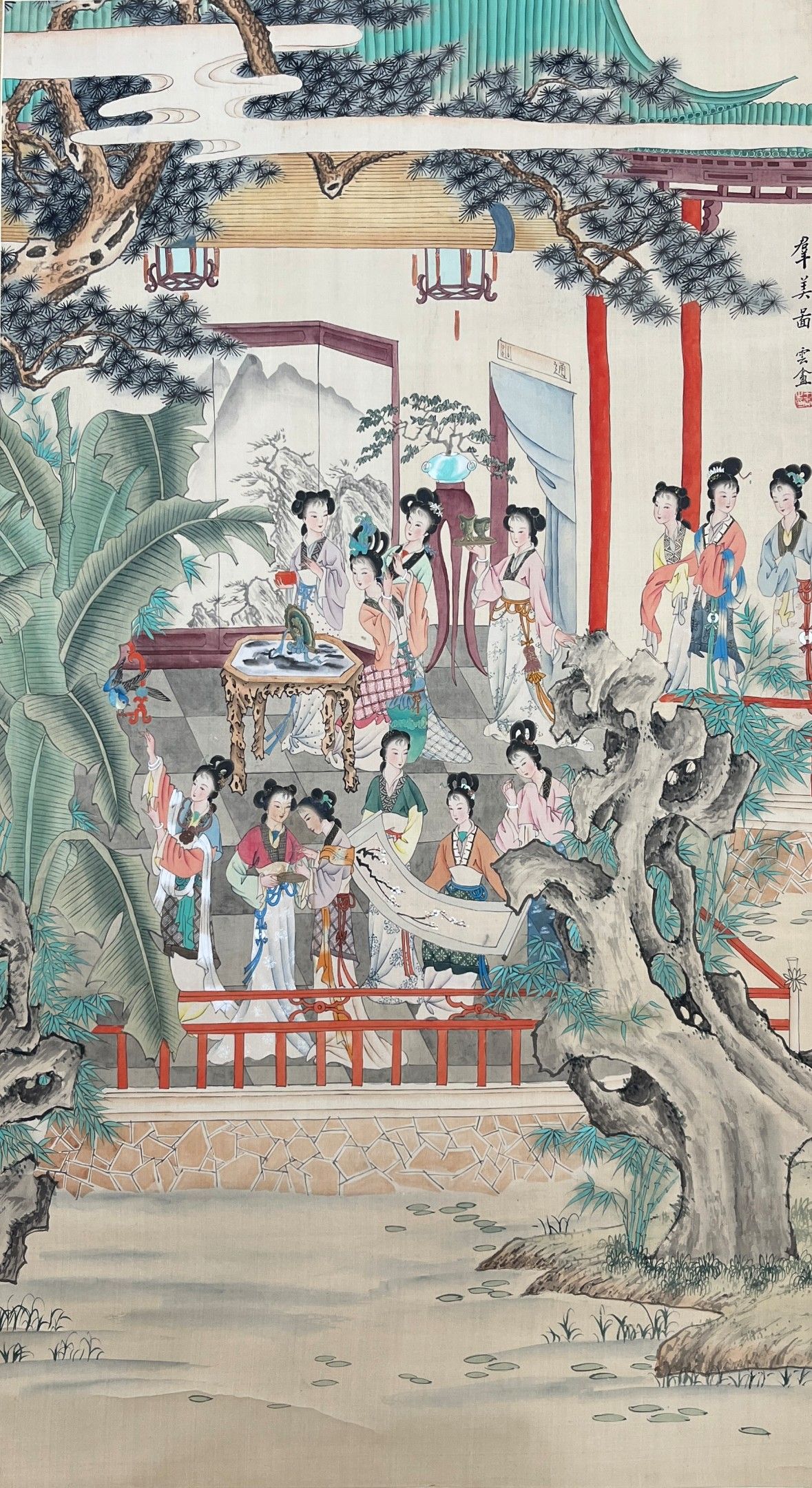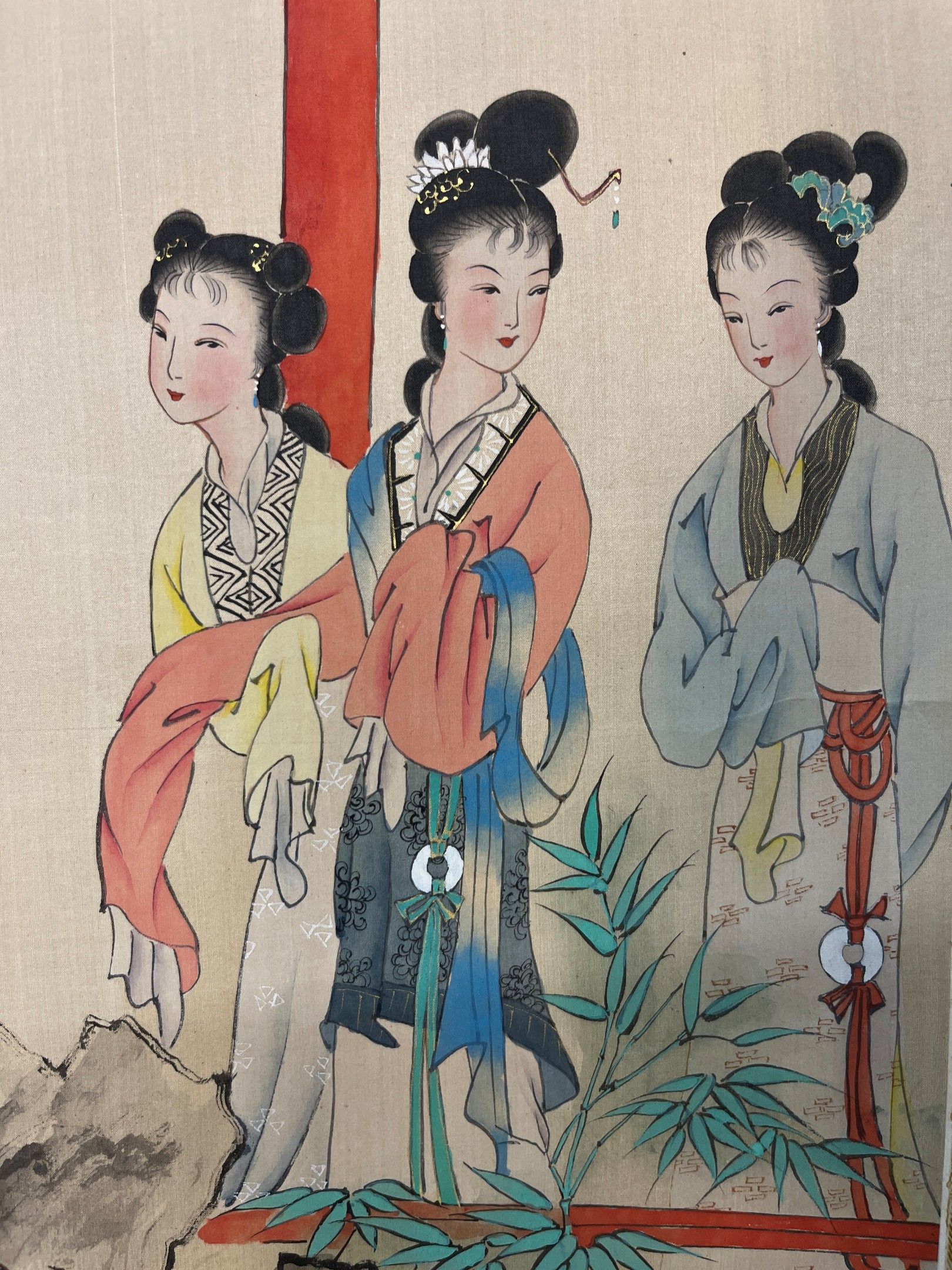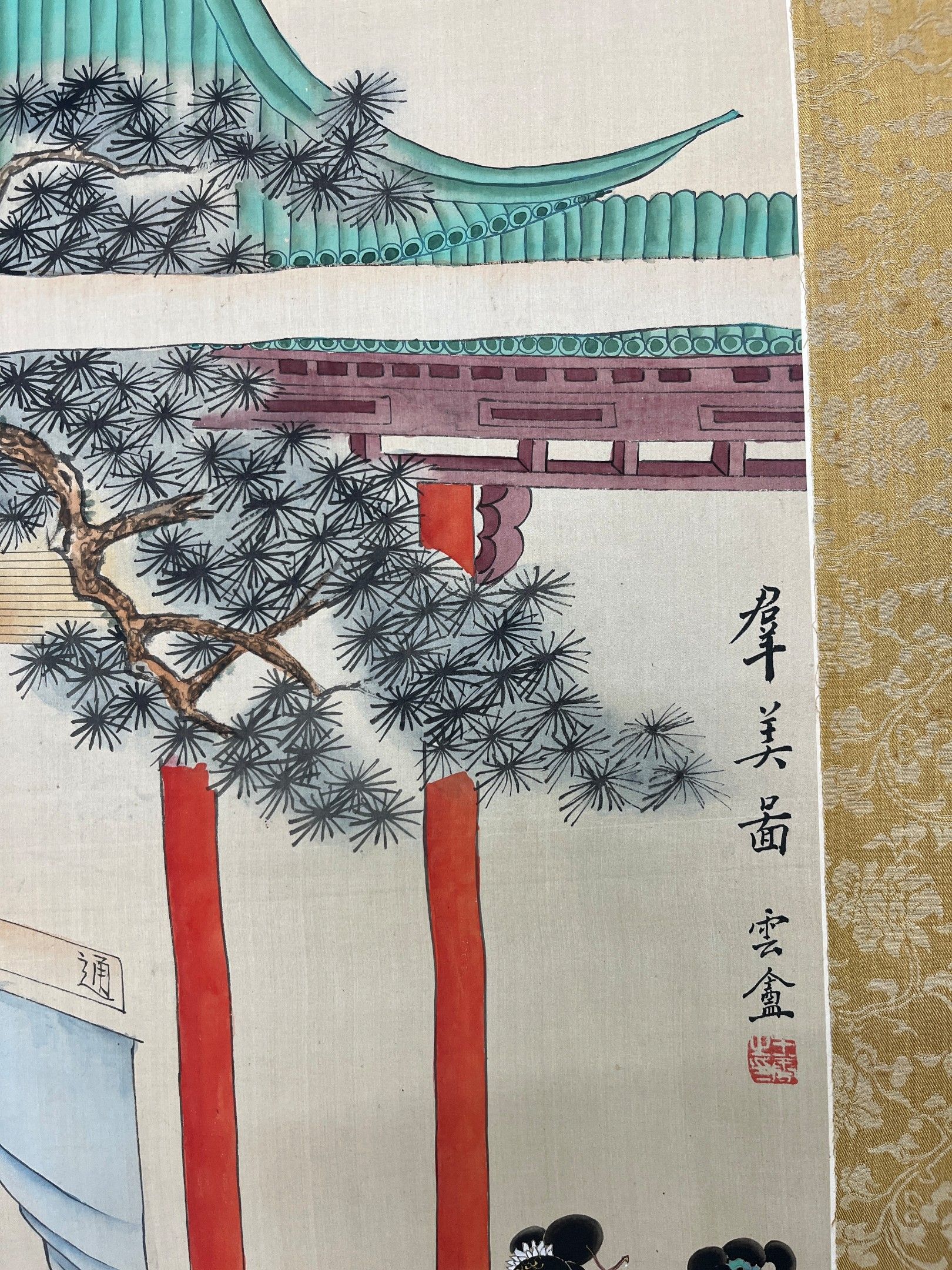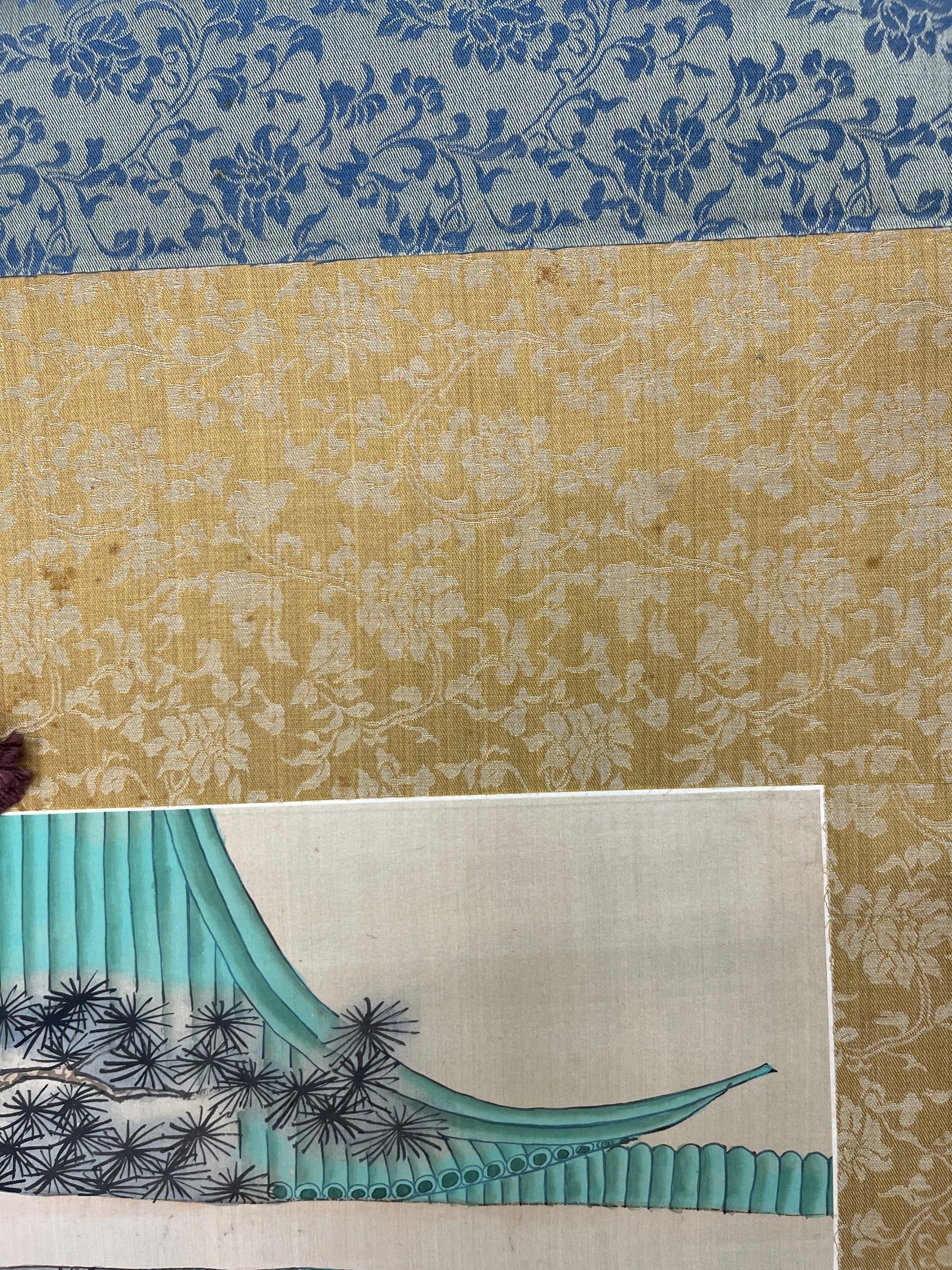 Reunion of three paintings on silk or paper mounted on a scroll depicting the Chinese General Guan YU from the end of the Han dynasty and the beginning of the Three Kingdoms period reading the annals of the times and autumn attributed to Confucius, court scene and tiger.