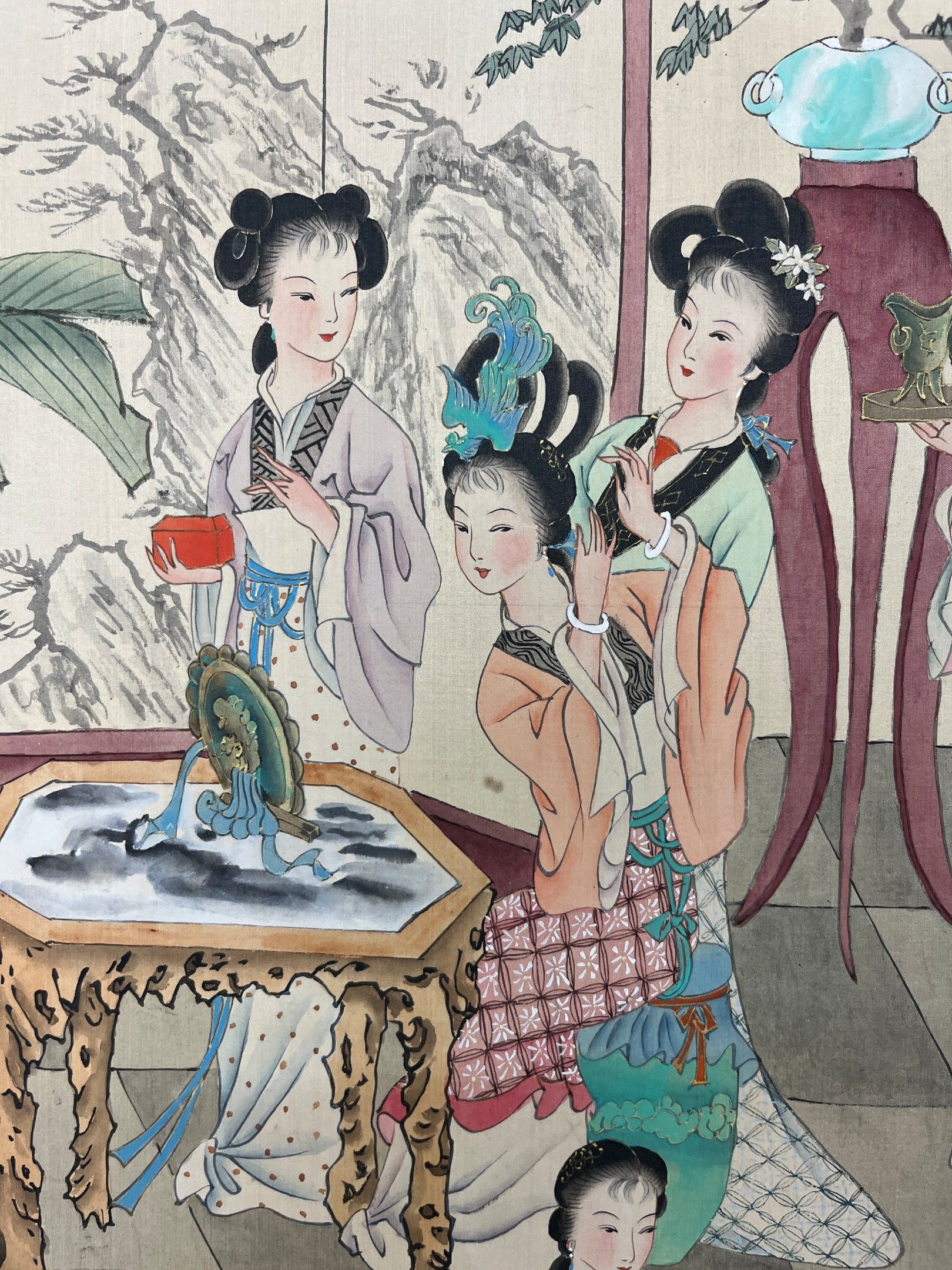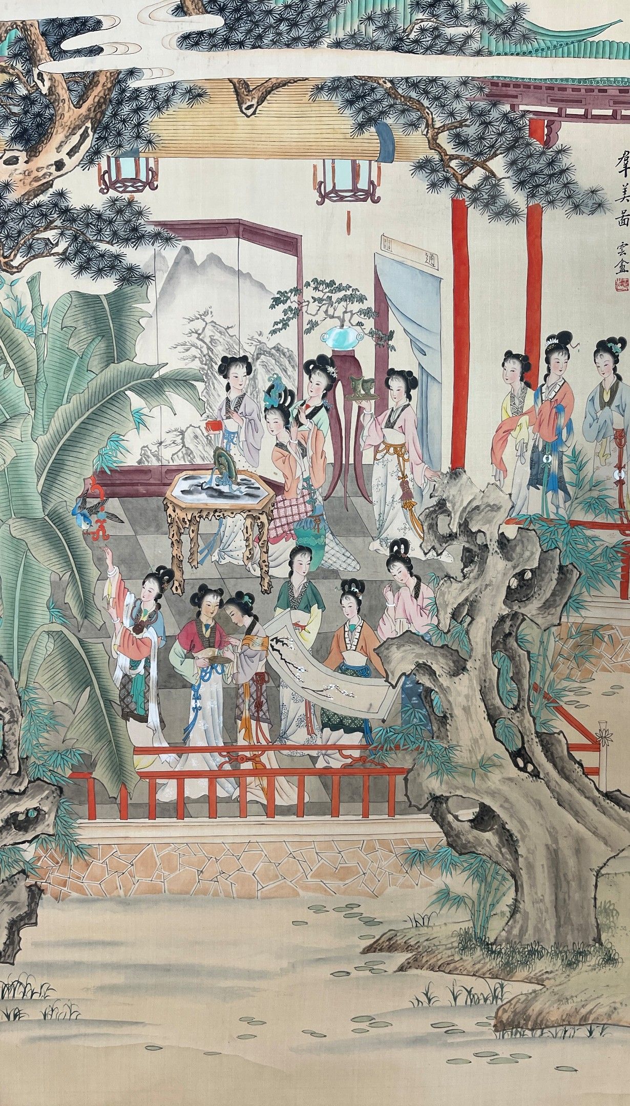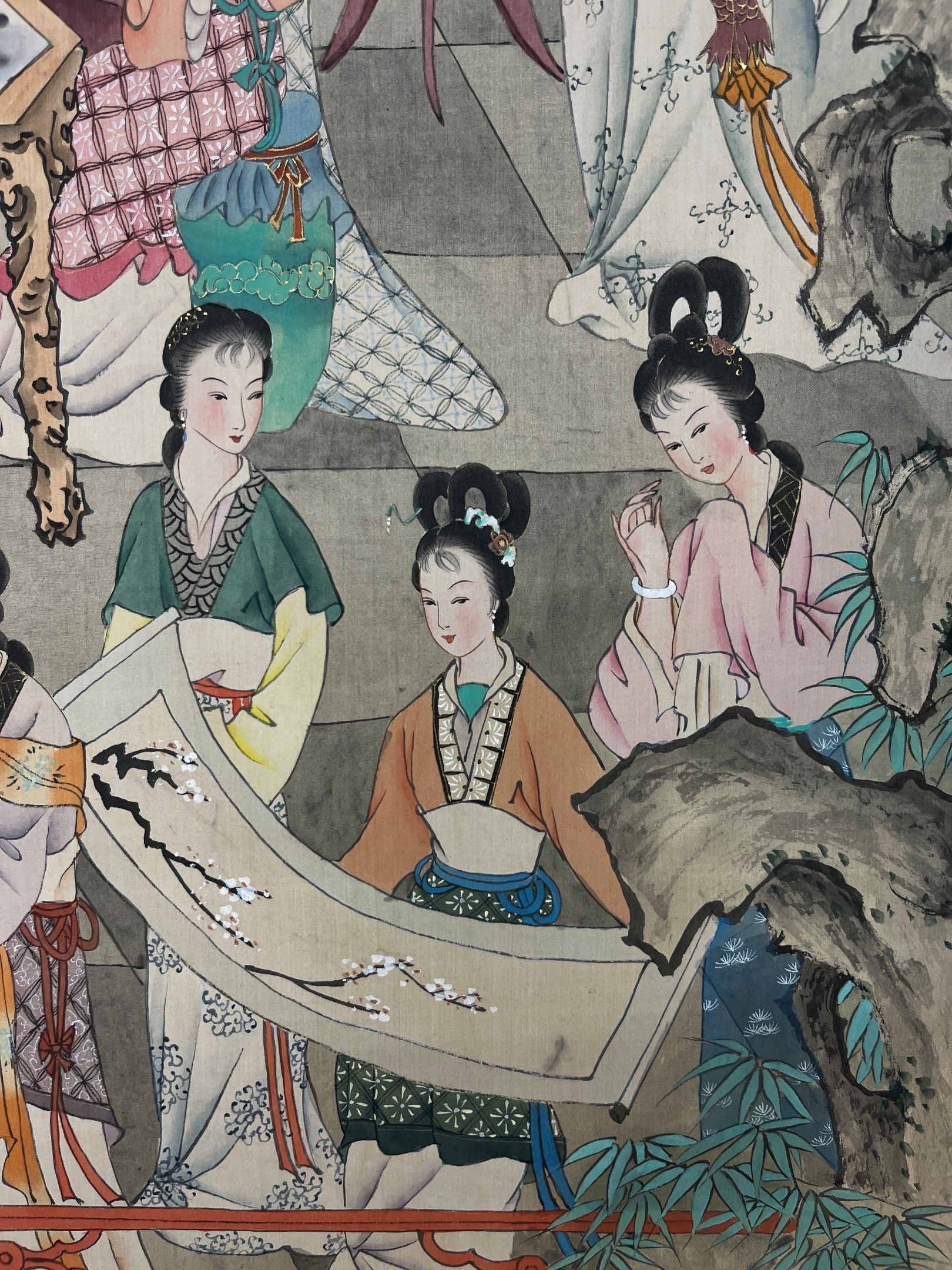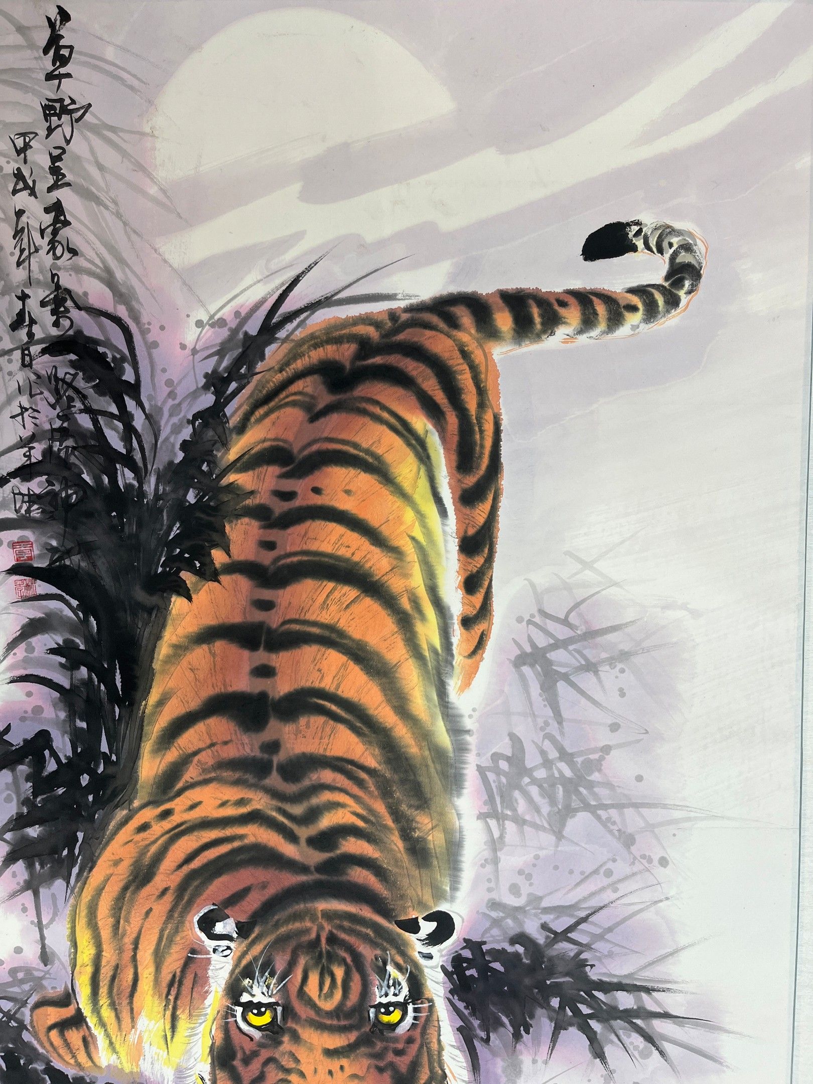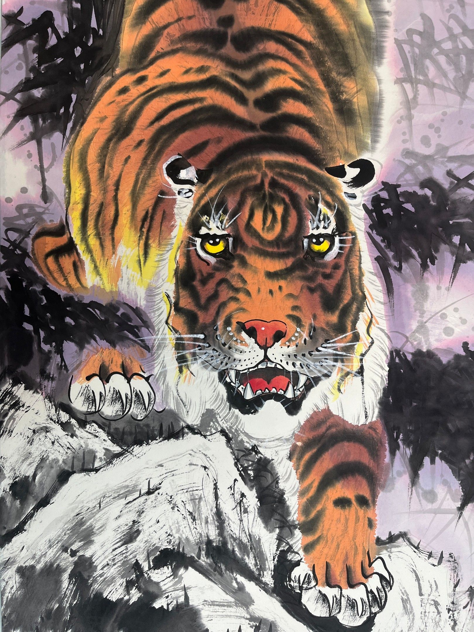 Reunion of three paintings on silk or paper mounted on a scroll depicting the Chinese General Guan YU from the end of the Han dynasty and the beginning of the Three Kingdoms period reading the annals of the times and autumn attributed to Confucius, court scene and tiger.