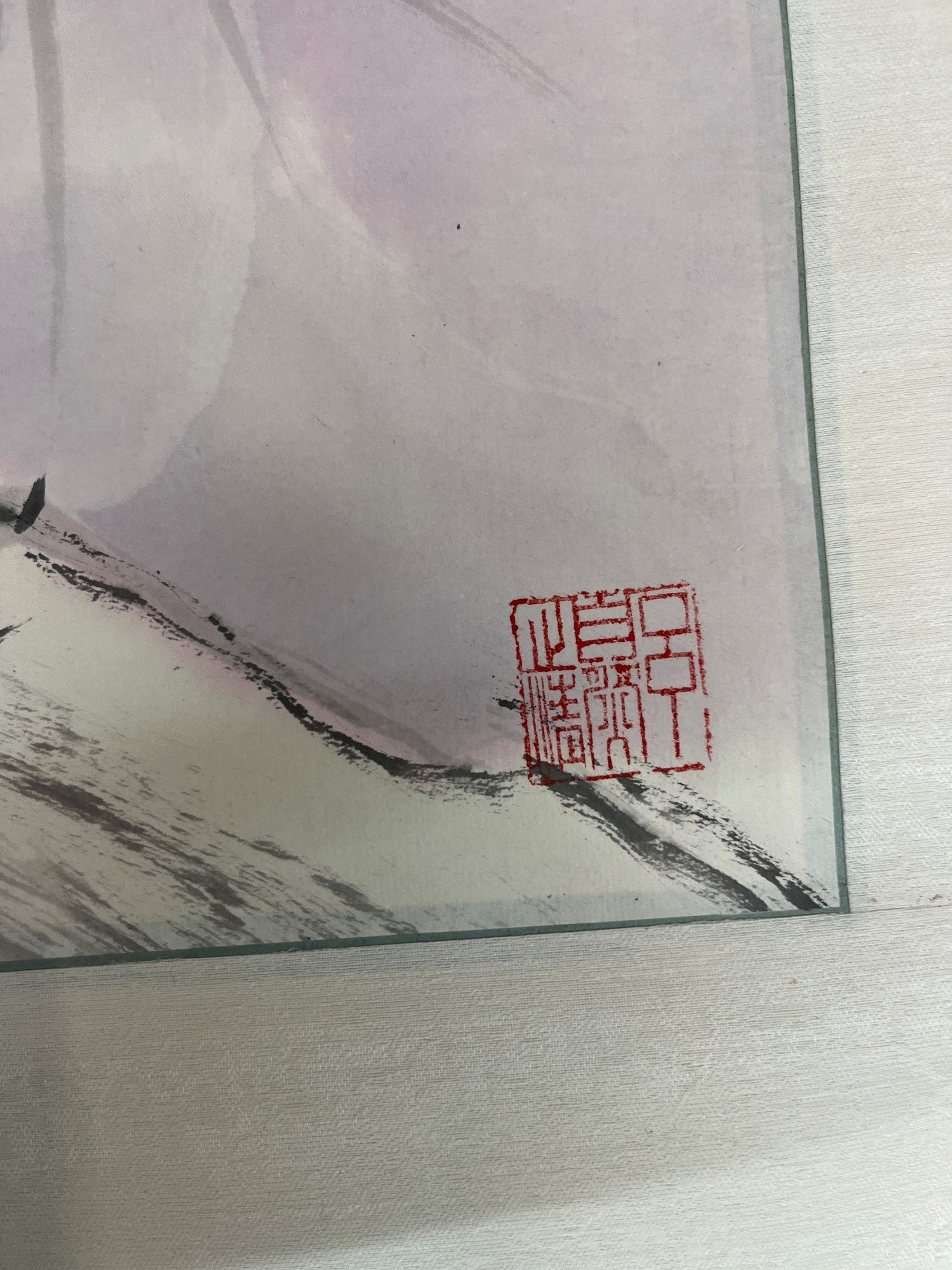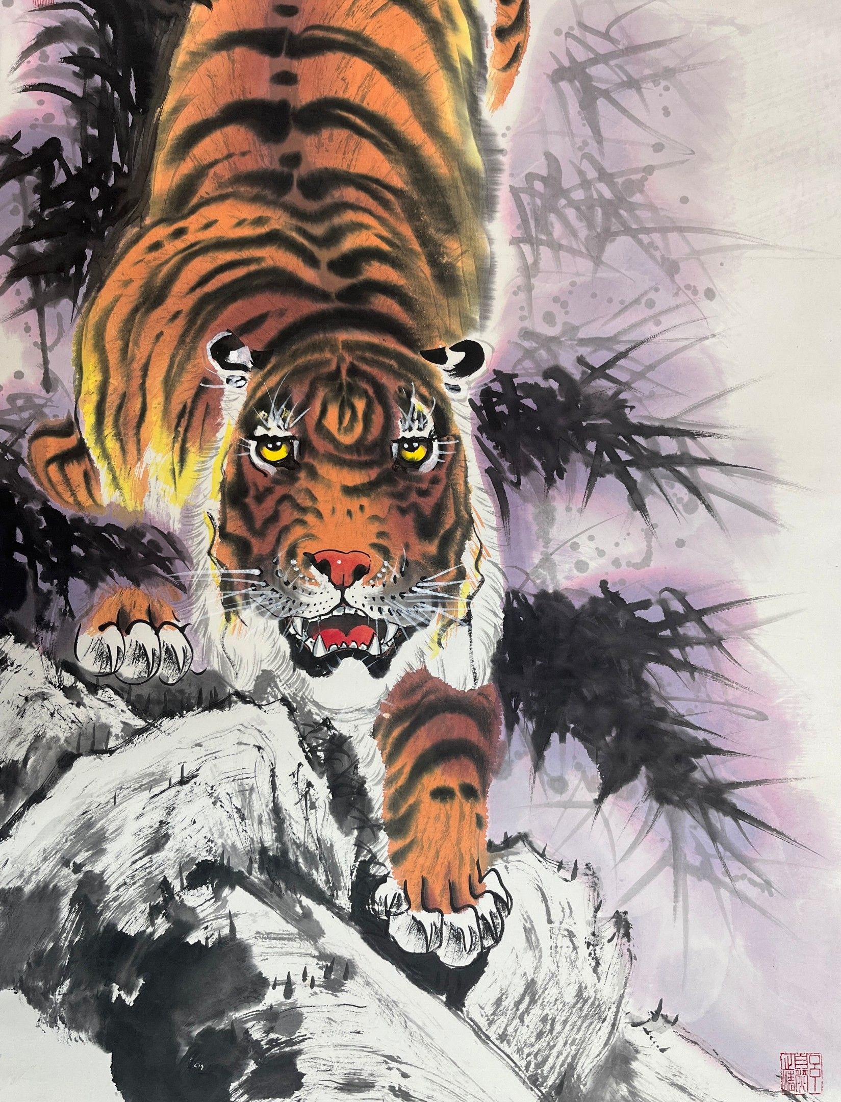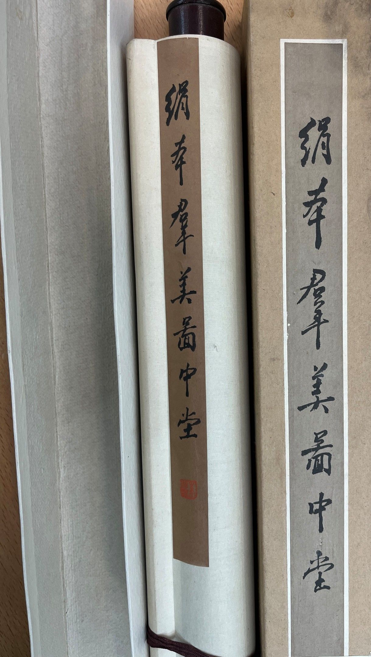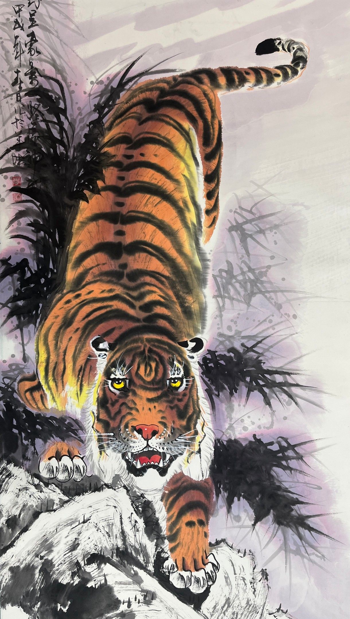 Reunion of three paintings on silk or paper mounted on a scroll depicting the Chinese General Guan YU from the end of the Han dynasty and the beginning of the Three Kingdoms period reading the annals of the times and autumn attributed to Confucius, court scene and tiger.