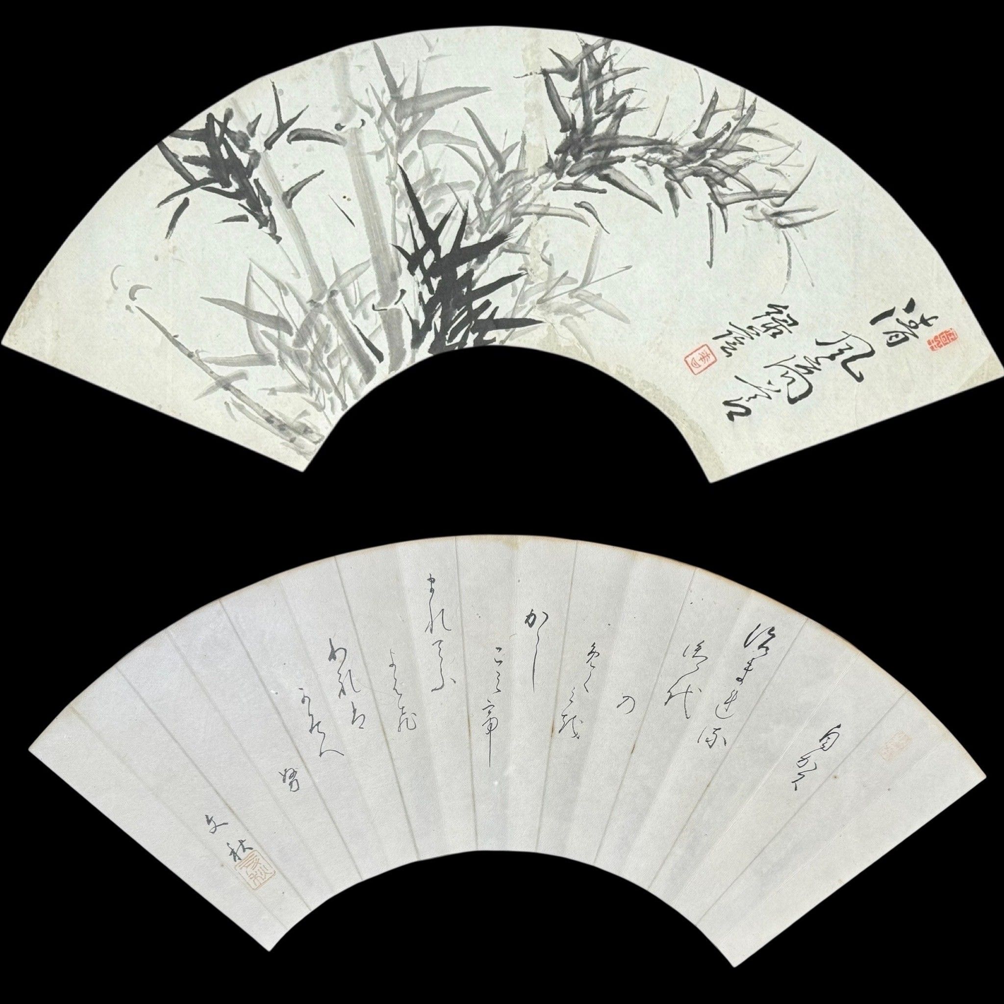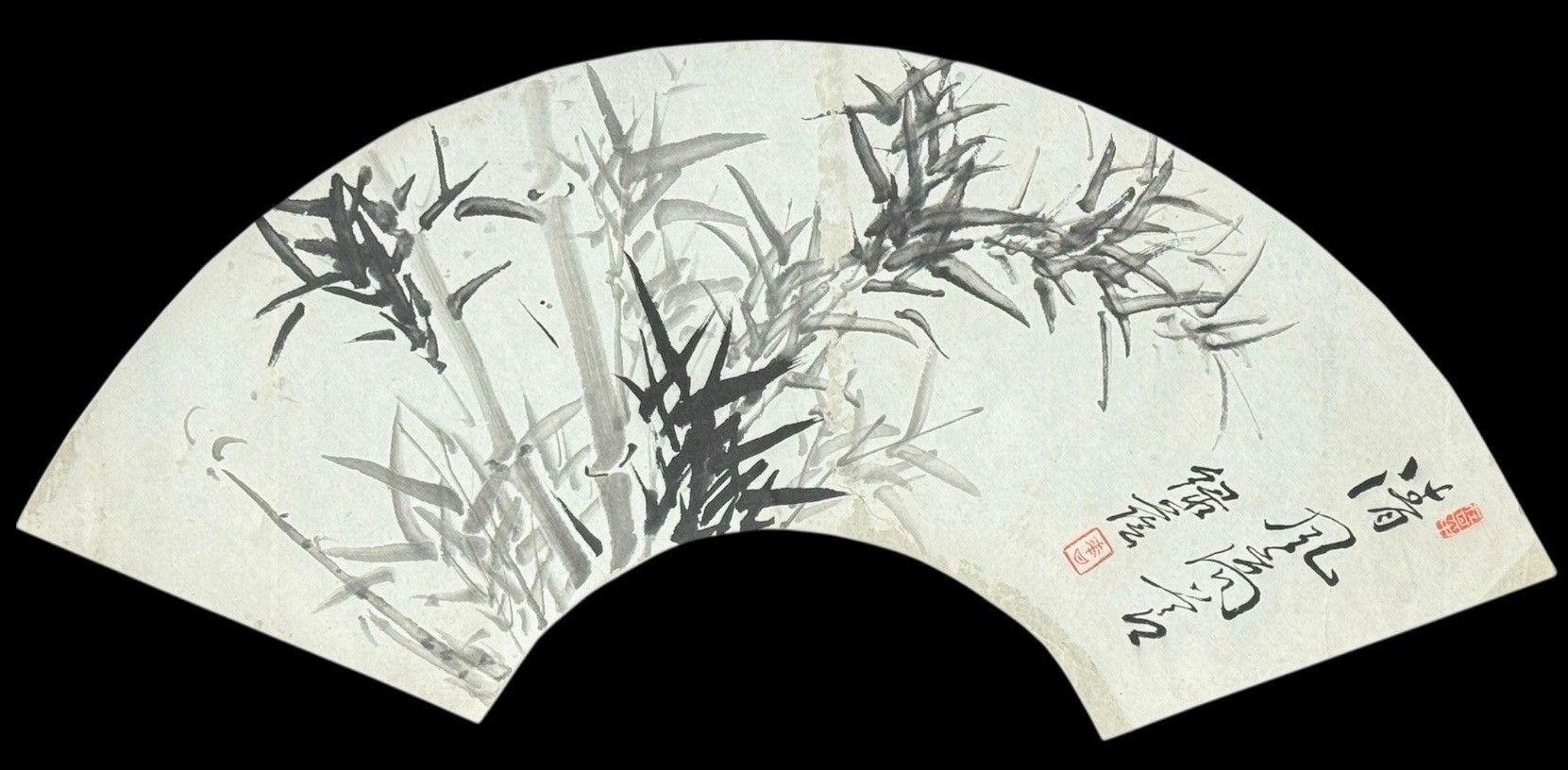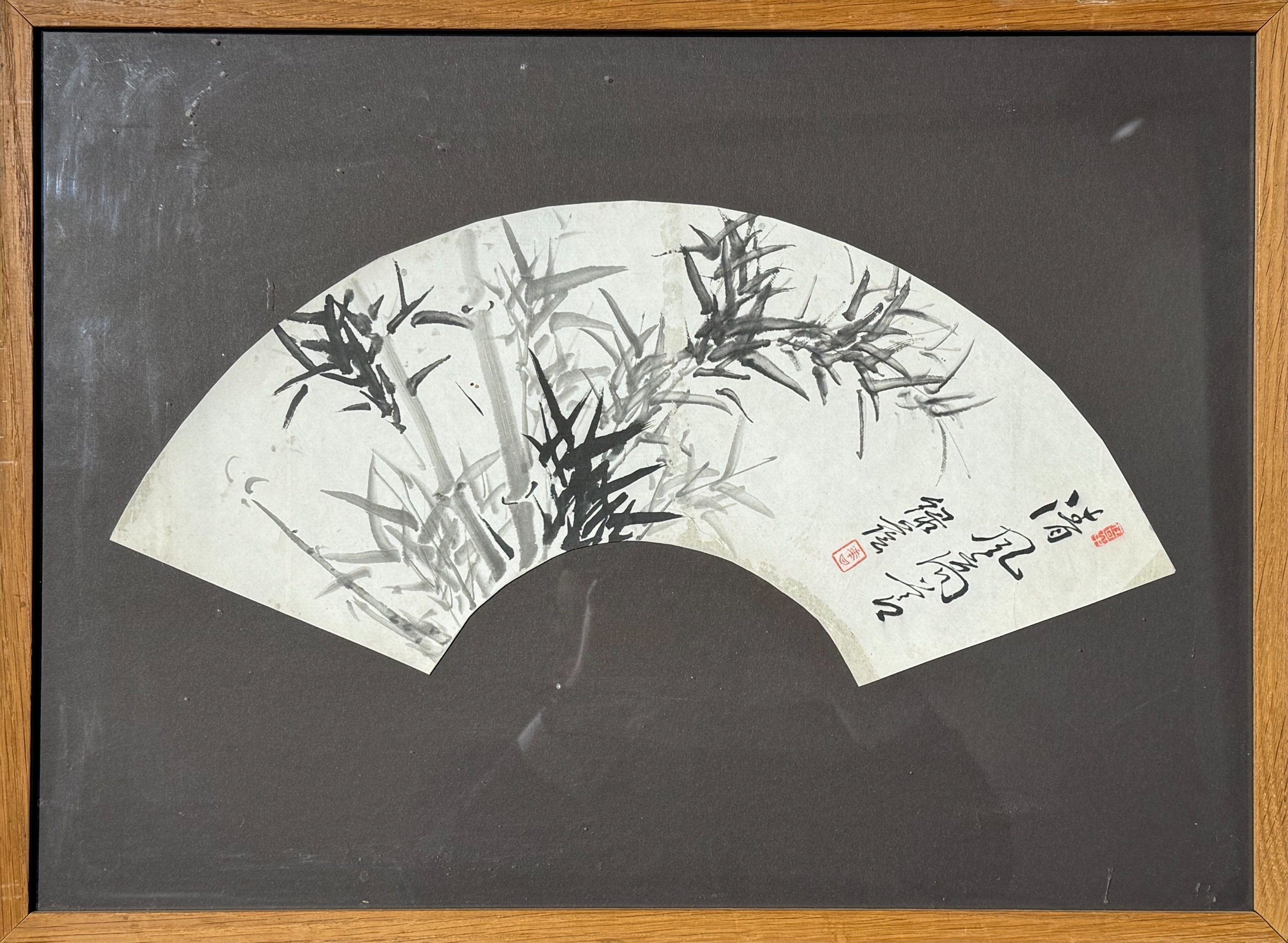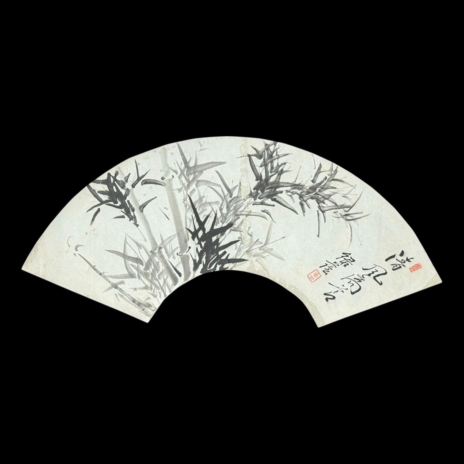 1/Fan design with painted decoration in Indian ink and wash of bamboos and ideograms.