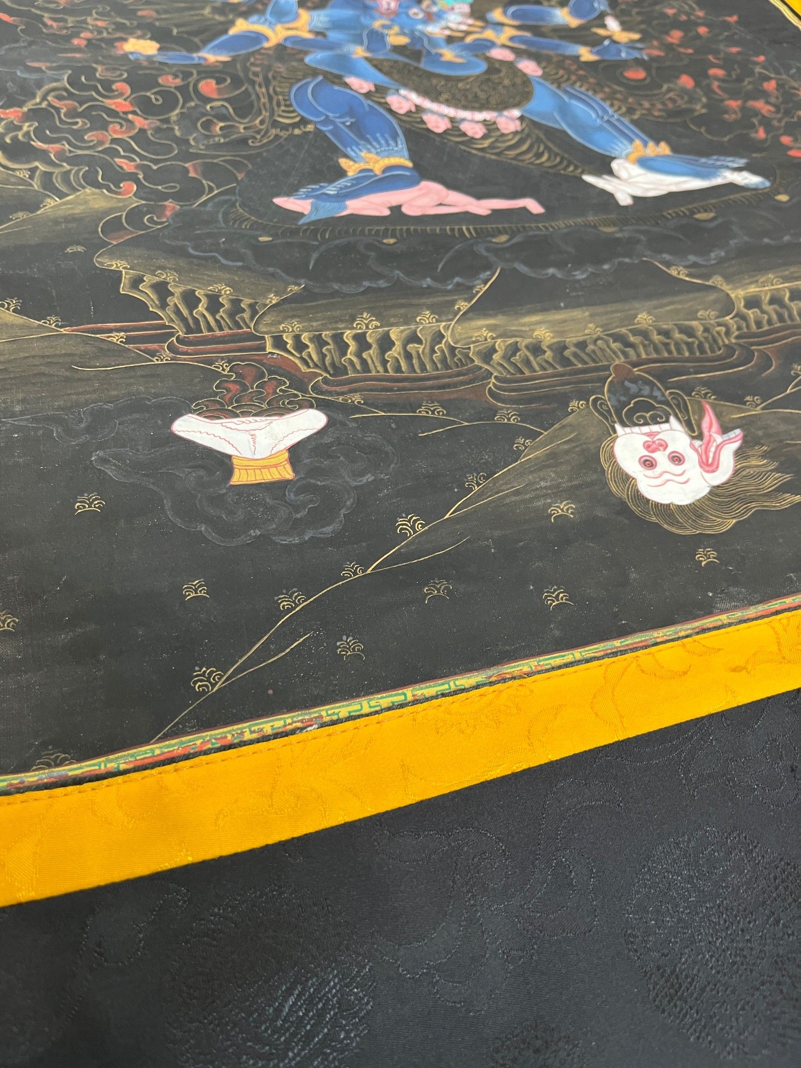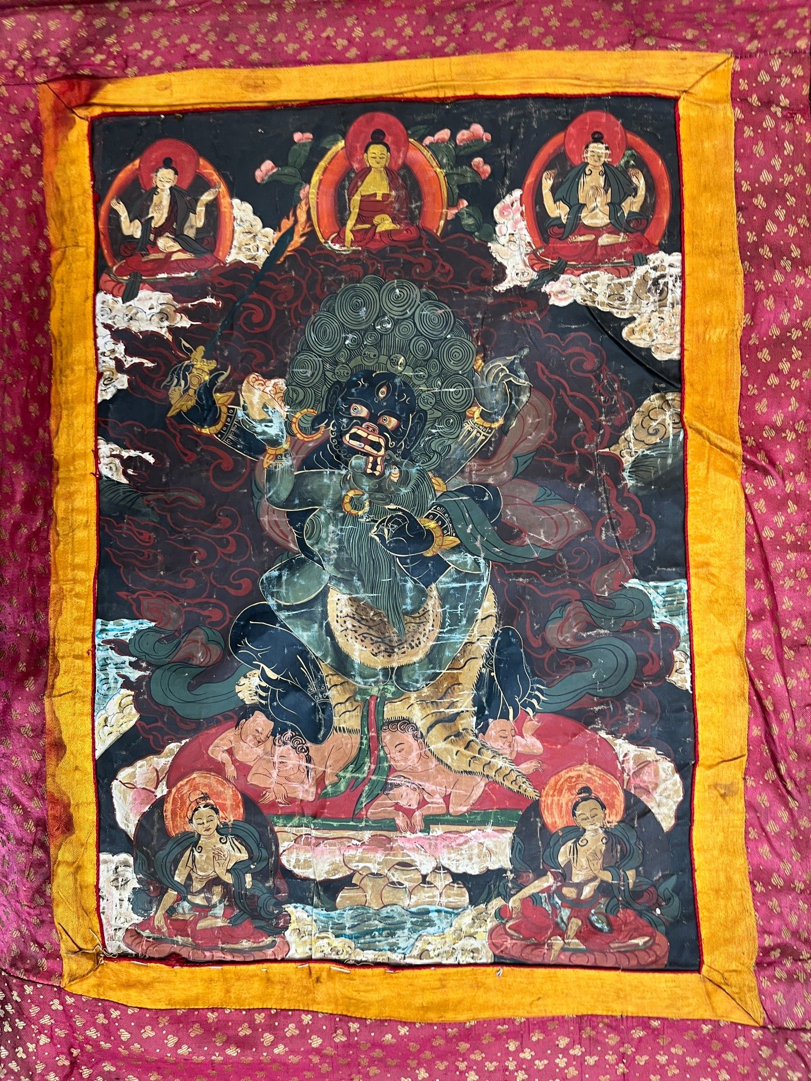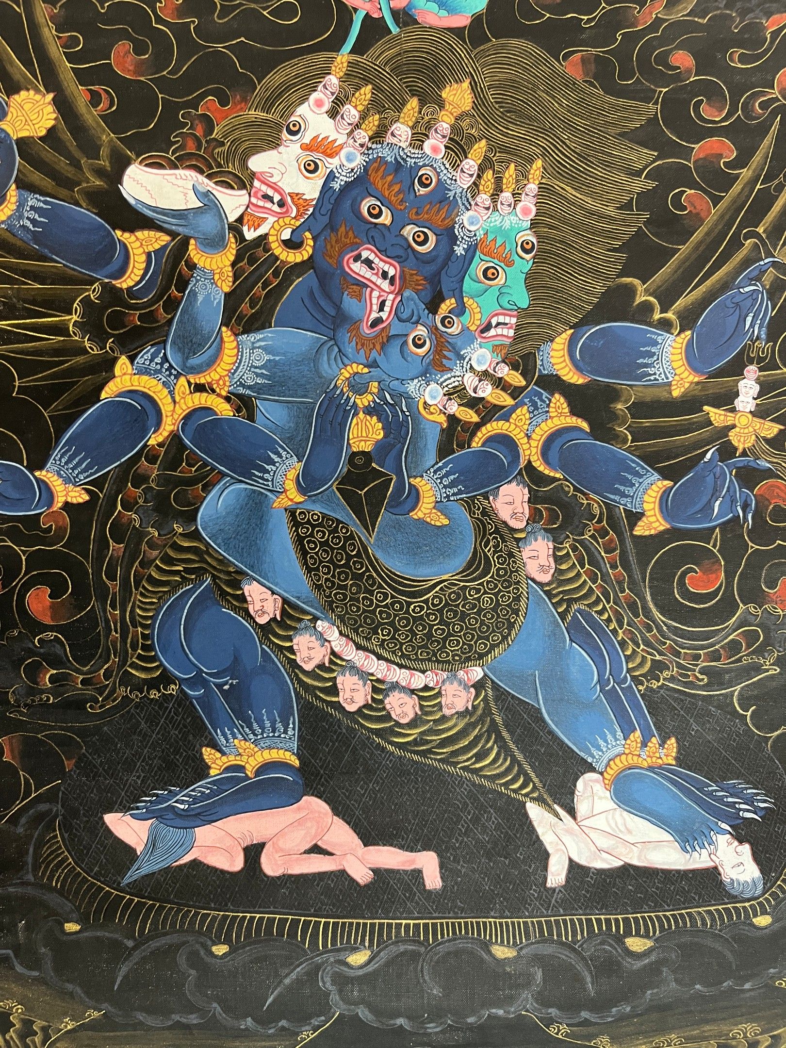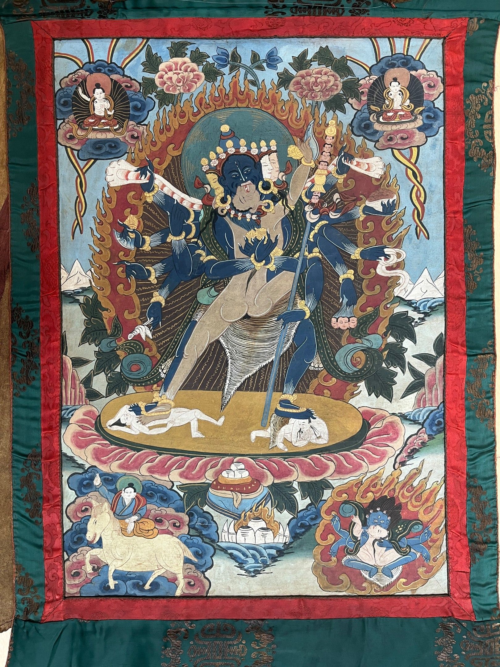 Reunion of three polychrome thangkas with gold highlights on canvas depicting Chakrasamvara Yab-yum, Yama Dharmaraja and another deity in Yab-yum; mounted on a fabric scroll.
