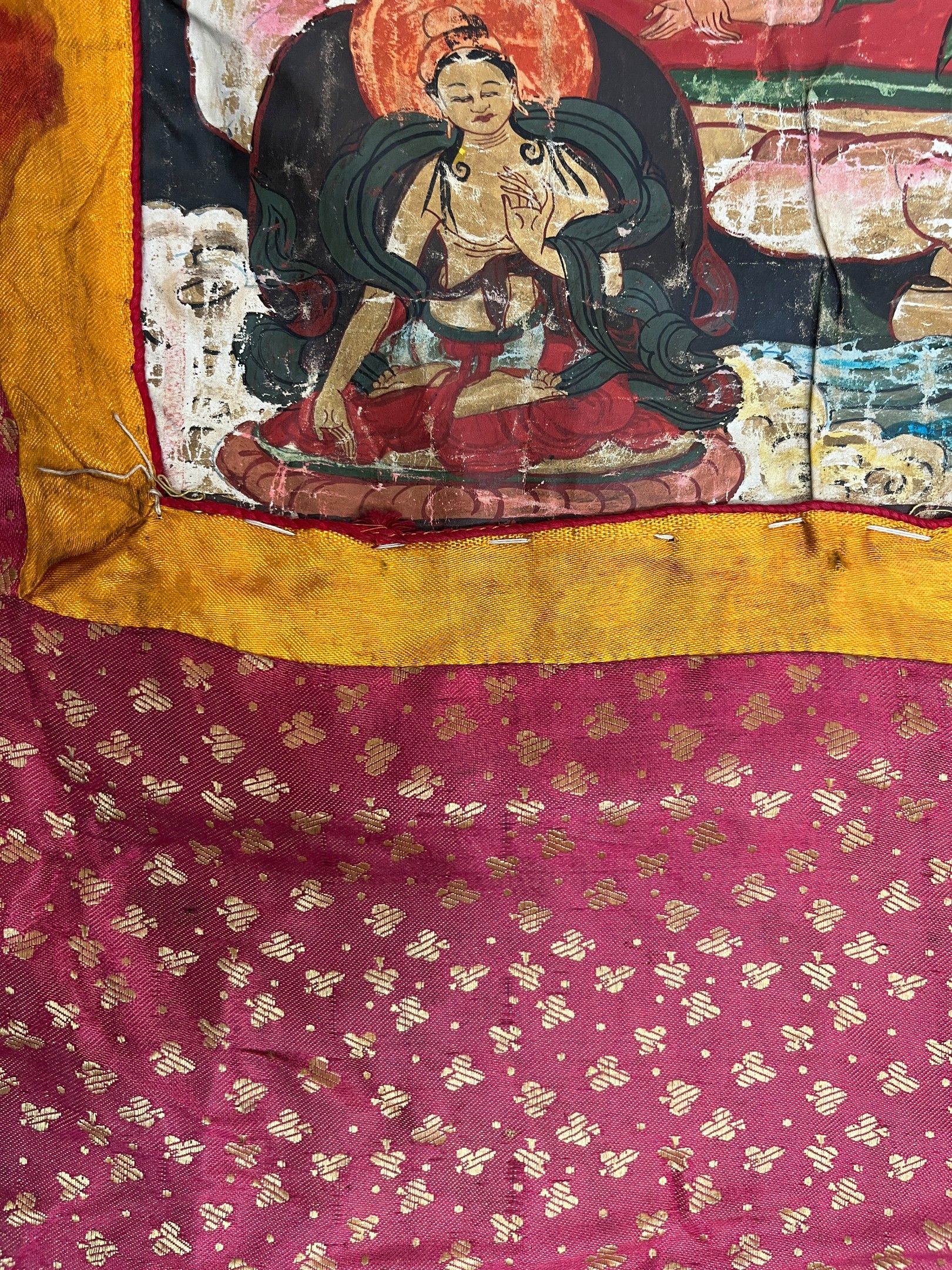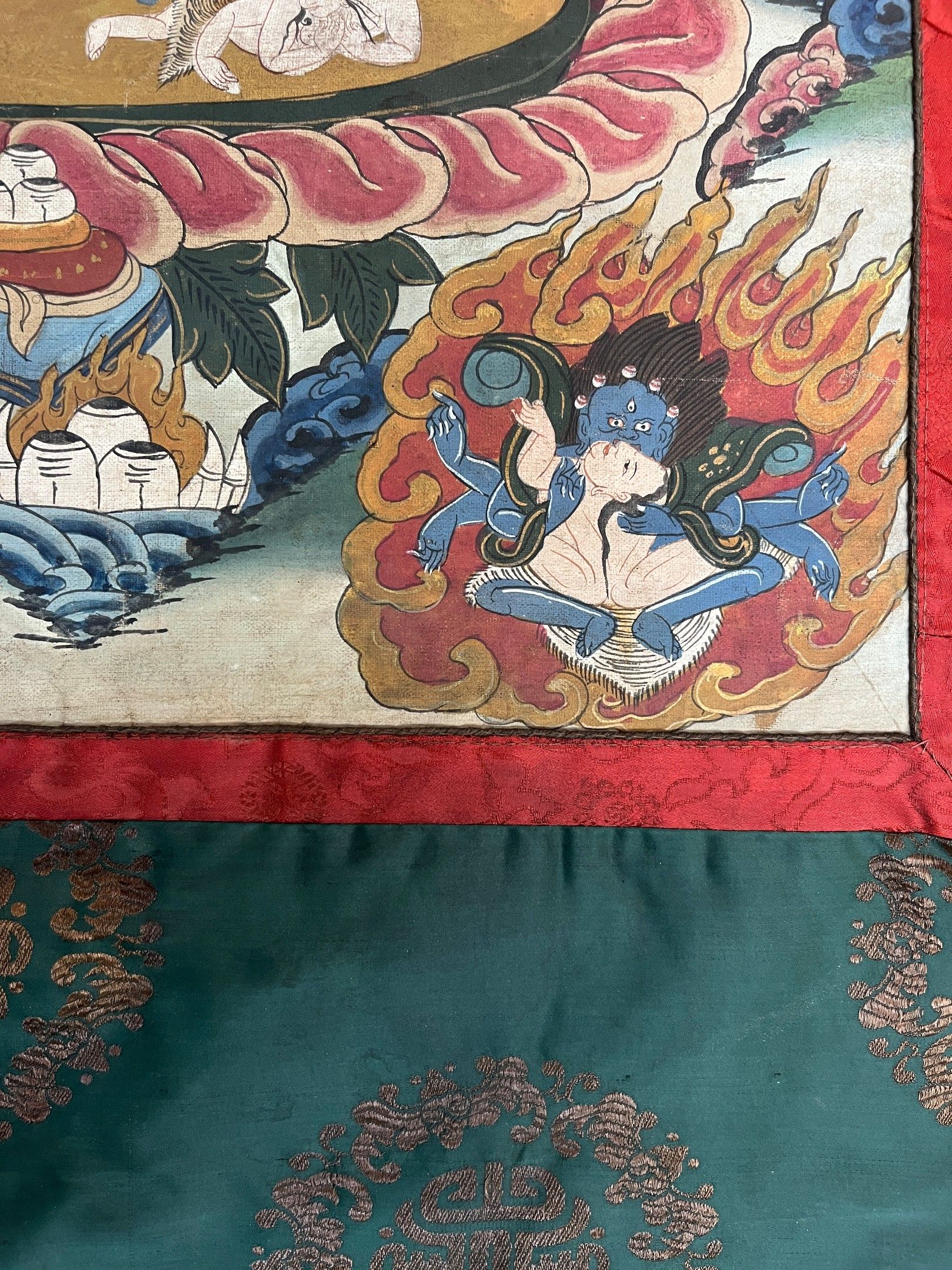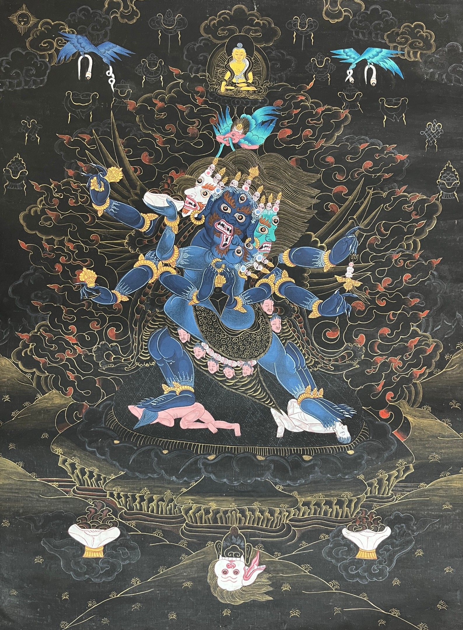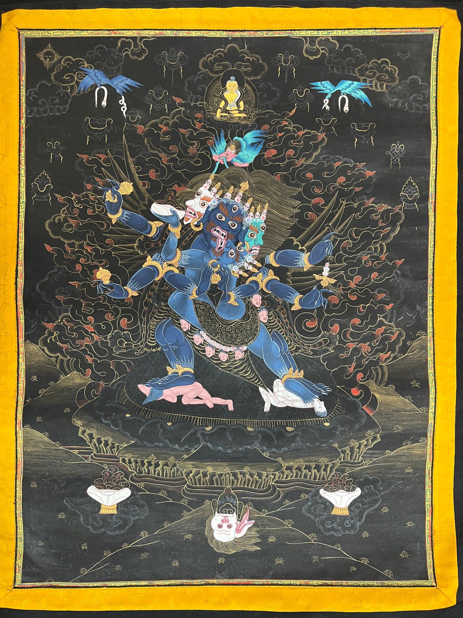 Reunion of three polychrome thangkas with gold highlights on canvas depicting Chakrasamvara Yab-yum, Yama Dharmaraja and another deity in Yab-yum; mounted on a fabric scroll.