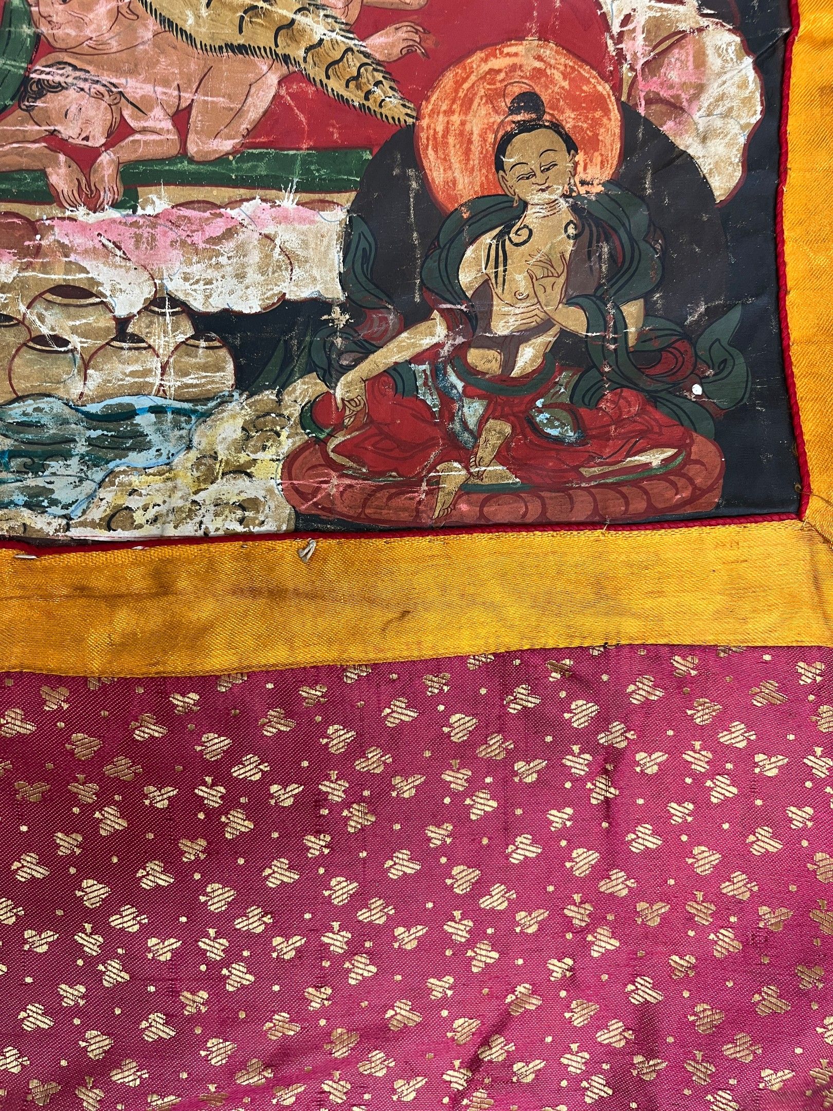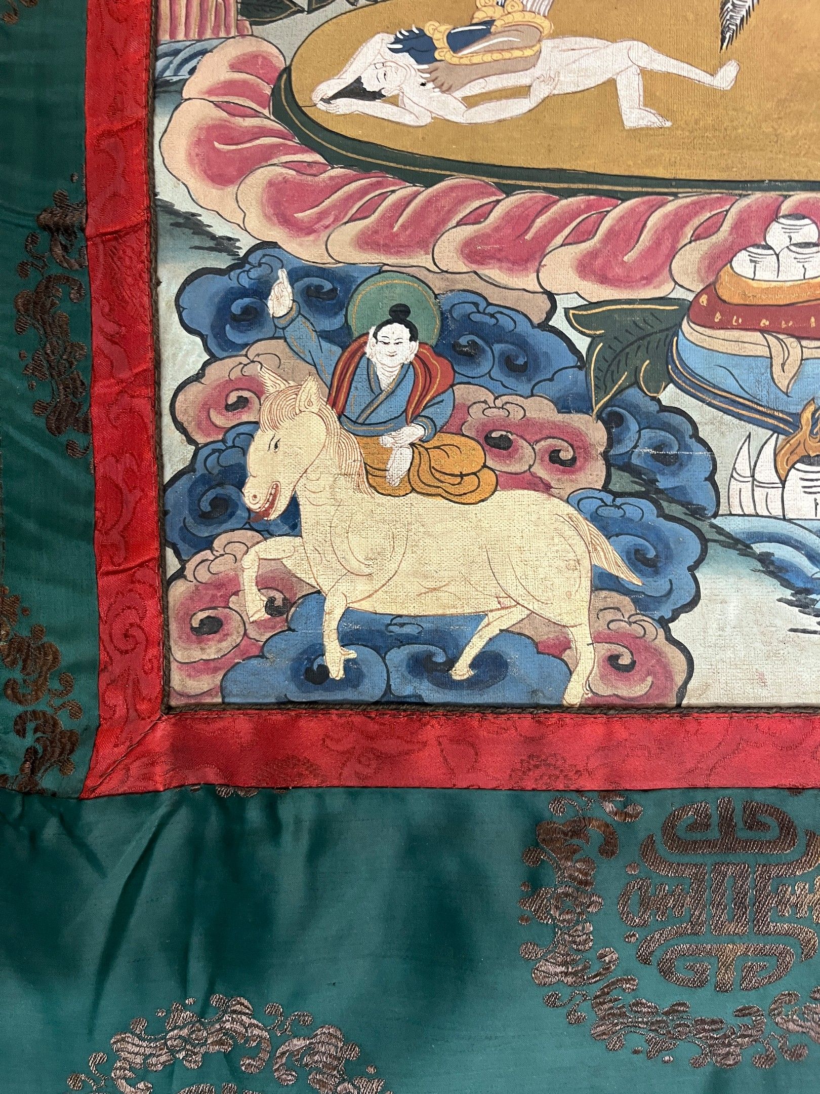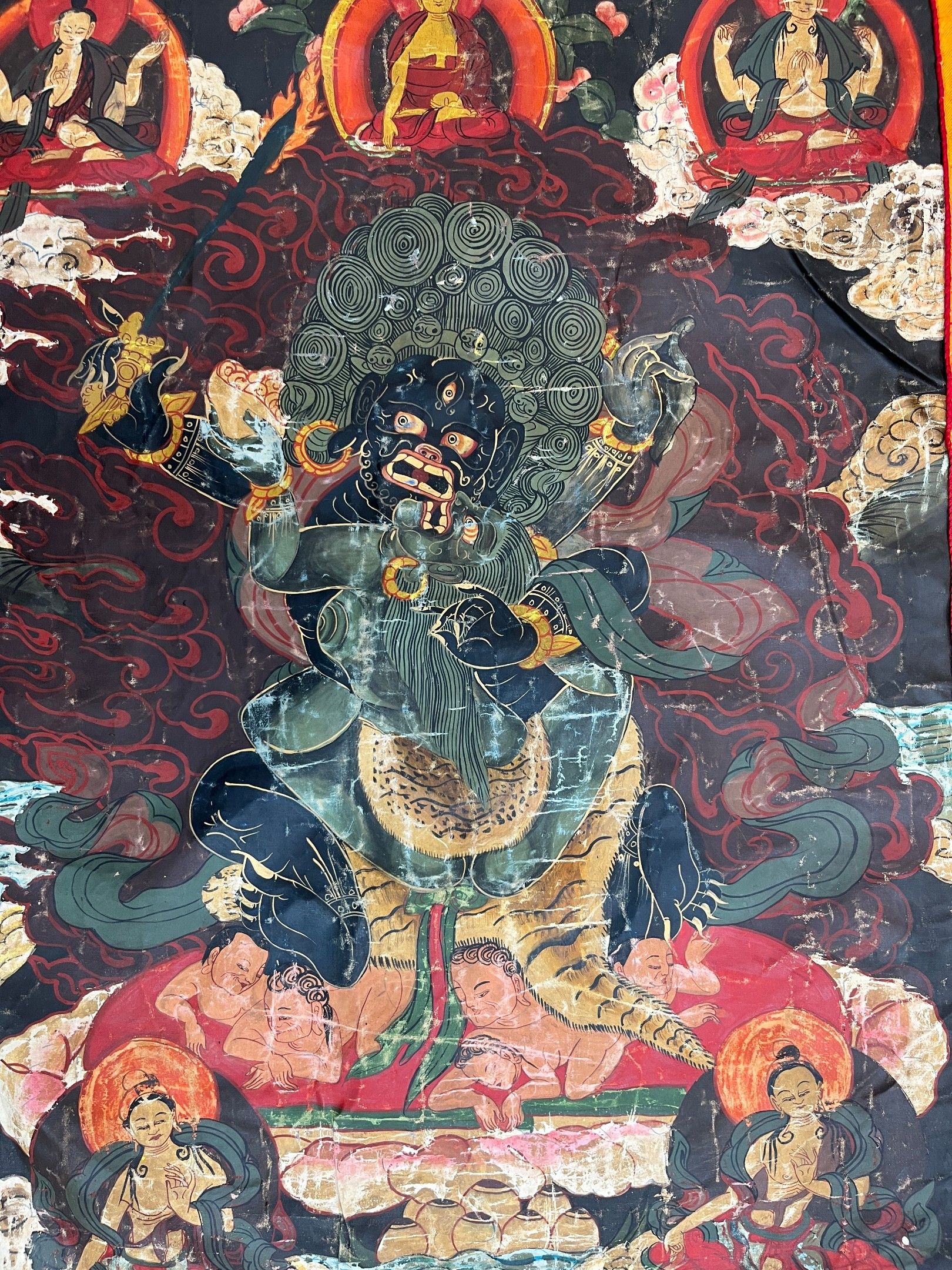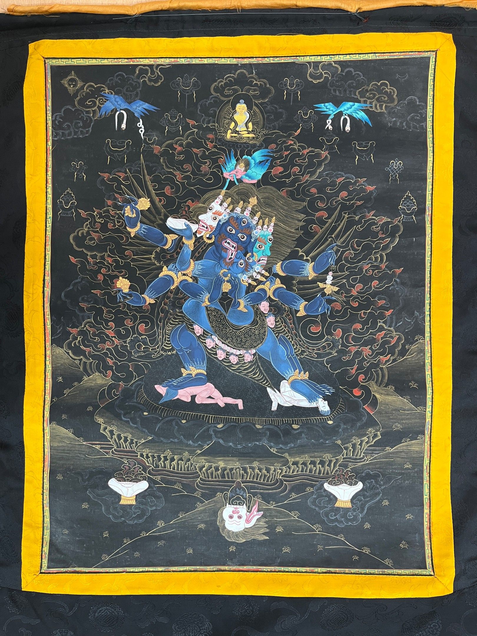 Reunion of three polychrome thangkas with gold highlights on canvas depicting Chakrasamvara Yab-yum, Yama Dharmaraja and another deity in Yab-yum; mounted on a fabric scroll.