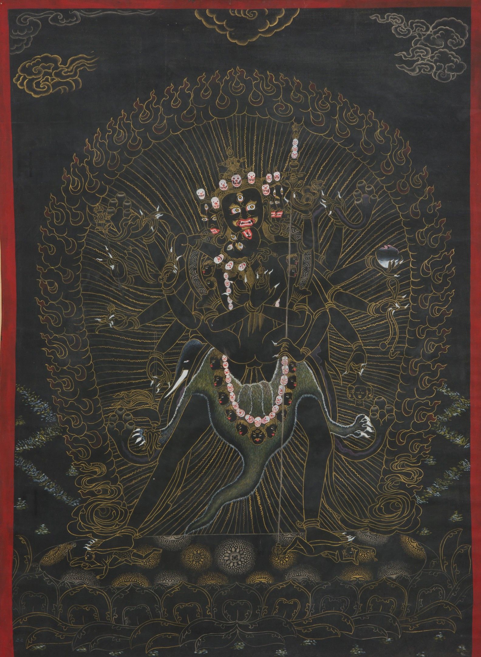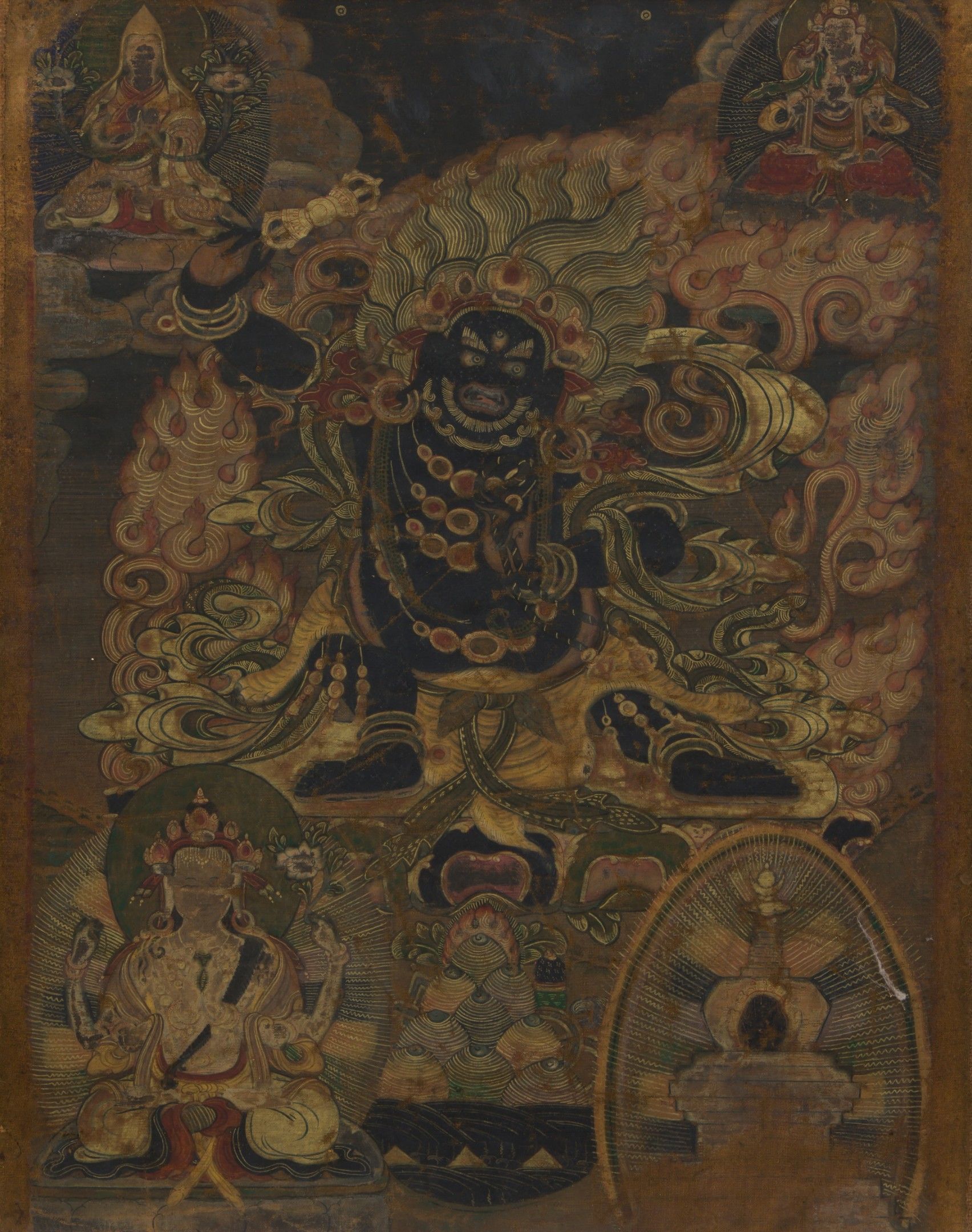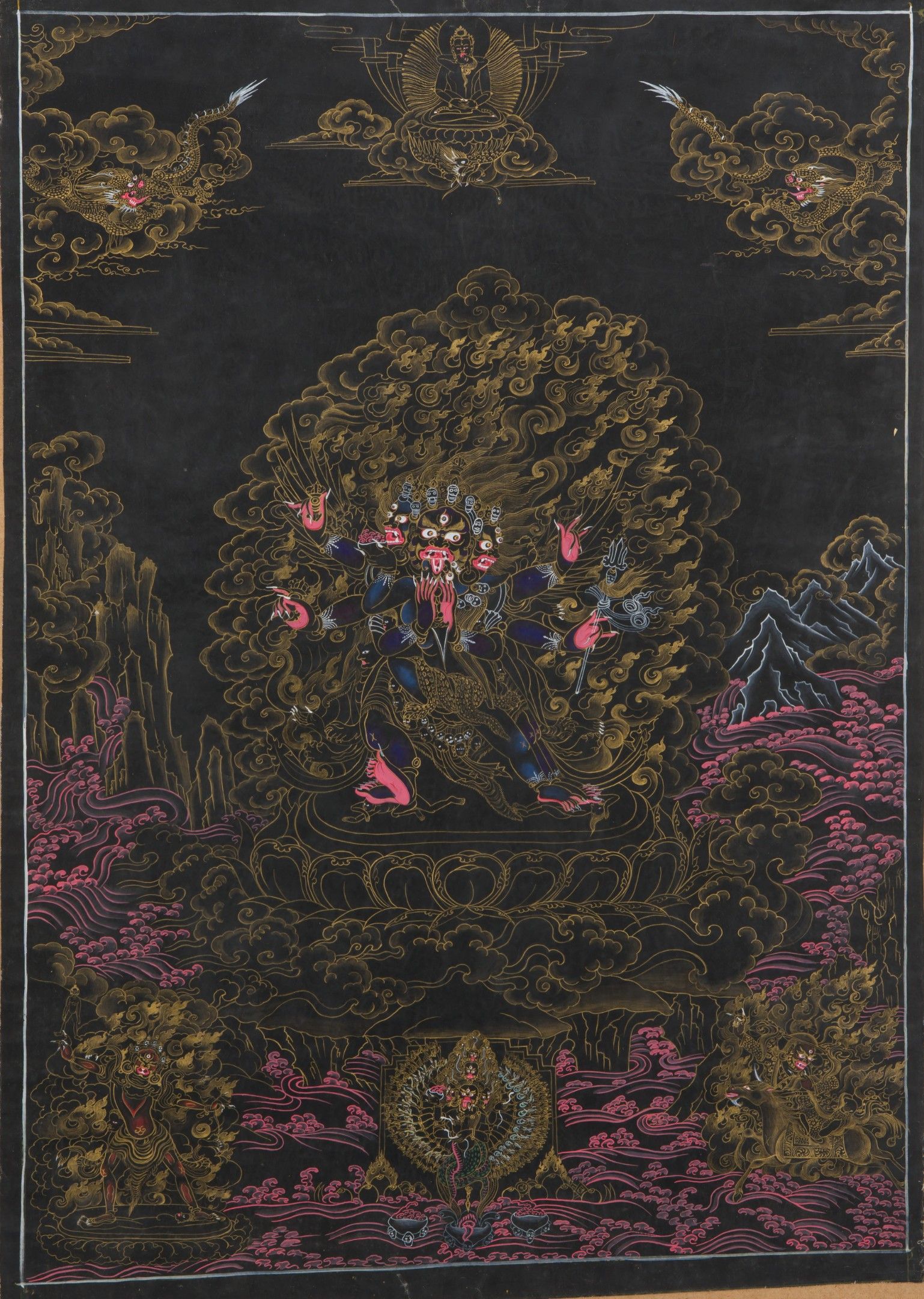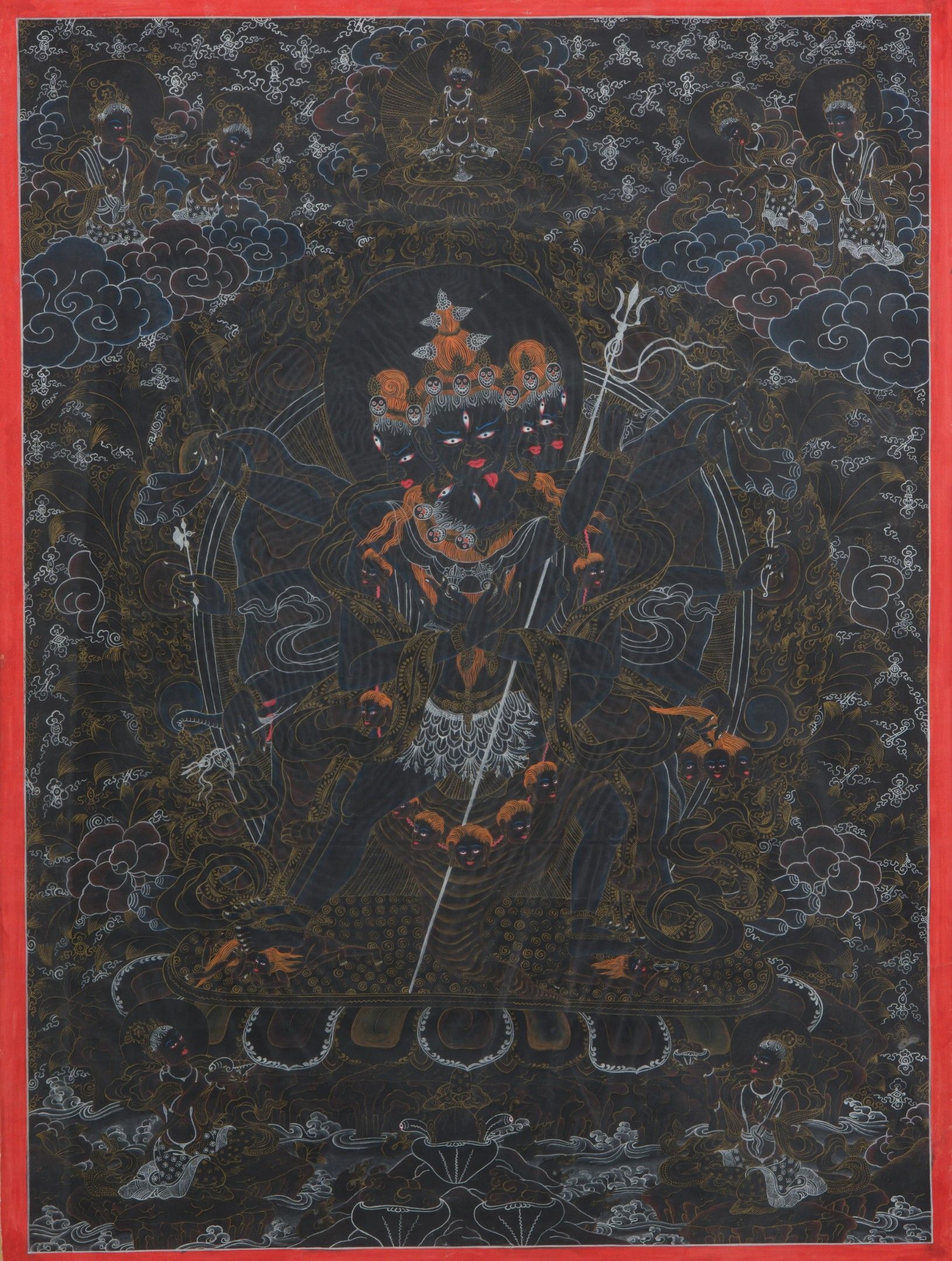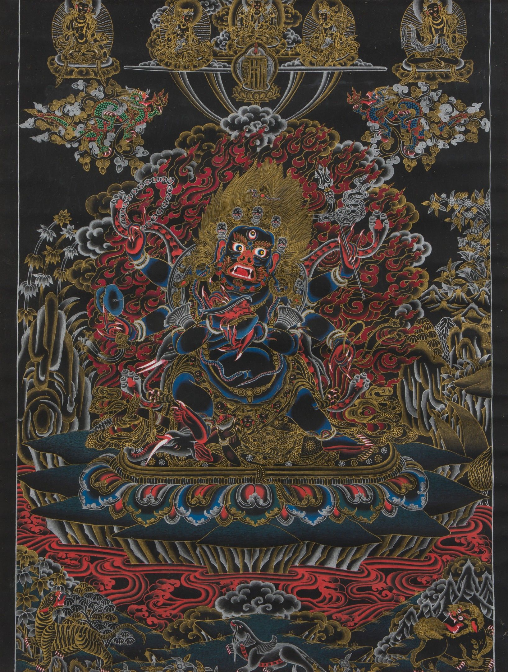 Lot of seven polychrome thangka on canvas.