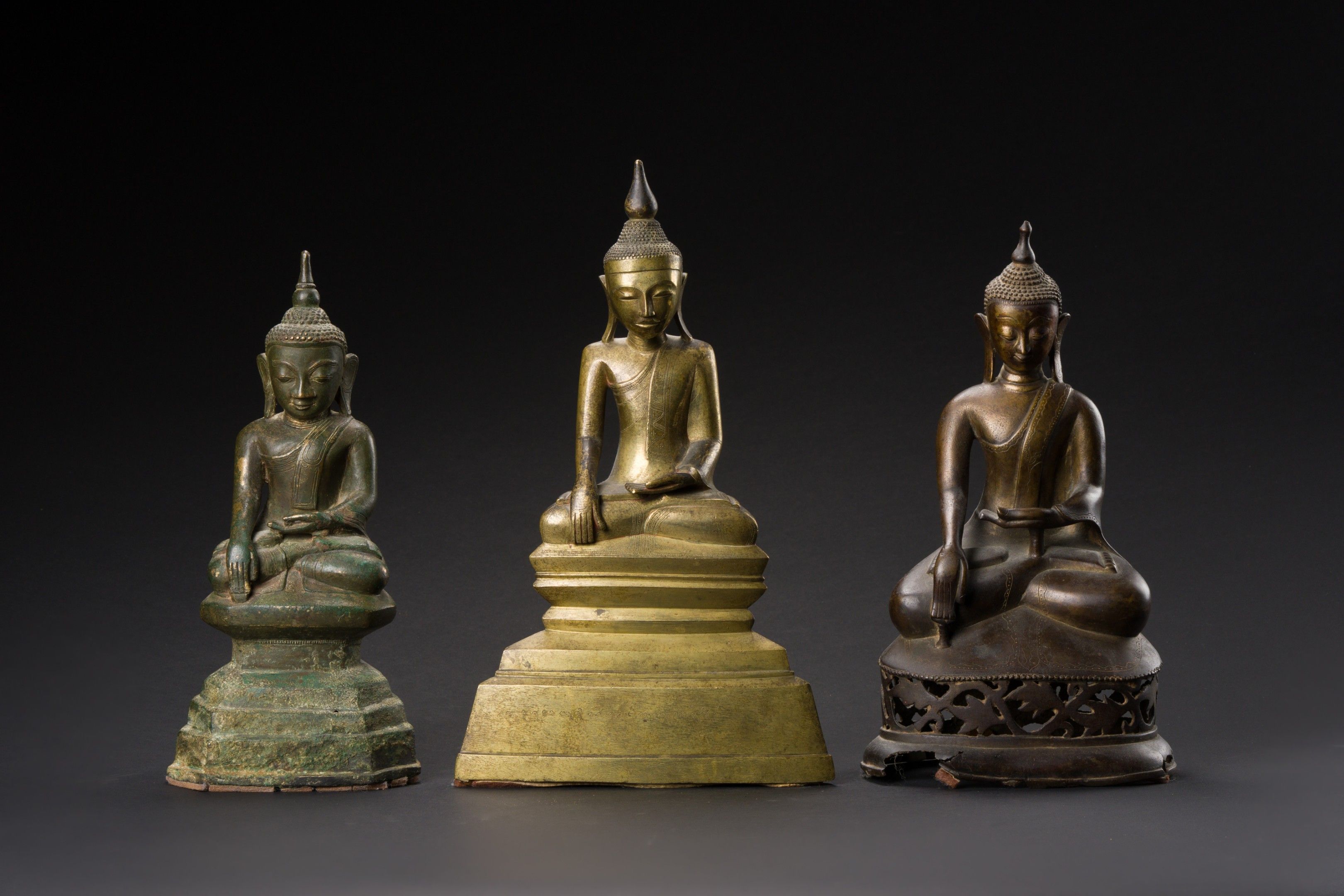Reunion of three bronze Buddha statuettes, hands in bhumisparsa mudra, wearing a sanghati, eyes lowered, eyebrows arched, hair in curls topped with the ushnisha, resting on stepped or openwork bases.