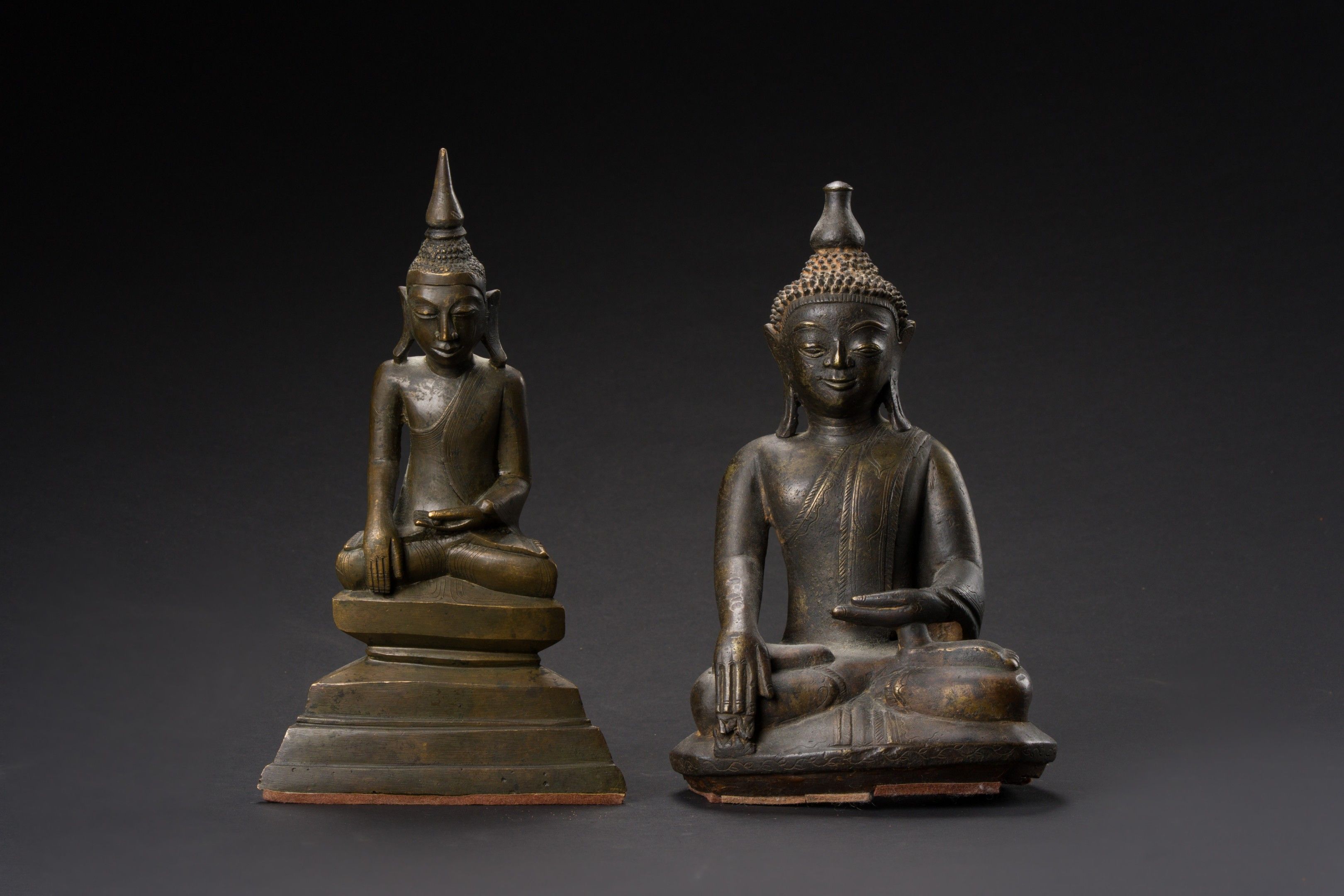 Reunion of two bronze Buddha statuettes, hands in bhumisparsa mudra, wearing a sanghati, eyes lowered, eyebrows arched.