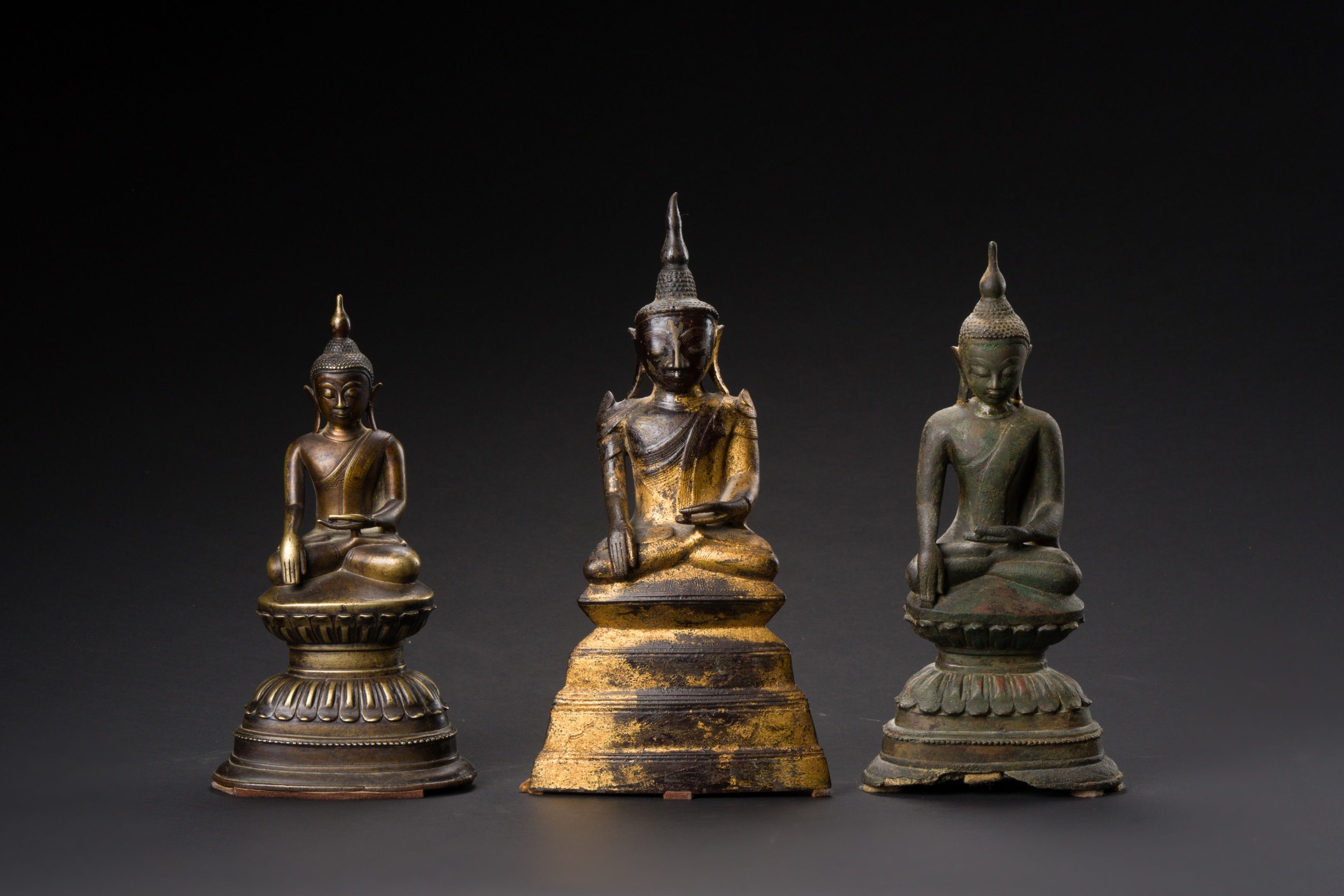 Reunion of three bronze Buddha statuettes, hands in bhumisparsa mudra, wearing a sanghati, eyes lowered, eyebrows arched, resting on stepped or lotiform bases. Burma, mid 20th century H_25 to 30 cm (one base missing, one head broken)