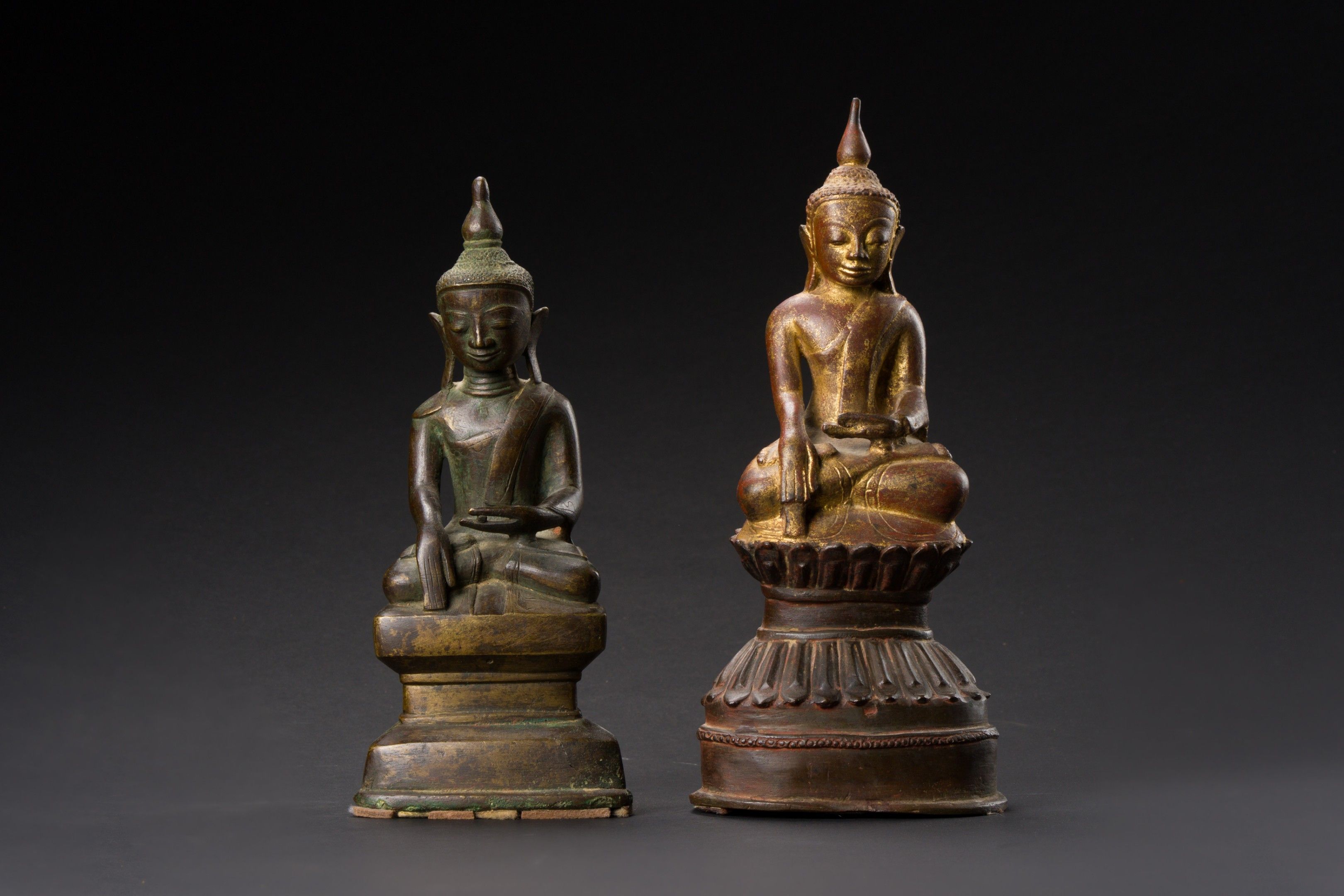 Reunion of two bronze Buddha statuettes, hands in bhumispars…