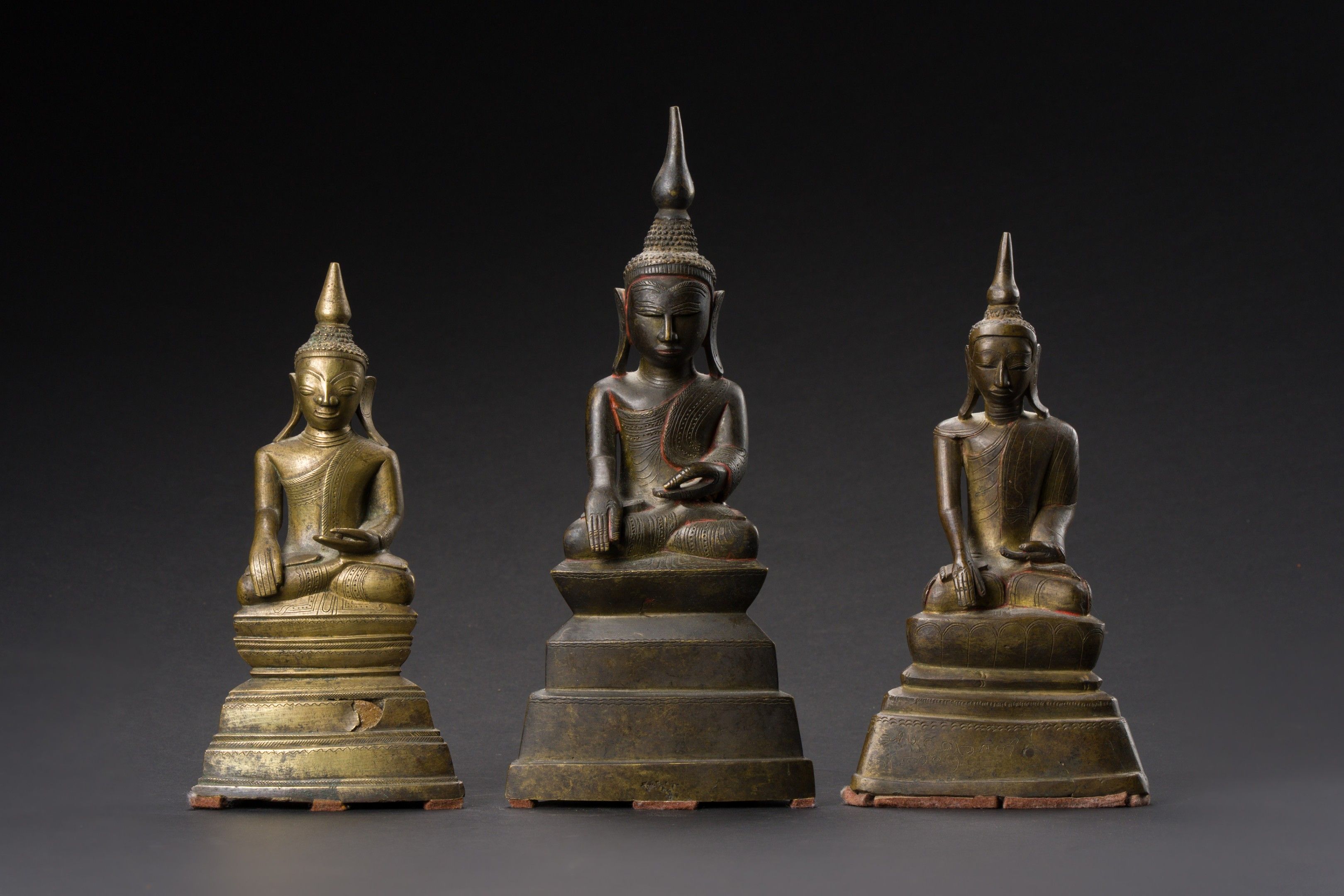 Reunion of three bronze Buddha statuettes, hands in bhumispa…