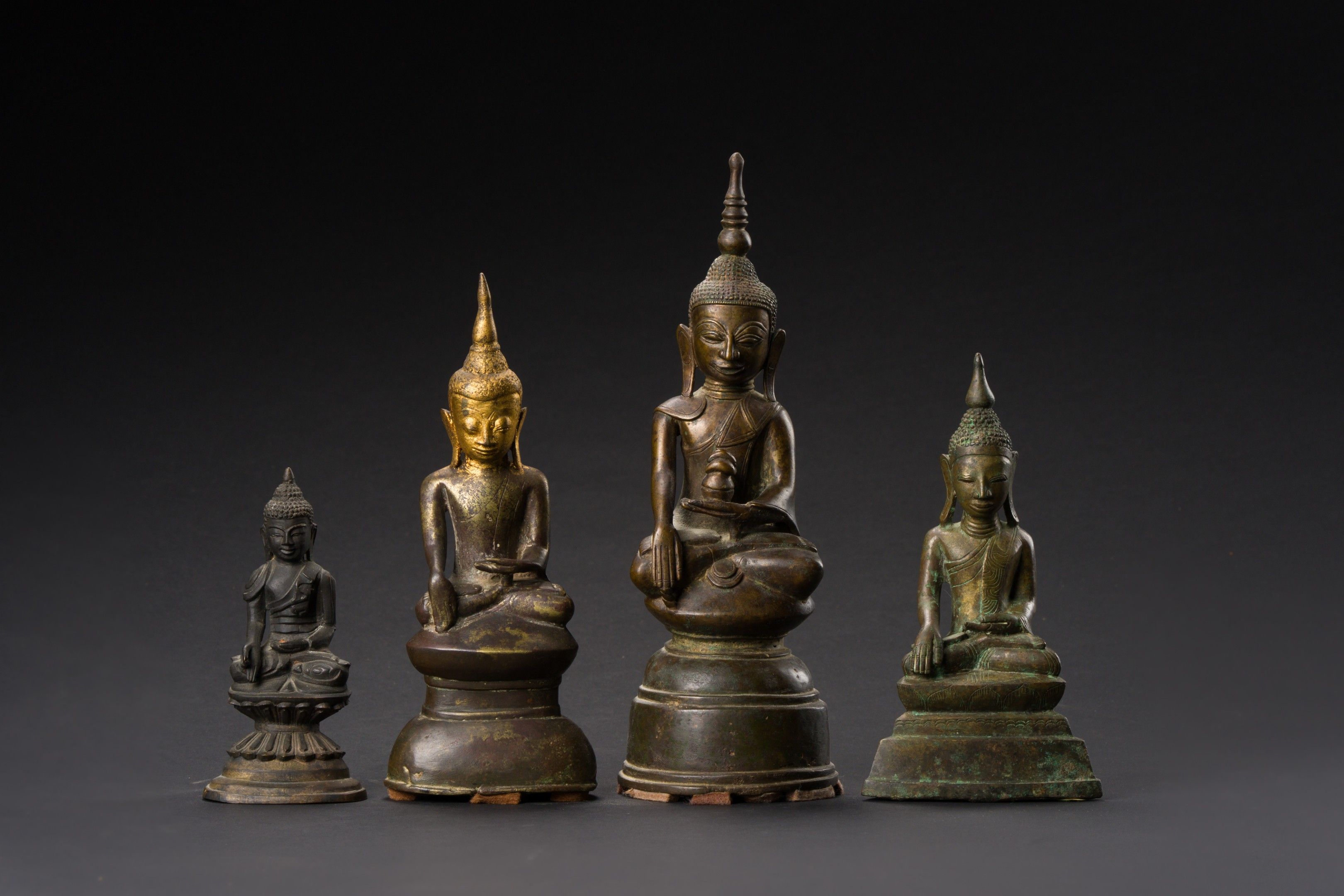 Reunion of four bronze Buddha statuettes, hands in bhumispar…