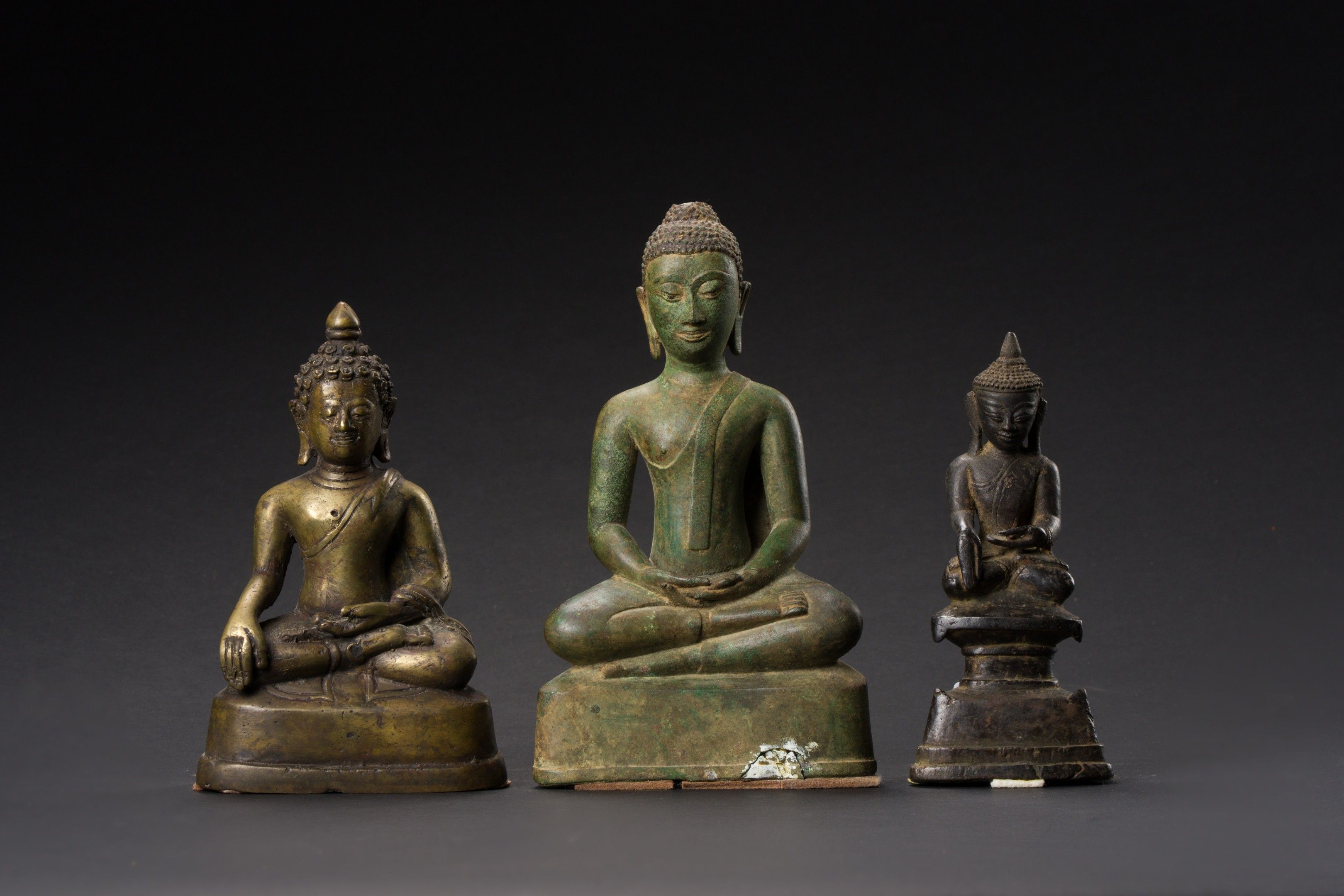 Reunion of three bronze seated Buddha statuettes.