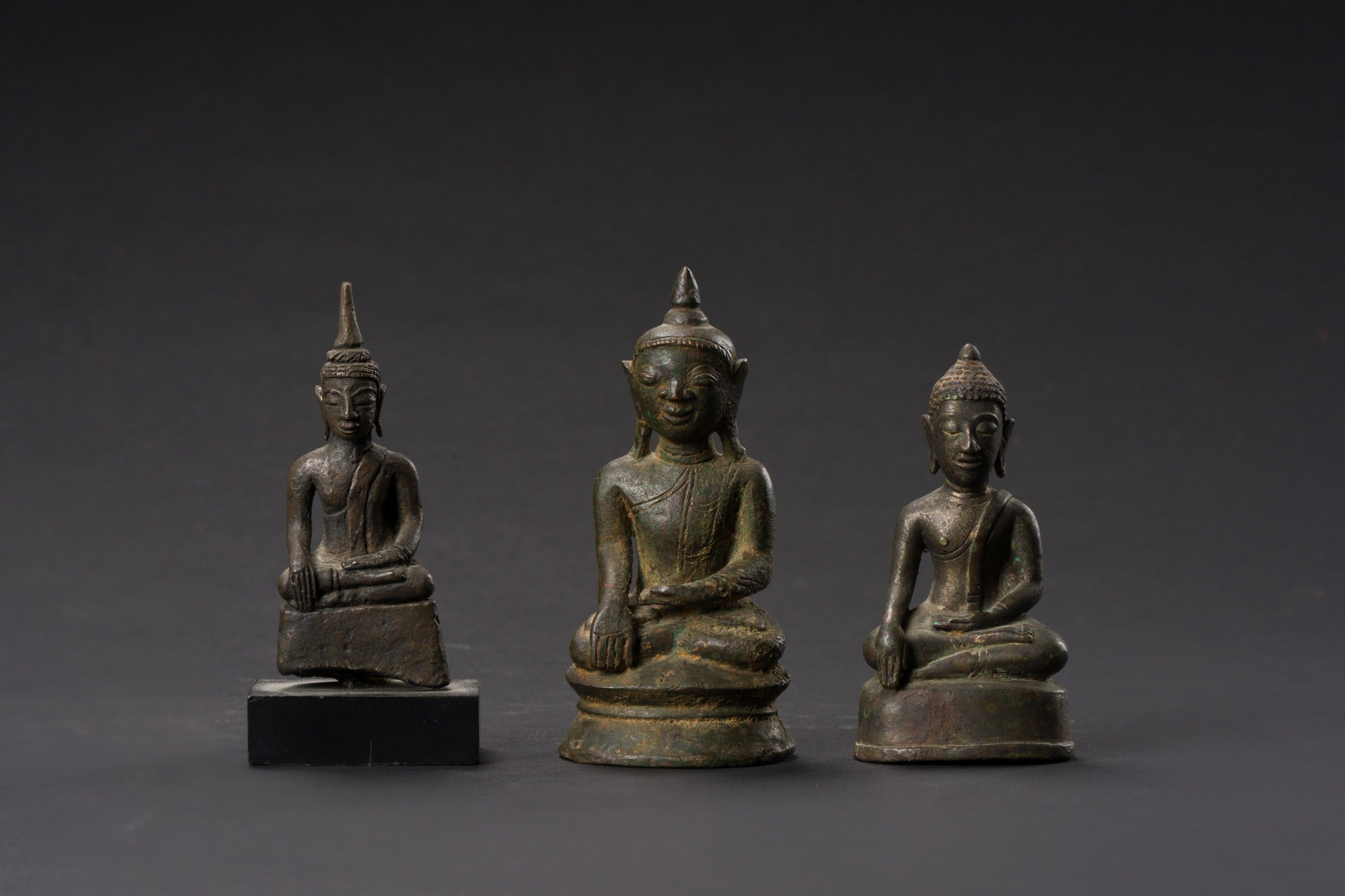Reunion of three bronze Buddha statuettes, hands in bhumisparsa mudra, wearing a sanghati, eyes lowered.